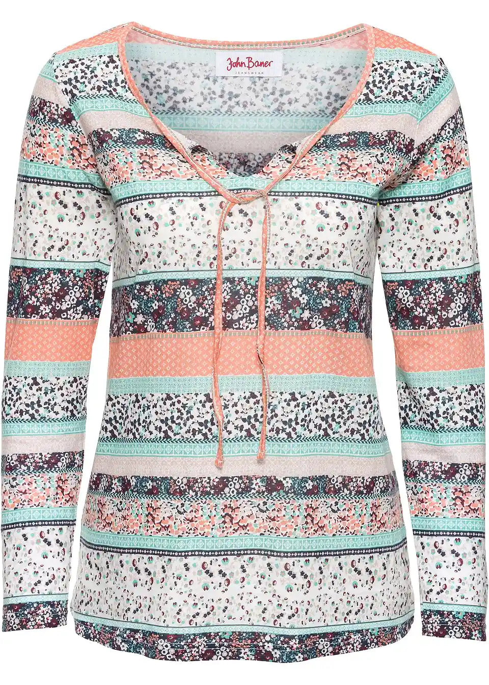 Die schöne Langarm-Shirttunika der Marke John Baner präsentiert sich als modernes Outfit in bequemer Passform. Der lockere Schnitt mit langen Ärmeln und die weiche Material-Qualität machen das Shirt besonders angenehm zu tragen. Trendstarkes Detail ist der Rundhals-Ausschnitt mit V-Schlitz, der von schmalen Bändchen eingerahmt wird.Die hübsch bedruckte Shirttunika sorgt kombiniert mit einer Jeans und Stiefeletten für einen fabelhaften Freizeit-Look.