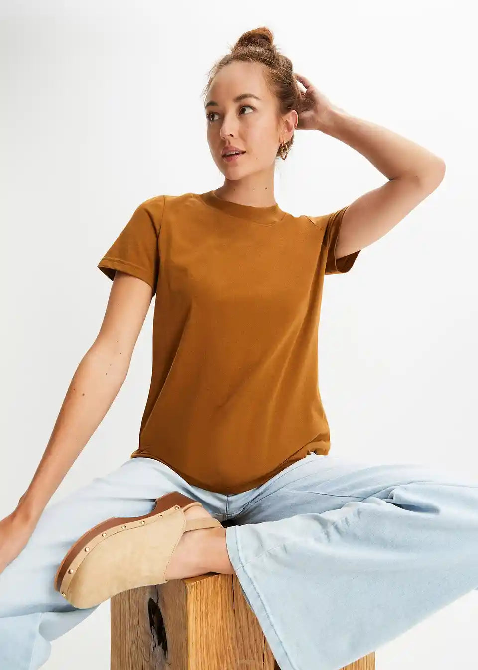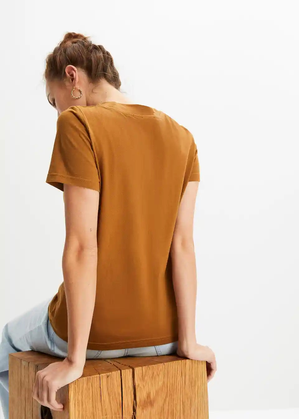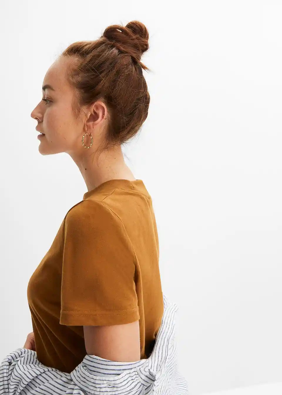 Material gut, Schnitt gut, Farbe cognac : naja Das T-Shirt wäre an und für sich sehr schön, allerdings hat die Farbe cognac einen leichten Grünstich, die Gesichtsfarbe wirkte hierbei kränklich weswegen das Shirt zurück ging. Jemand anderem steht die Farbe