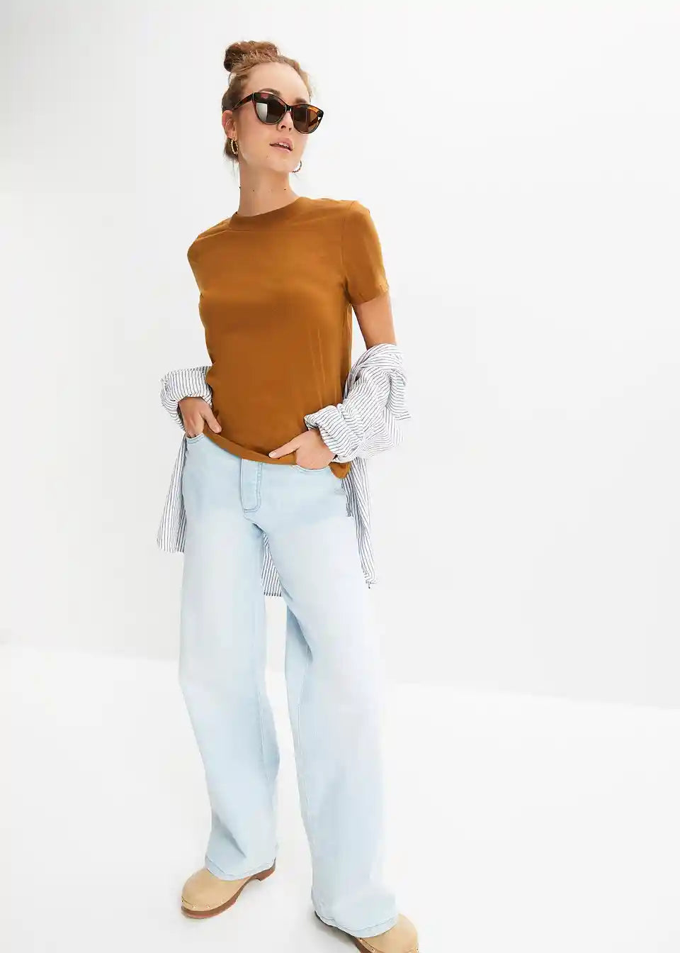 Das Shirt hat einen wunderschönen cognac Ton, ich habe es eine Nummer größer bestellt um es legere zu tragen. Das Material ist schön fest gewebt und passt zu meinem neuen Stiefel. Ich denke das Shirt wird mich lange erfreuen.