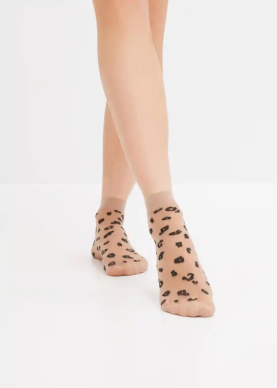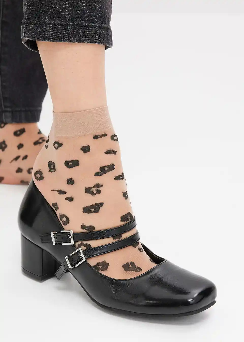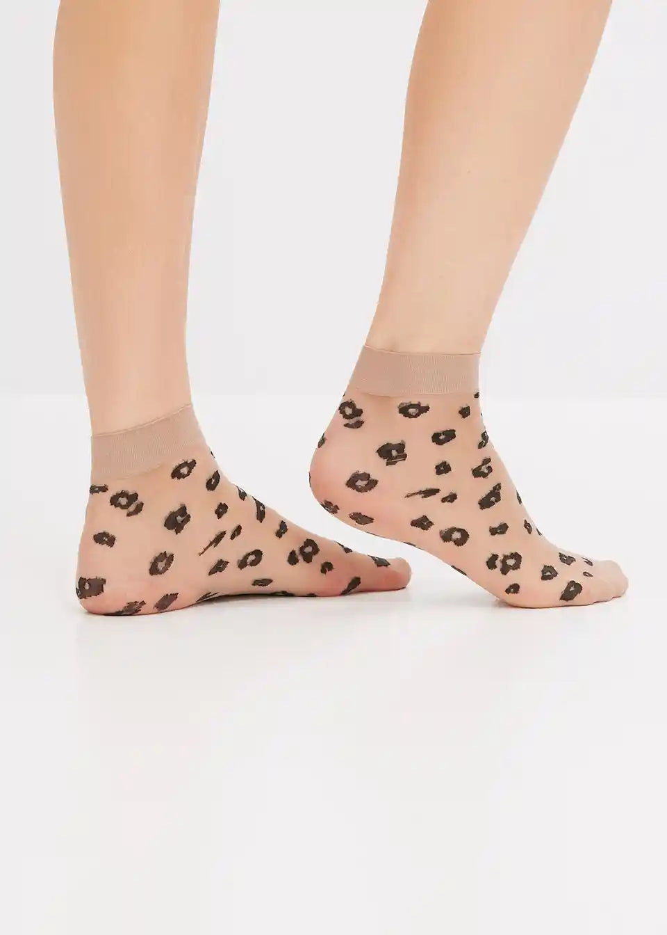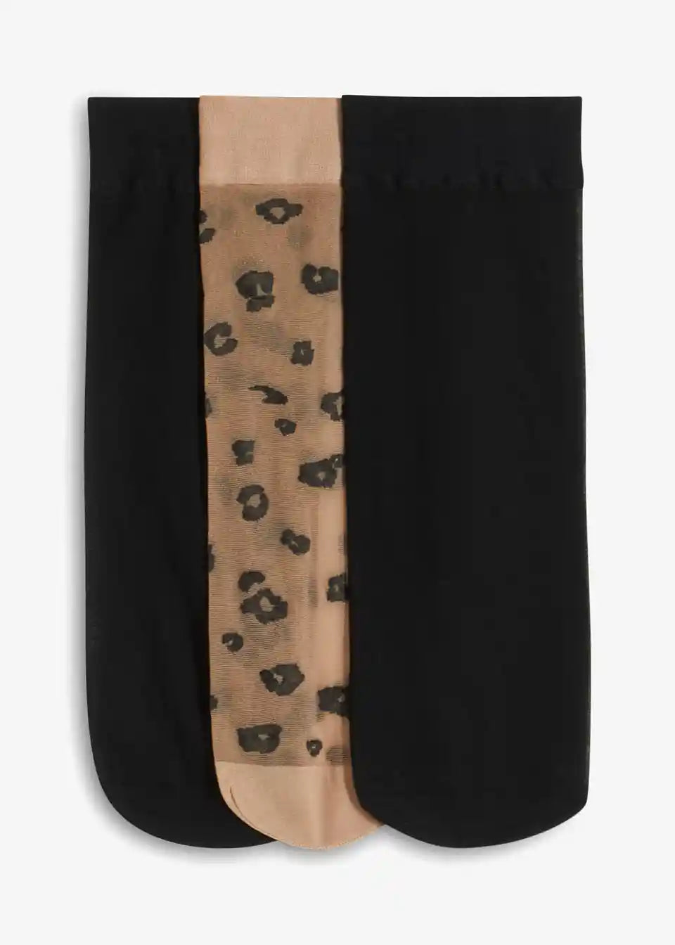Feinstrumpfsocken im 3er-Pack mit Leo-Print und uni schwarz