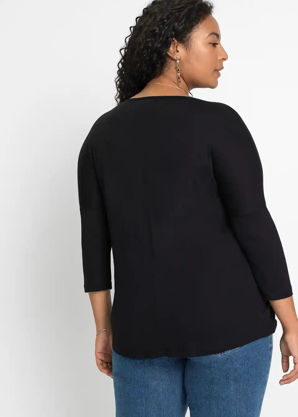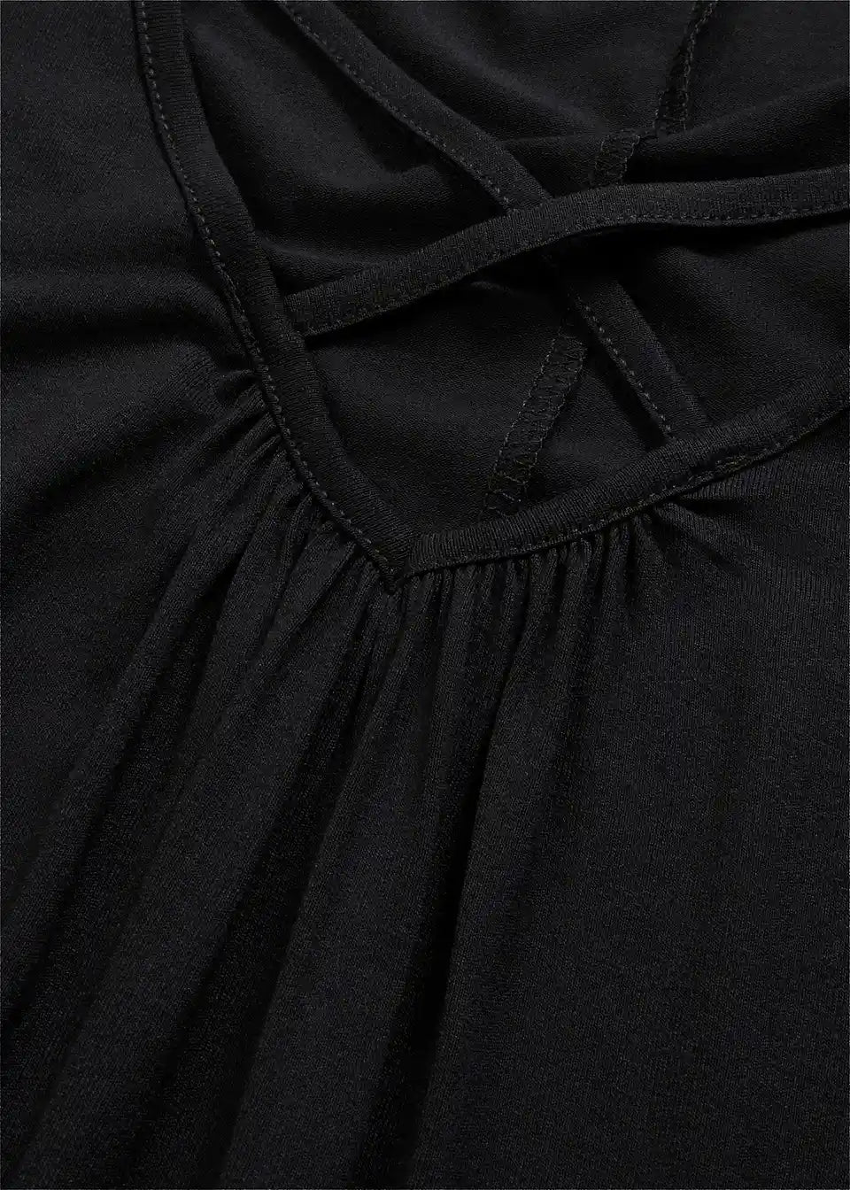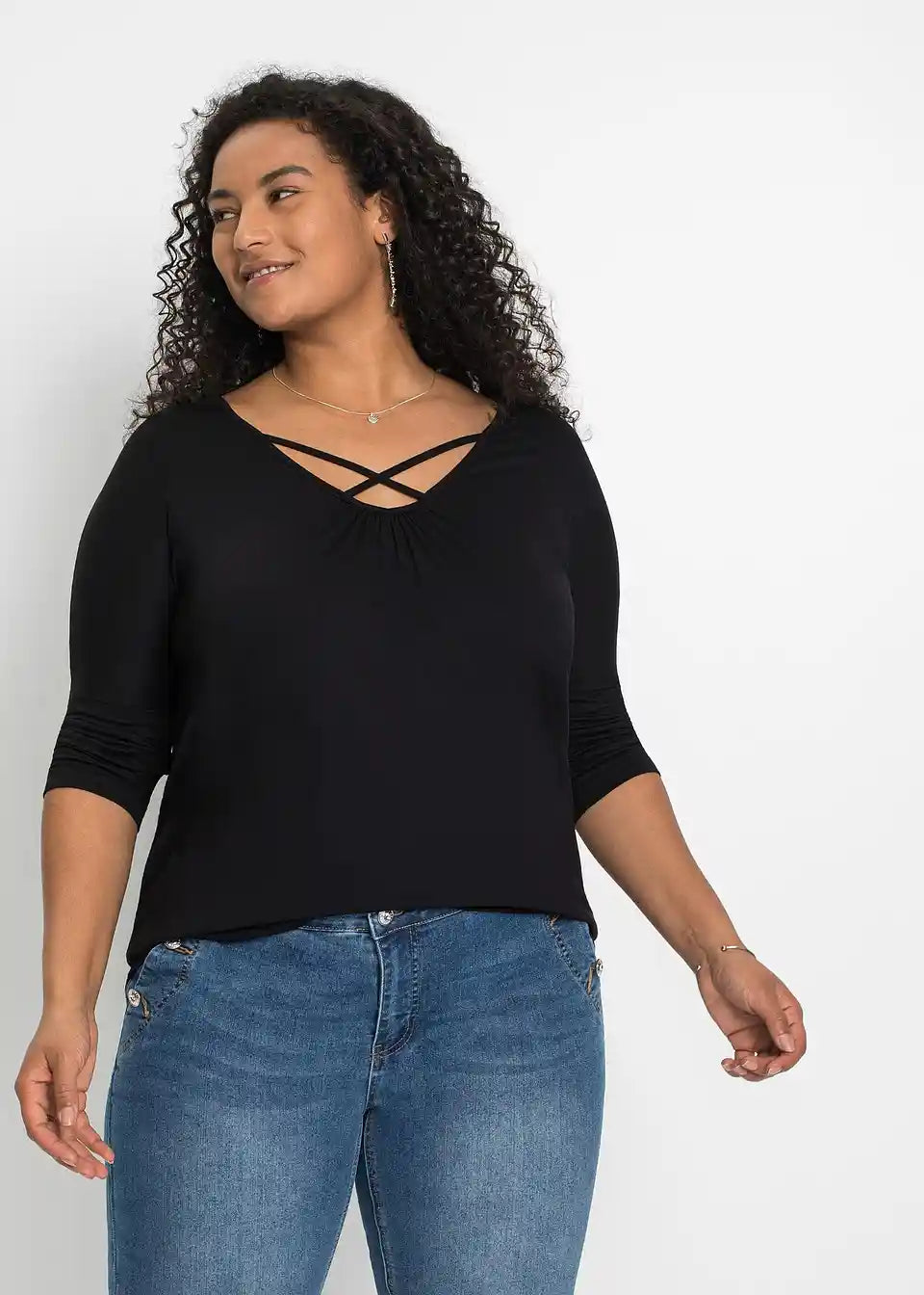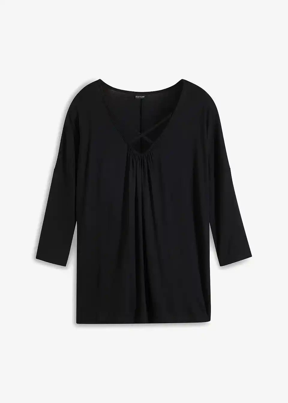 Passformvorteile:betont das Dekolleté, hüftbedeckend, mehr Komfort durch Stretch, streckender V-Ausschnitt