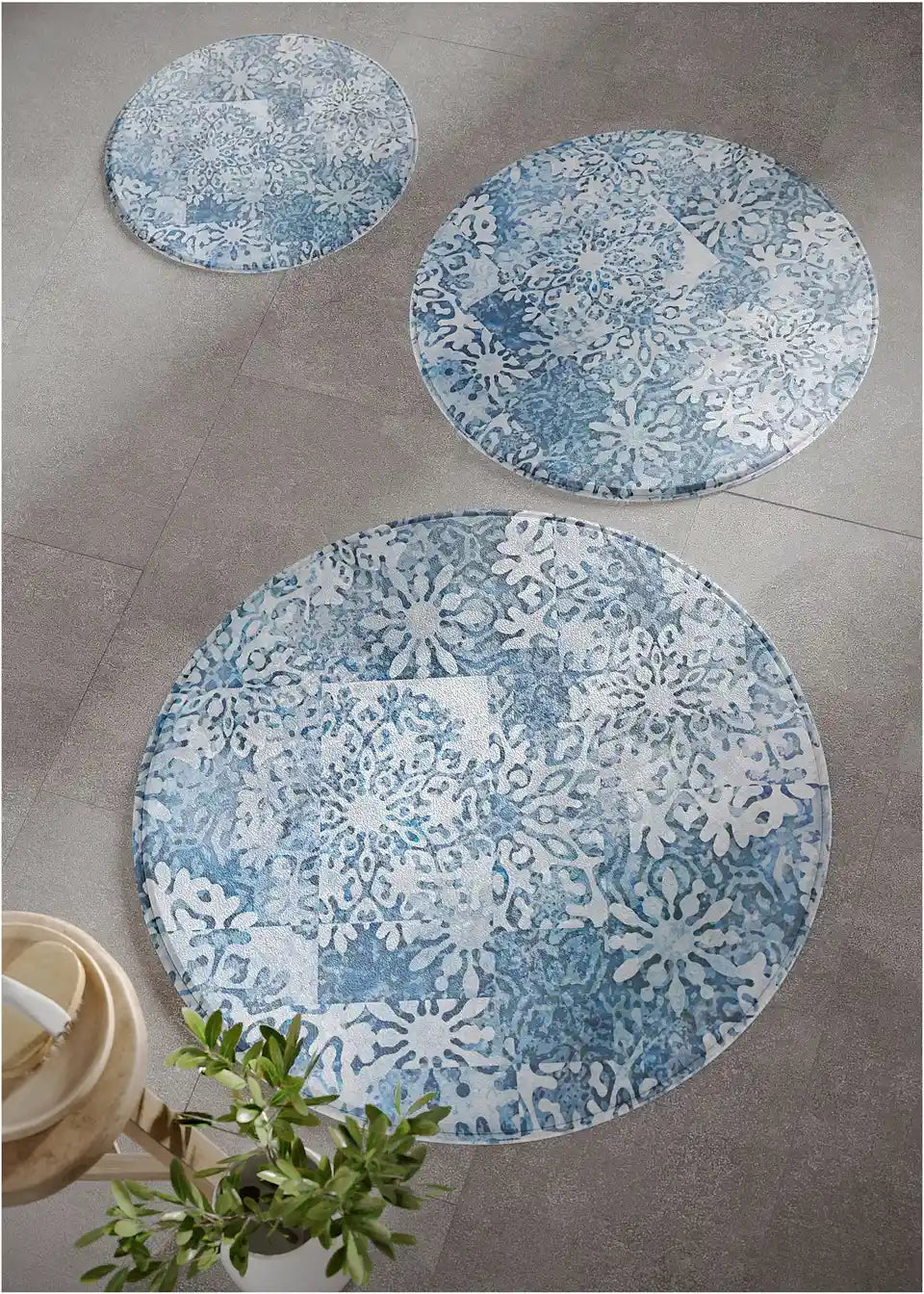 Bedruckte Badgarnitur in runder Form, super weich, extrem saugfähig, Rückseite rutschhemmend, waschbar 40°, alle Maße sind ca. Angaben.