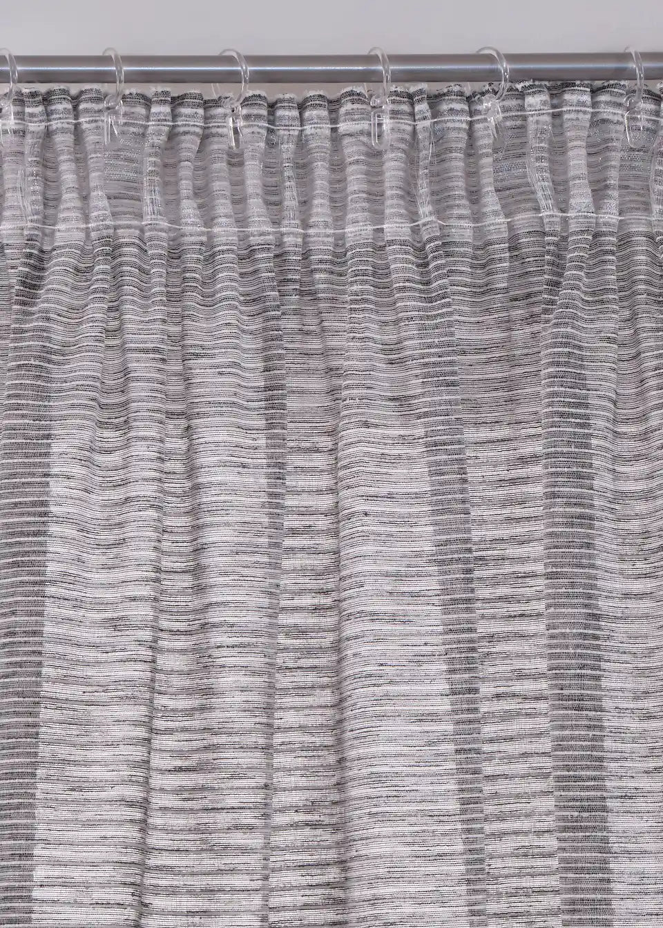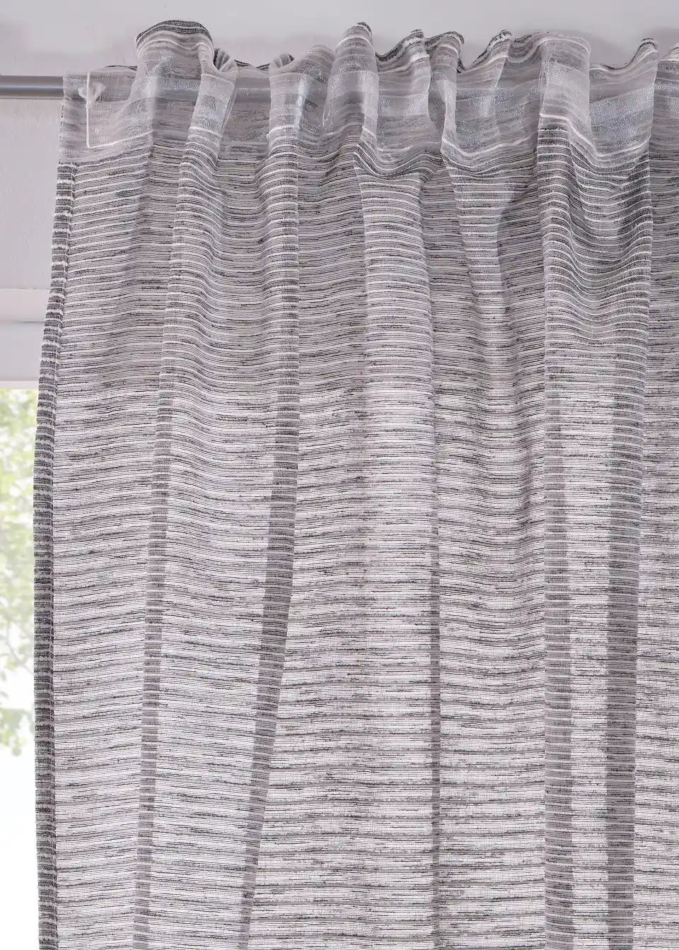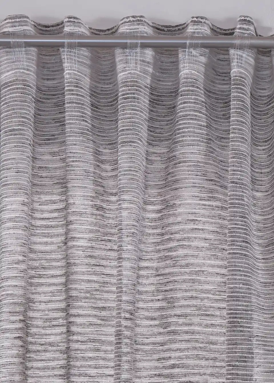 Die Gardine hat einen feinen Streifen, der ihre moderne Optik ausmacht. Ob in weiß oder schwarz mit weißen Streifen, die Gardine ist immer ein Hingucker.
