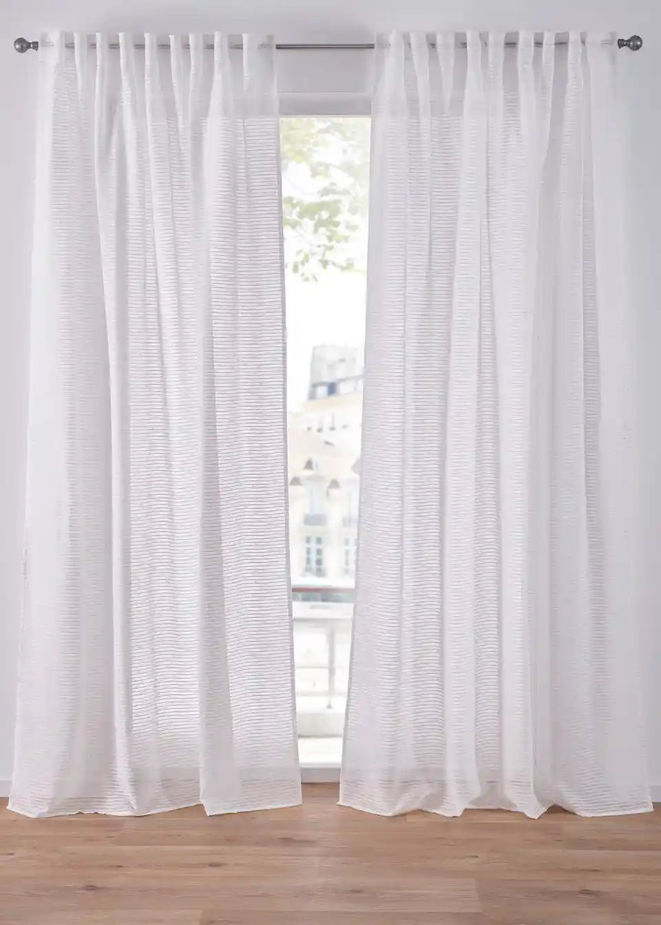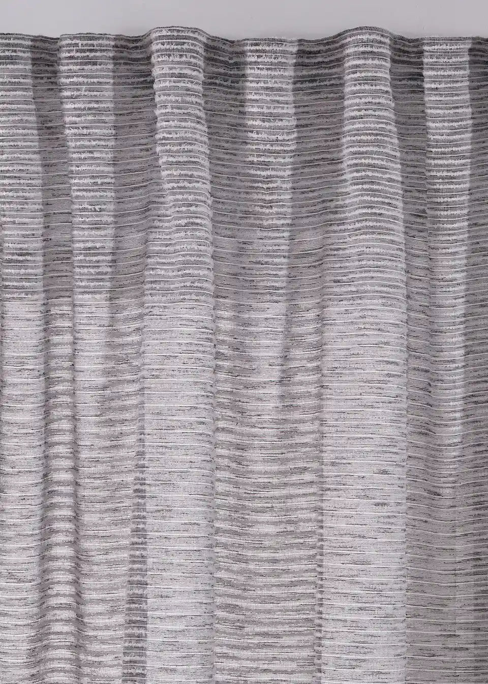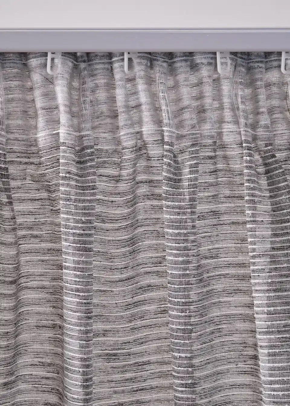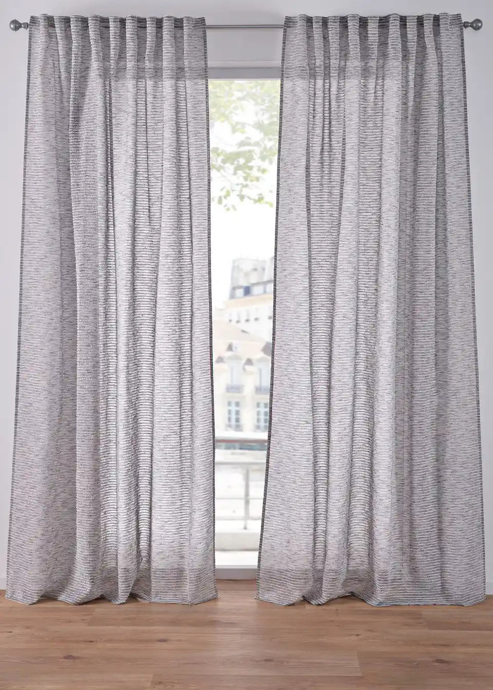 Die Gardine hat einen feinen Streifen, der ihre moderne Optik ausmacht. Ob in weiß oder schwarz mit weißen Streifen, die Gardine ist immer ein Hingucker.