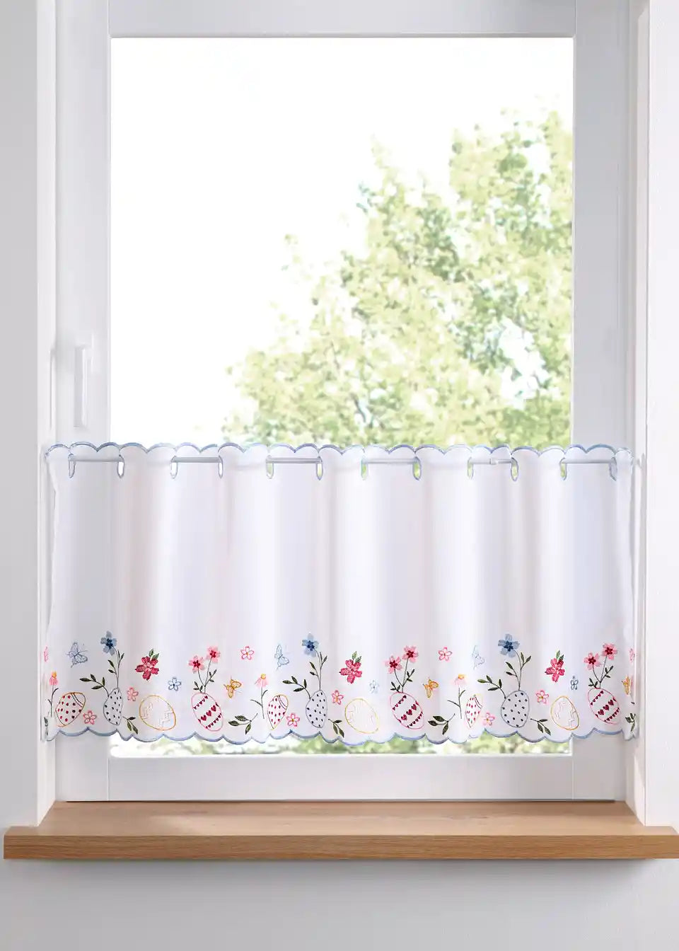 Diese Scheibengardine aus lichtdurchlässigem Voile-Stoff ist mit farbenfrohen Oster-Motiven bestickt.