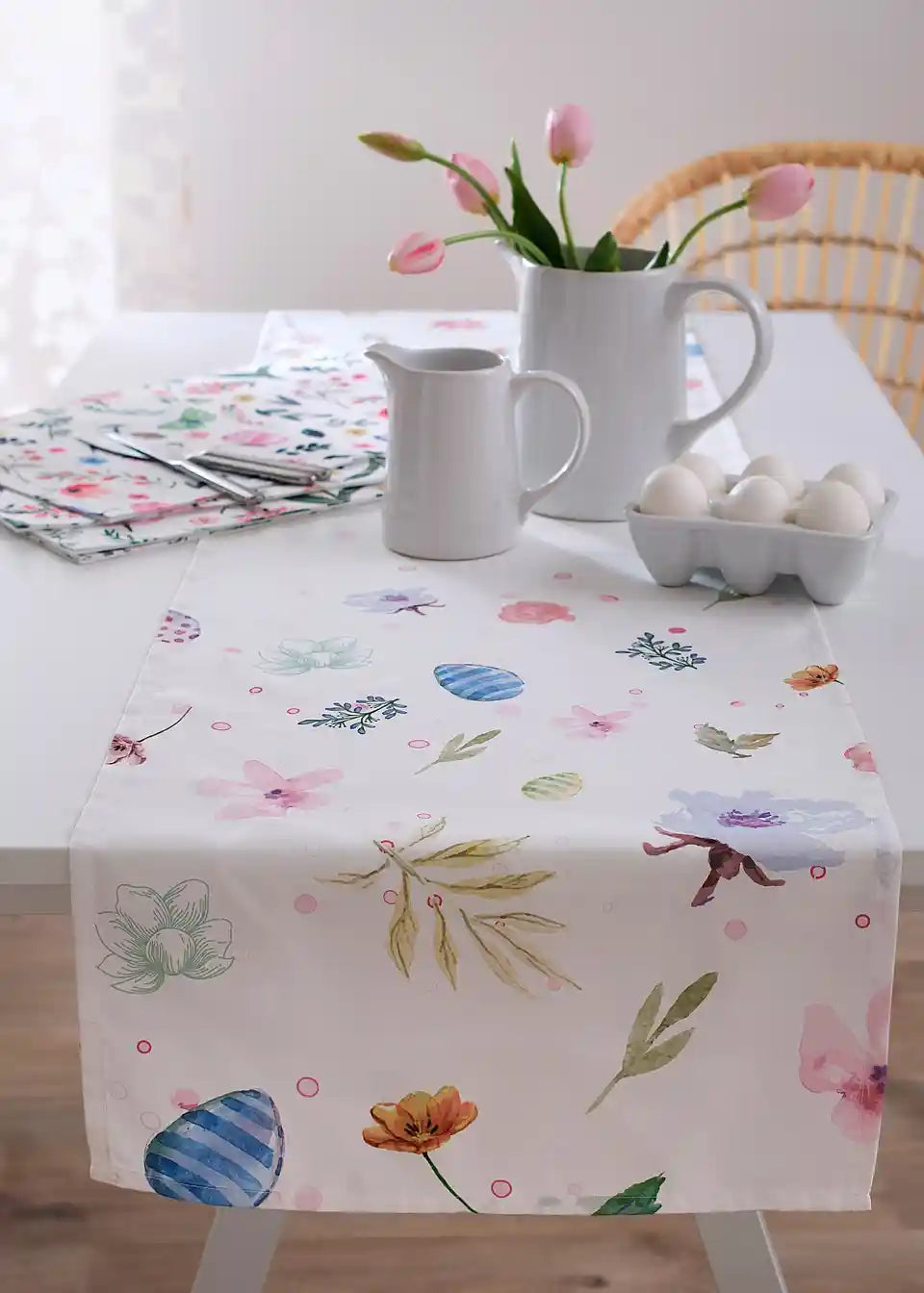Dieser Tischläufer bezaubert durch seinen tollen Druck mit frühlingshaften Motiven.