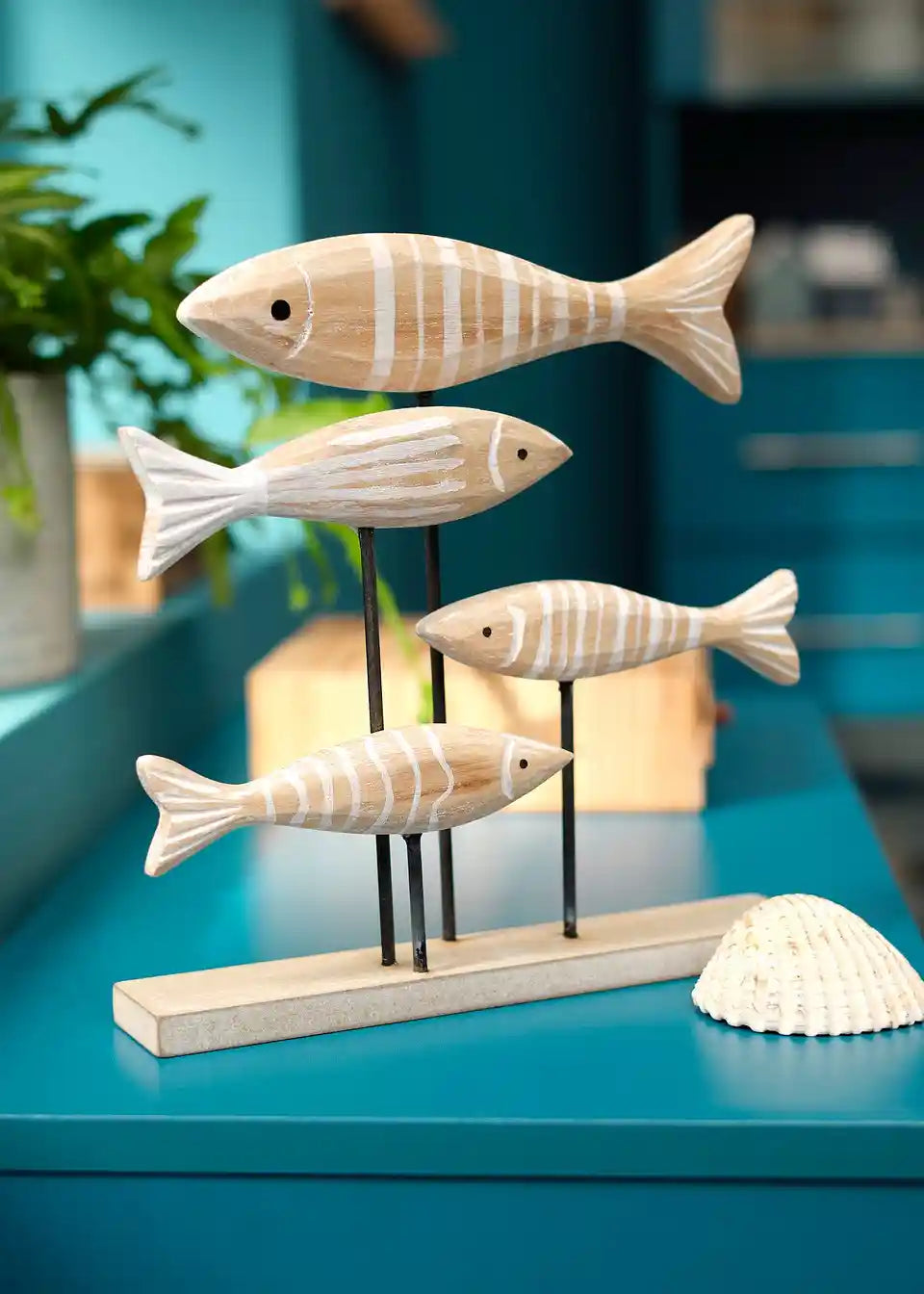 Originelle Dekoration für den Bad.- und Wohnbereich. 4 Fische in verschiedenen Höhen angeordnet. Dieses schöne Dekoelement wird alle Blicke auf sich ziehen.