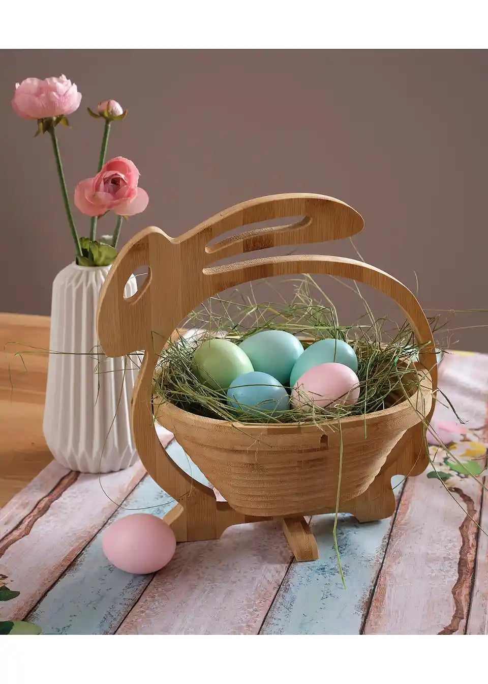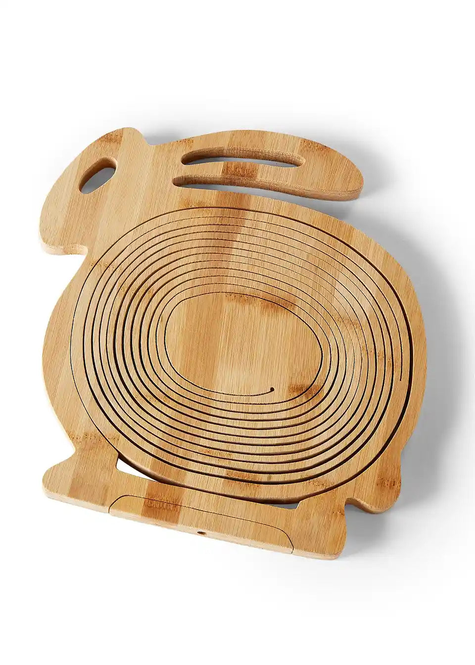 Untersetzer oder Obstkorb? Bei diesem schönen Bambus-Faltkorb wurde beides auf besonders kreative Art umgesetzt: Zusammengelegt ist es ein hitzefester Topfuntersetzer in hübscher Hasen-Form. Wird er auseinandergefaltet, erscheint ein dreidimensionaler, dekorativer Obstkorb, ebenfalls in Hasen-Form. Schön und nützlich zugleich, denn Bambusholz ist sehr stabil und hat eine antibakterielle Wirkung. Kleiner Verwandlungskünstler mit großer Wirkung - der geschmackvolle Bambus-Faltkorb.