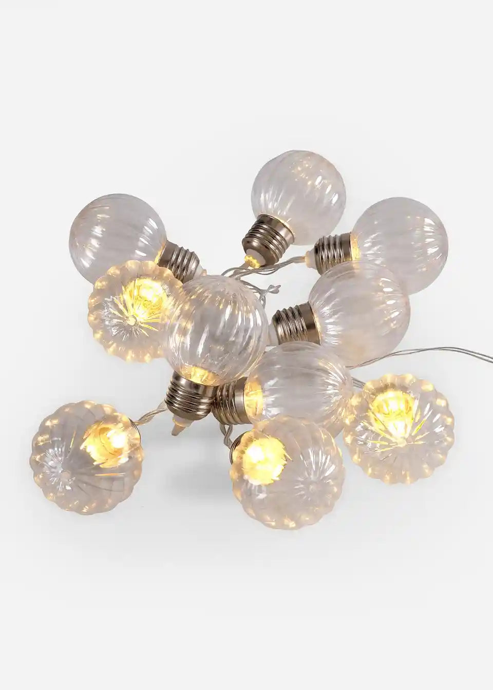 Diese charmante Lichterkette bringt eine gemütliche Atmosphäre in jeden Raum. Die stilvollen LED Glühbirnen mit ihrem einzigartigen Design sorgen für ein warmes Licht und setzen ansprechende Akzente in der Einrichtung. Ob drinnen oder draußen, diese Lichterkette ist ideal für festliche Anlässe oder entspannte Abende und verwandelt jeden Ort in einen einladenden Raum. Die Kombination aus transparentem Glas und metallischen Details verleiht der Kette einen modernen Touch, der sich mühelos in verschiedene Einrichtungsstile integriert. Ein zeitloses Dekorationselement, das sowohl Funktionalität als auch ästhetischen Anspruch vereint.