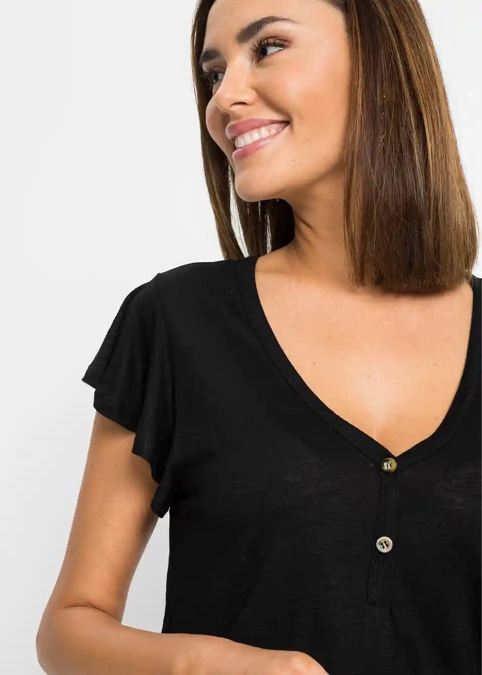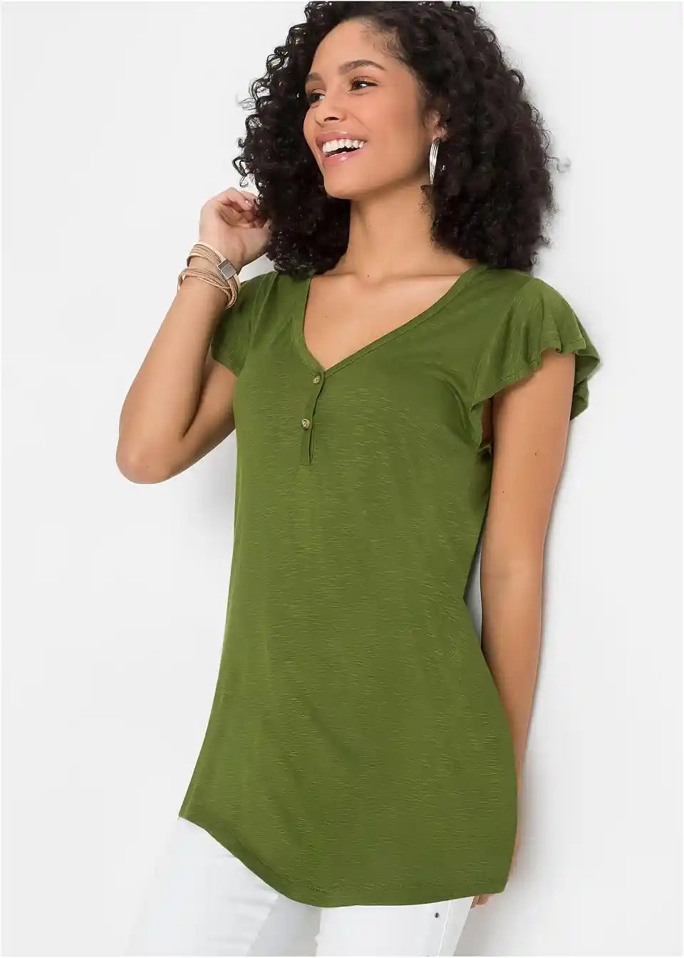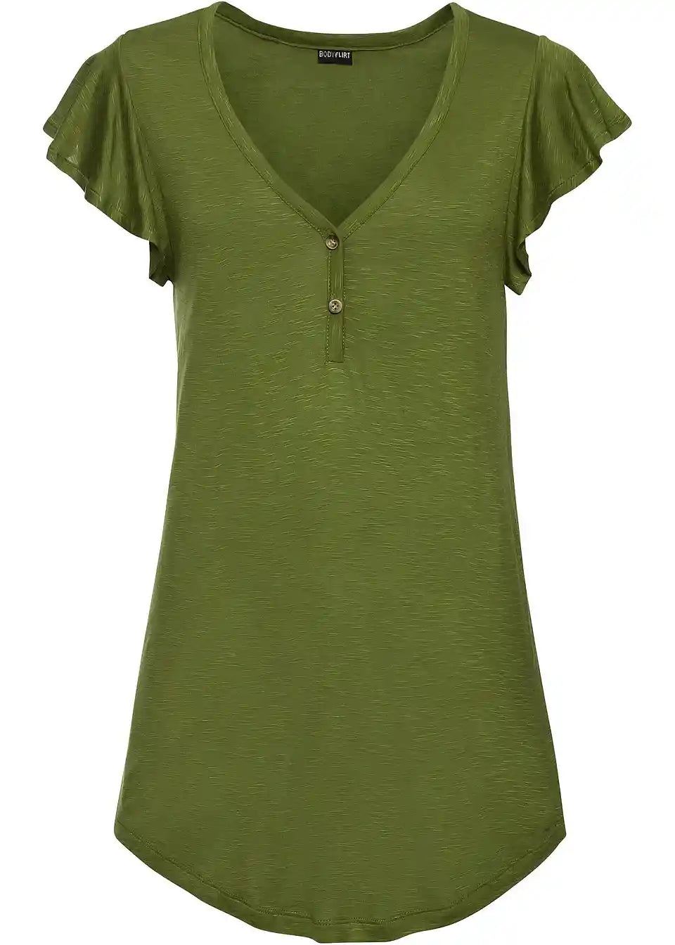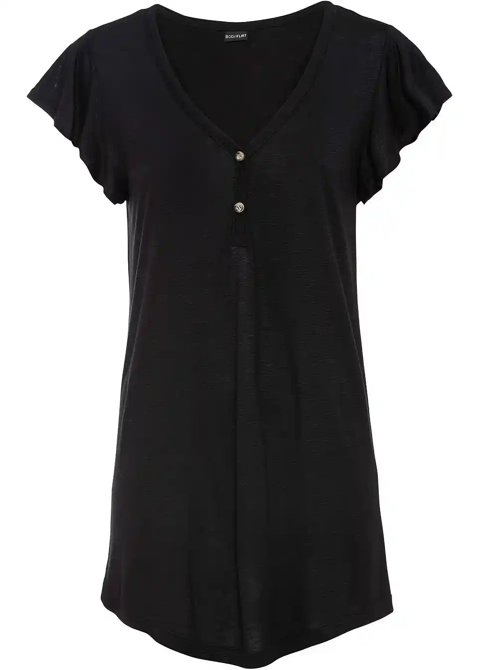 Dieses Longshirt mit Knöpfen trägt sich komfortabel an warmen Tagen. Durch die lange Form wirkt das Oberteil besonders vorteilhaft. Kleine Flügelärmel und die Knopfdetails am V-Ausschnitt geben dem Shirt von BODYFLIRT seinen femininen Stil. Der weich fließende Stoff zeigt sich in leicht melierter Optik. Zusammen mit einer locker geschnittenen Hose ist das sommerliche Outfit komplett.