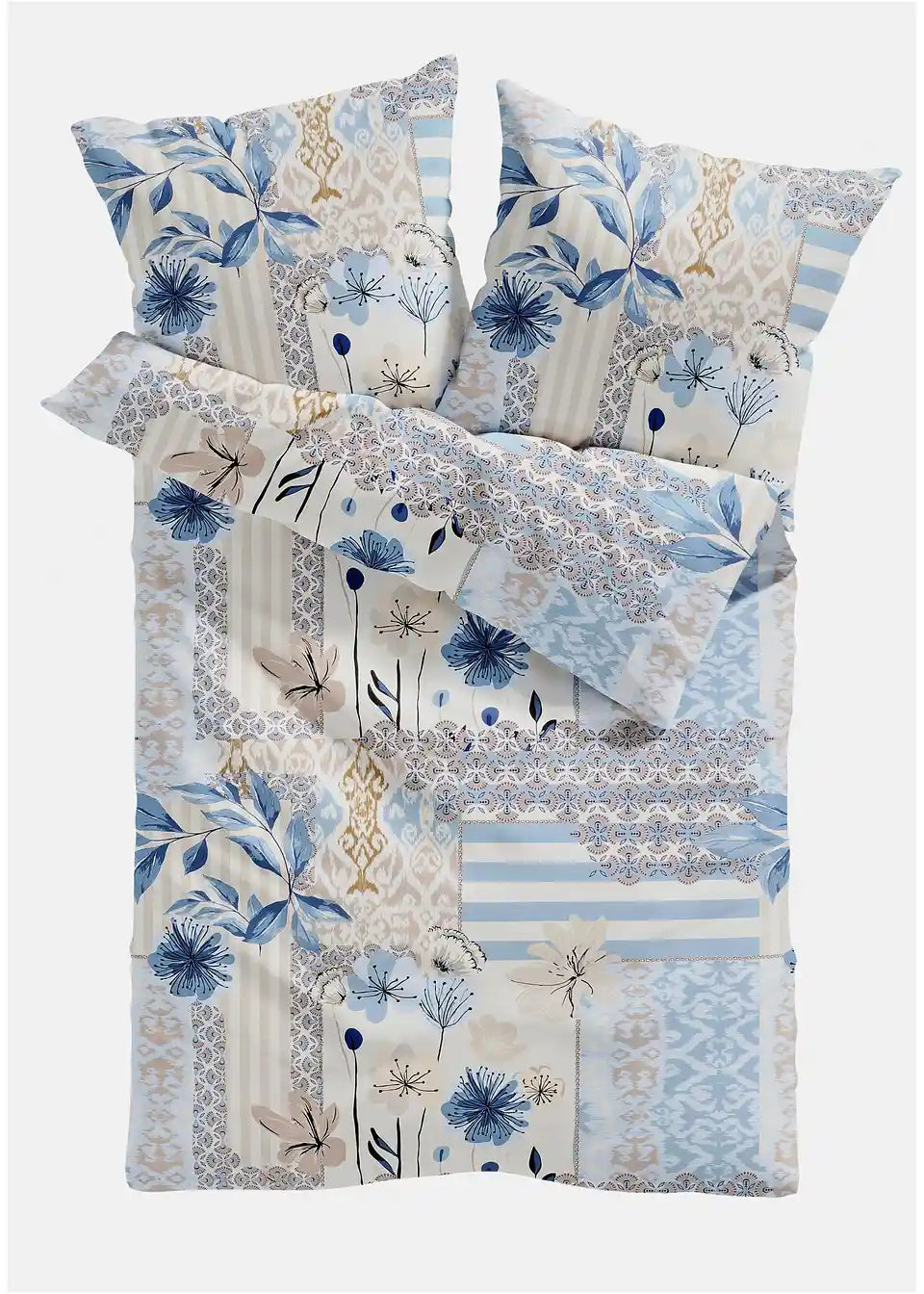 Ein lebhaftes Patchwork-Design in Blau- und Cremetönen, das florale Motive mit geometrischen Mustern vereint.