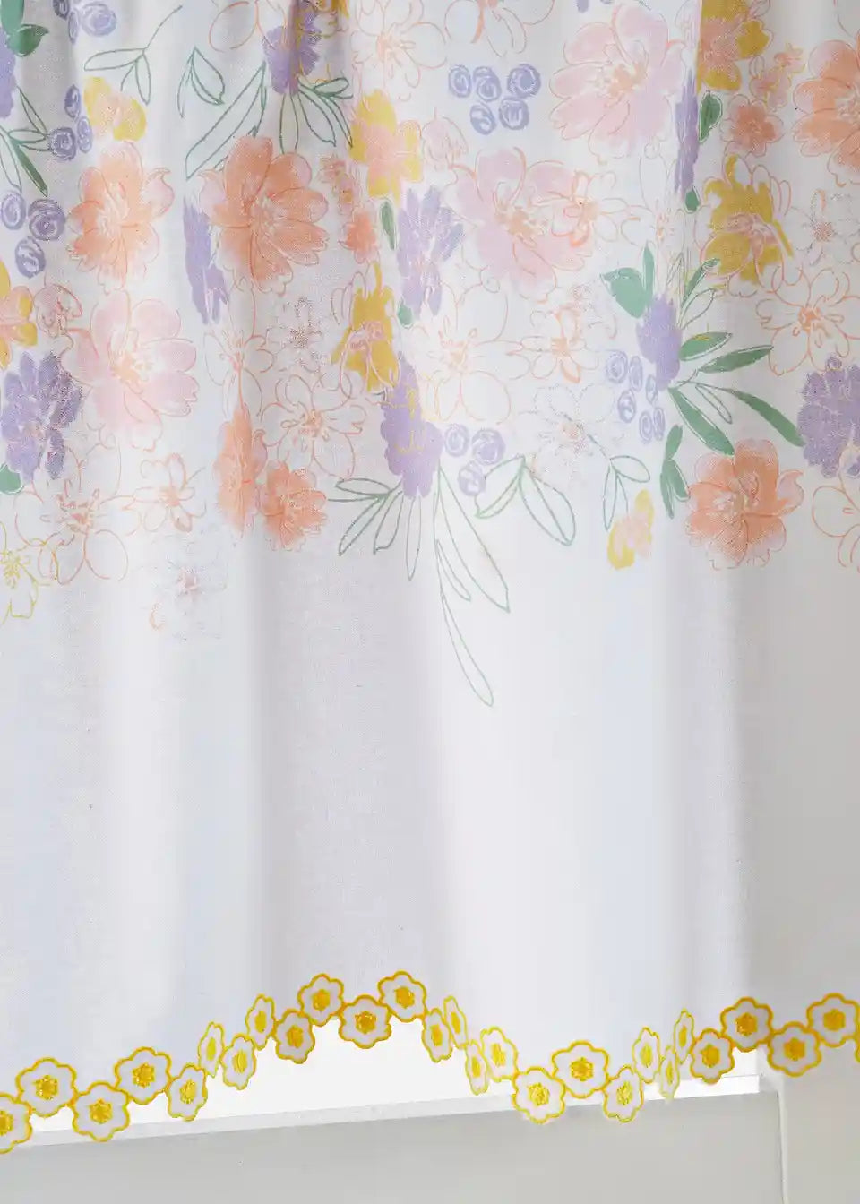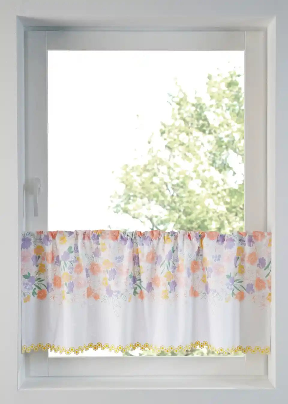 Schmückender Fensterschmuck für Deine Küche. Die Küchengardine hat einen hübschen Blumendruck und ist aus hochwertiger Bio Baumwolle gefertigt.