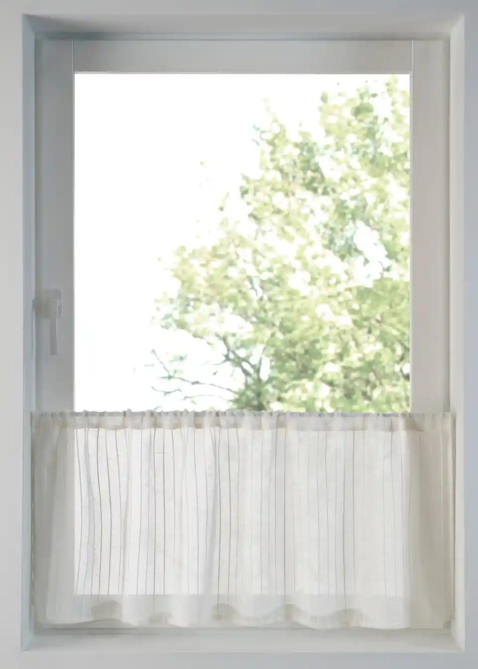 Die Küchengardine ist mit dezenten Streifen und in weiß, so dass sie unauffällig Dein Fenster schmückt.