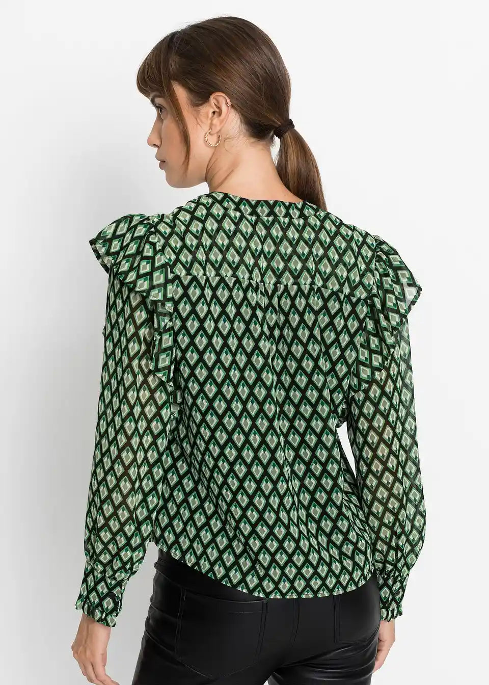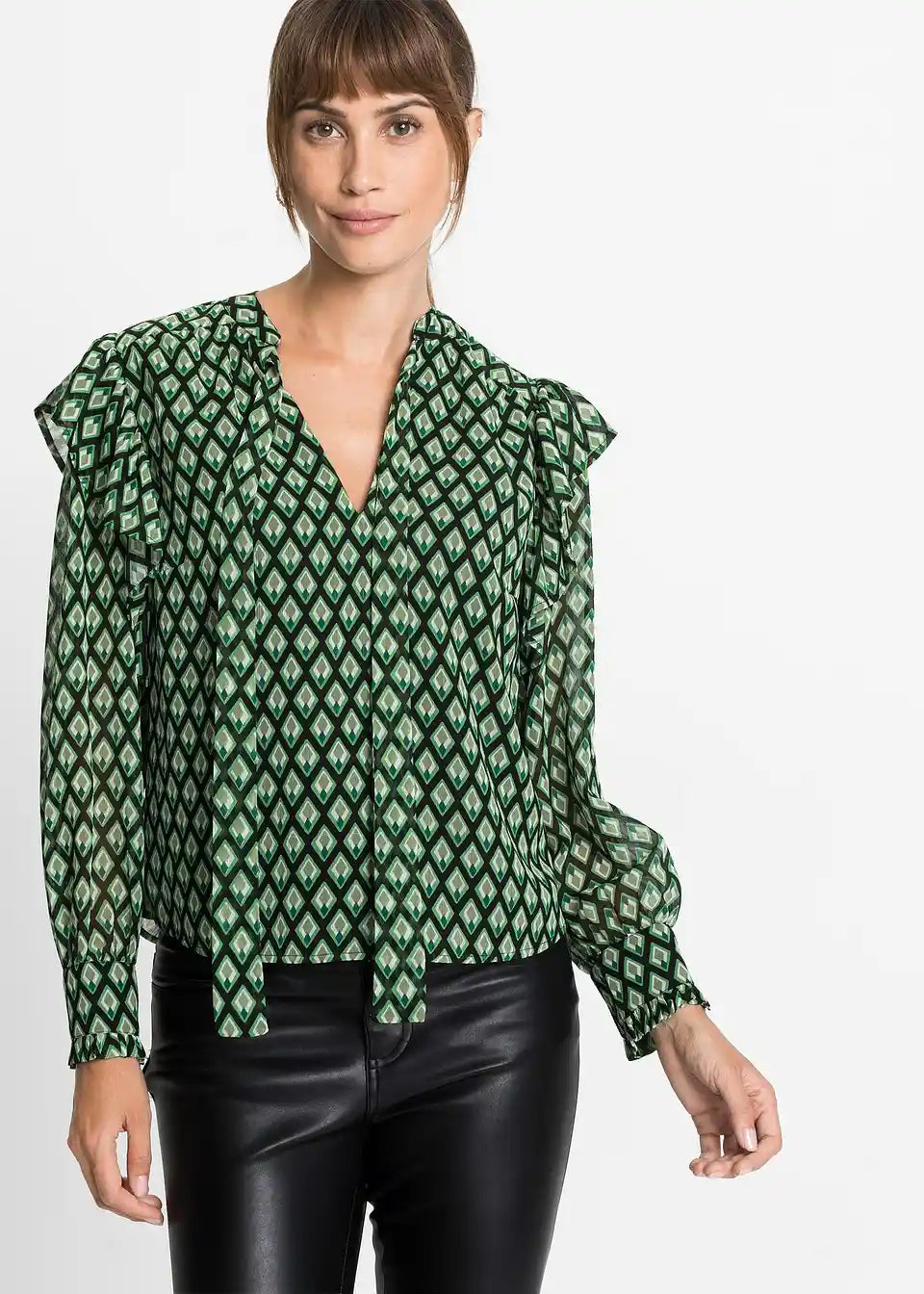 Ich bin begeistert von der Bluse! Das Material und die Farben sind exakt wie auf der Abbildung der Internetseite und die Größe und Länge sind perfekt. Die Volants an der Schulter schauen toll aus.