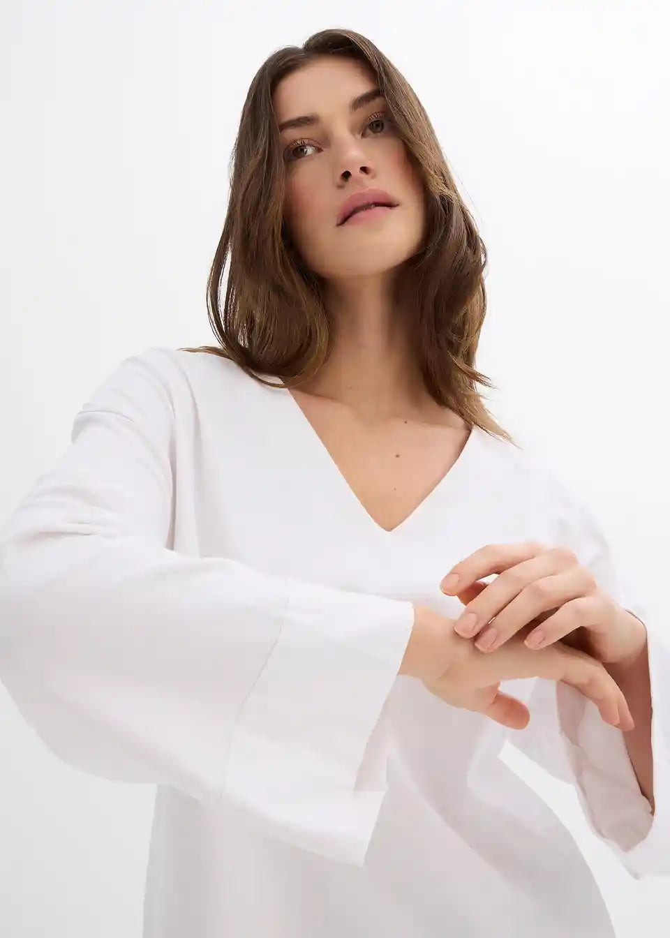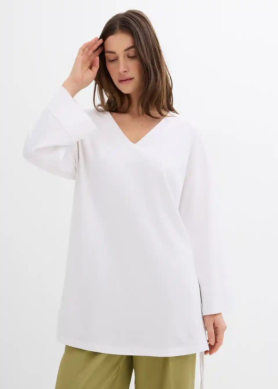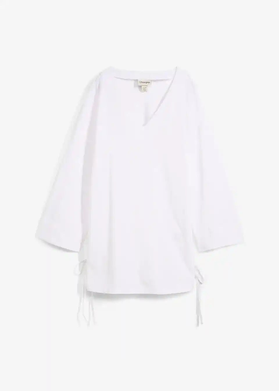 Oversize Shirt mit V-Ausschnitt, 3/4-Ärmeln und Seitenschlitzen am Saum mit Bändern