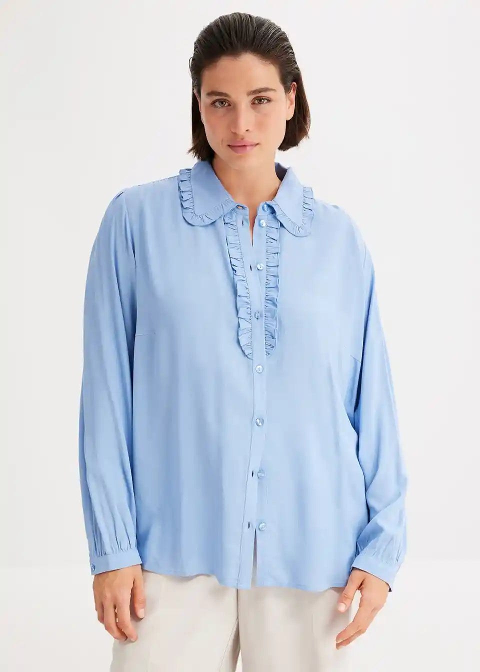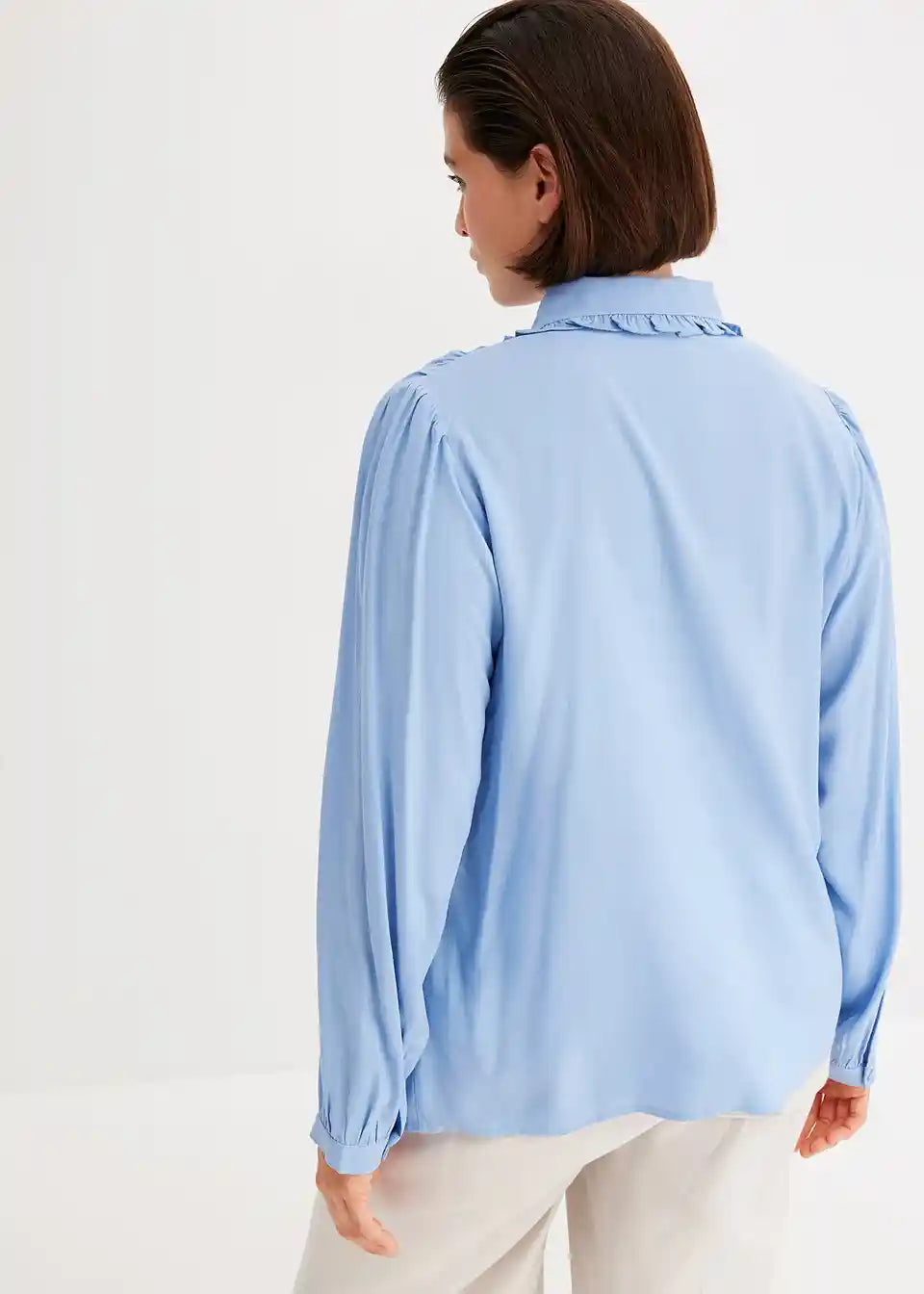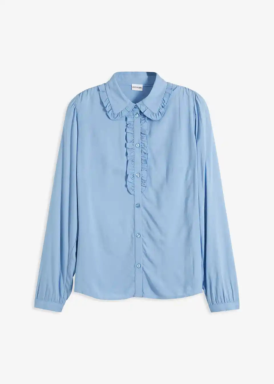 feminine Bluse mit kleiner Rüsche am Kragen und vorne an der Knopfleiste