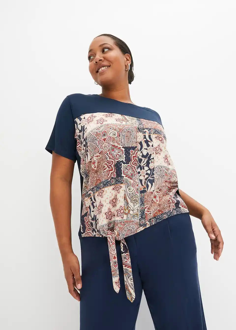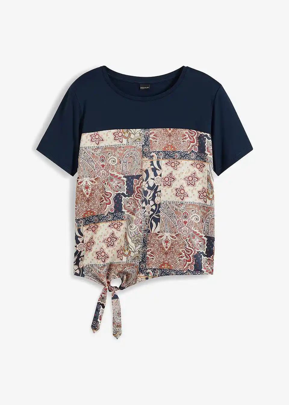 modisches Shirt mit bedrucktem Web-Material vorne und Knoten-Detail am Saum