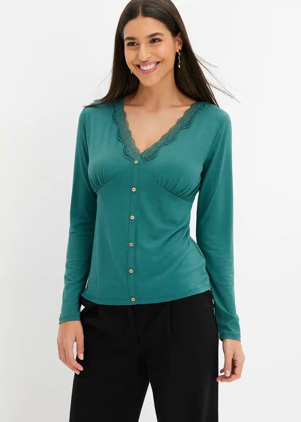 feminines Langarmshirt mit Spitze und dekorativen Knöpfen vorne