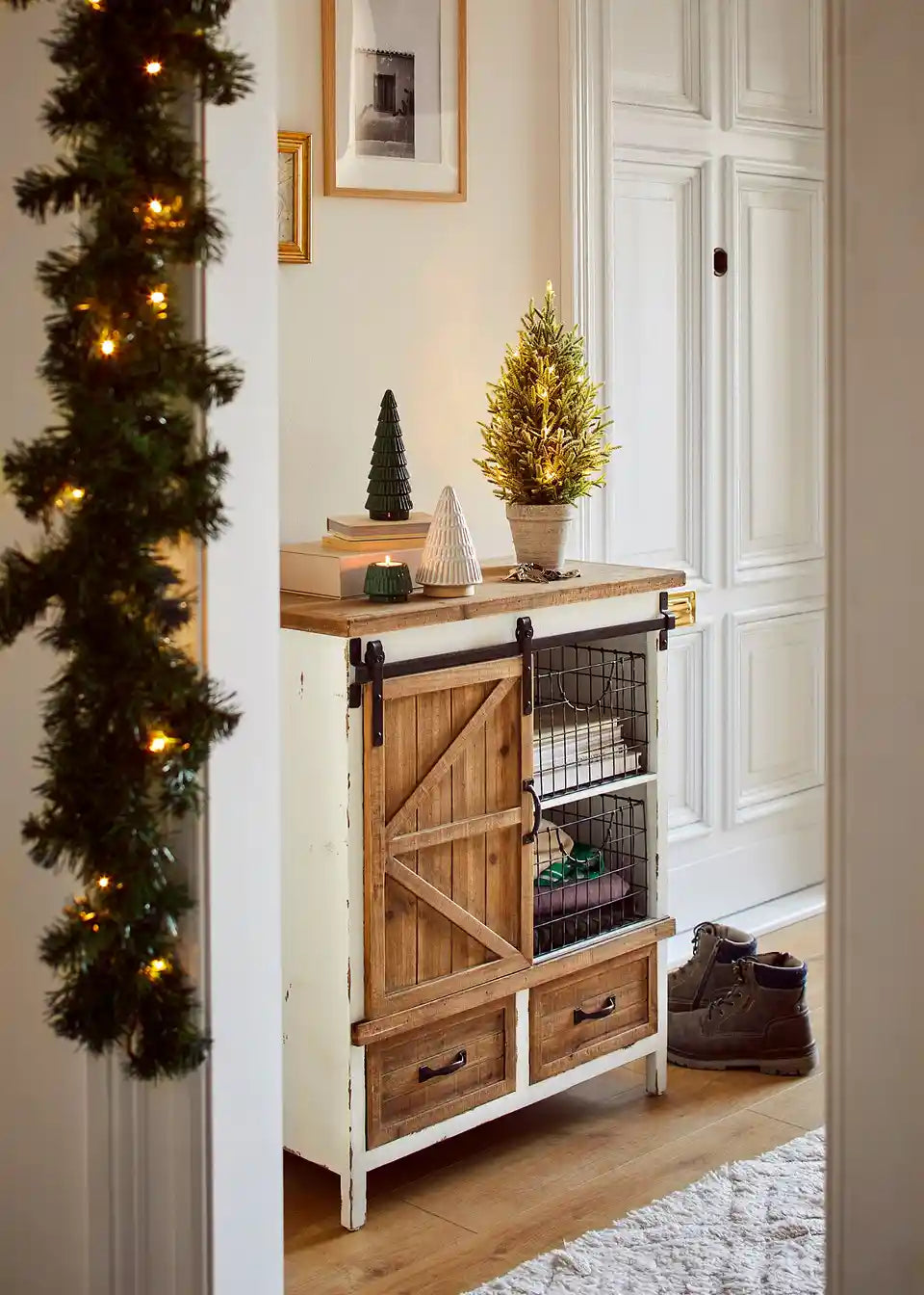 Finde Dein weihnachtliches Deko-Set: ein Teelichthalter und zwei Tannenbäume in unterschiedlichen Größen.