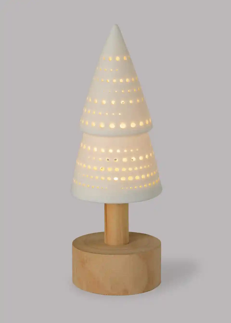 Hol Dir Gemütlichkeit nach Hause: Unser Tannenbaum mit LED-Beleuchtung steht auf einem Holzsockel. Der Materialmix aus Keramik mit Lochmuster und Holz zaubert eine stimmungsvolle Lichtatmosphäre.