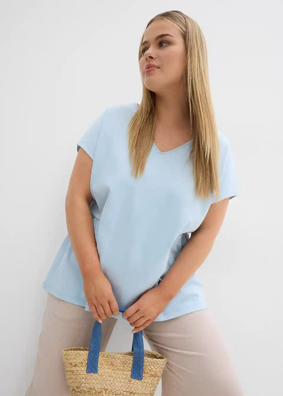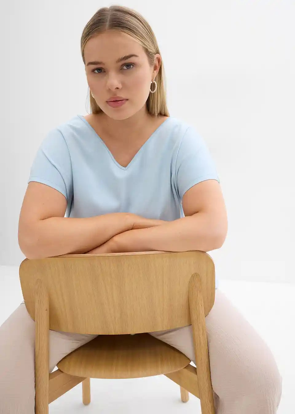 Passformvorteile:hüftbedeckend, ohne auftragende Taschen, streckender V-Ausschnitt, umspielt den Bauch, umspielt den Po, umspielt die Hüfte