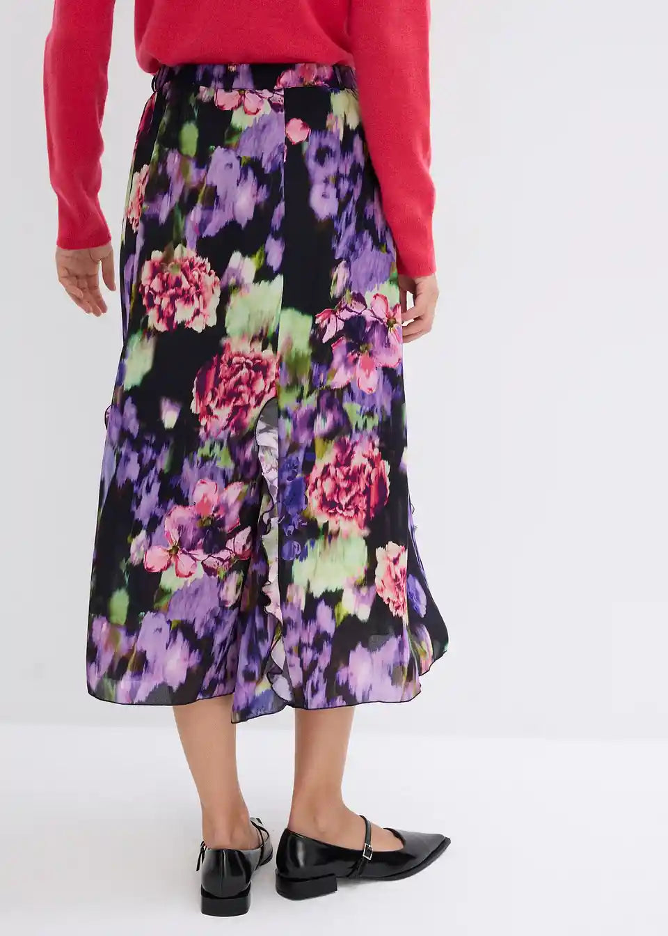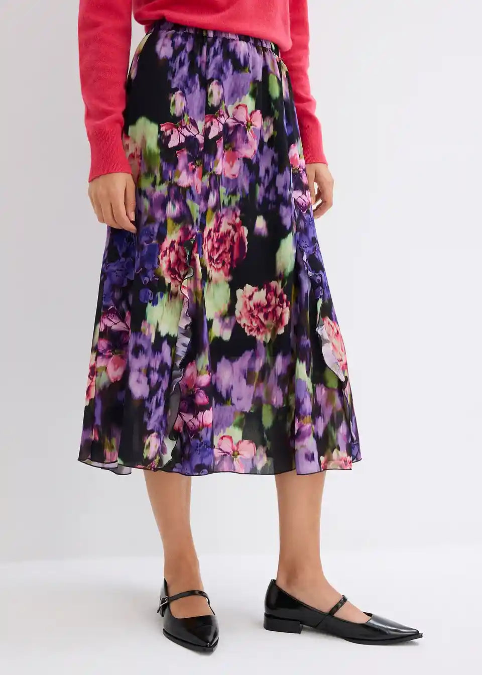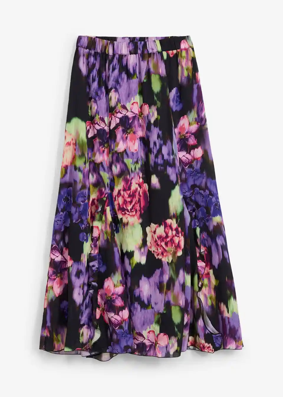 Wunderschöner Chiffon-Rock mit tollem Blumendruck-Motiv in besonderer Farbgebung, vielfältig kombinierbar und für elegante, sowie Casual-Stil gleichermaßen geeignet. Die Passform ist durch den Gummibund variabel. Insgesamt fällt der Rock locker und schwin