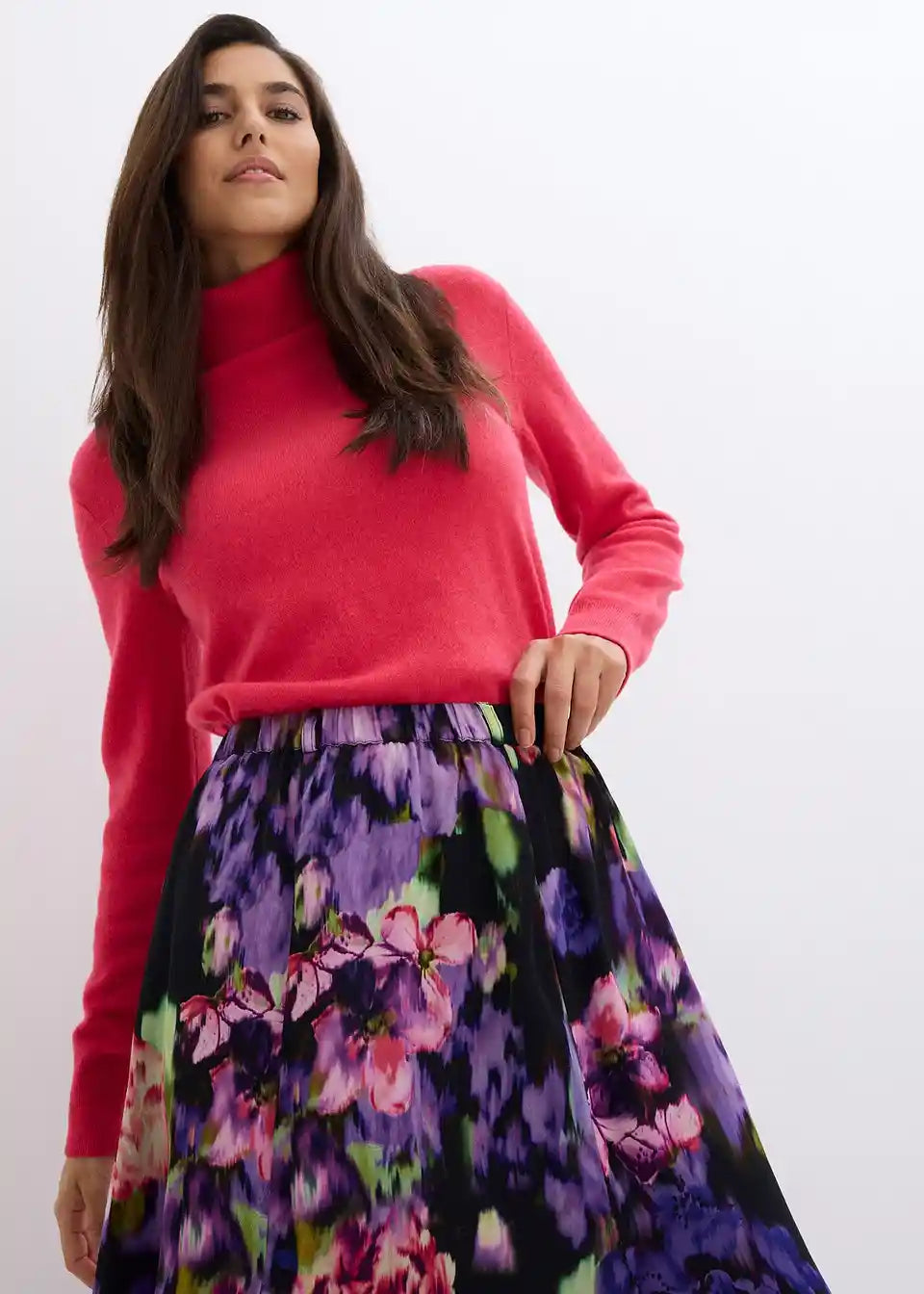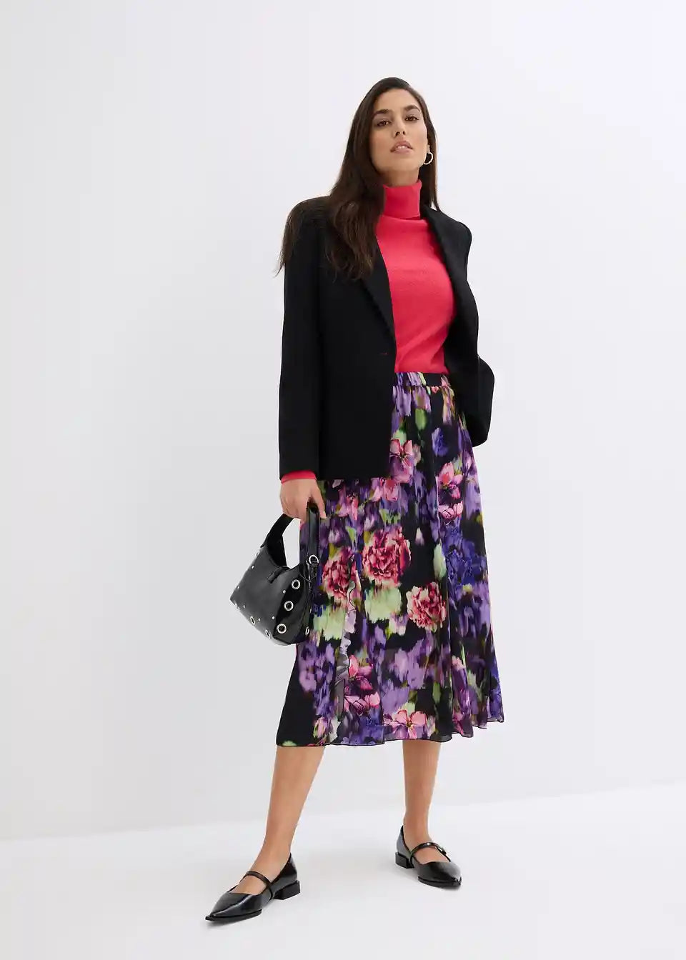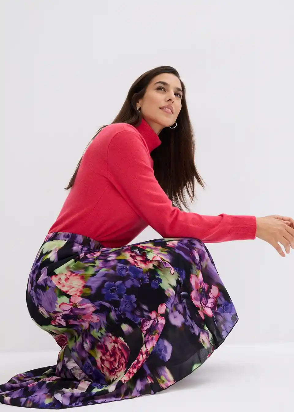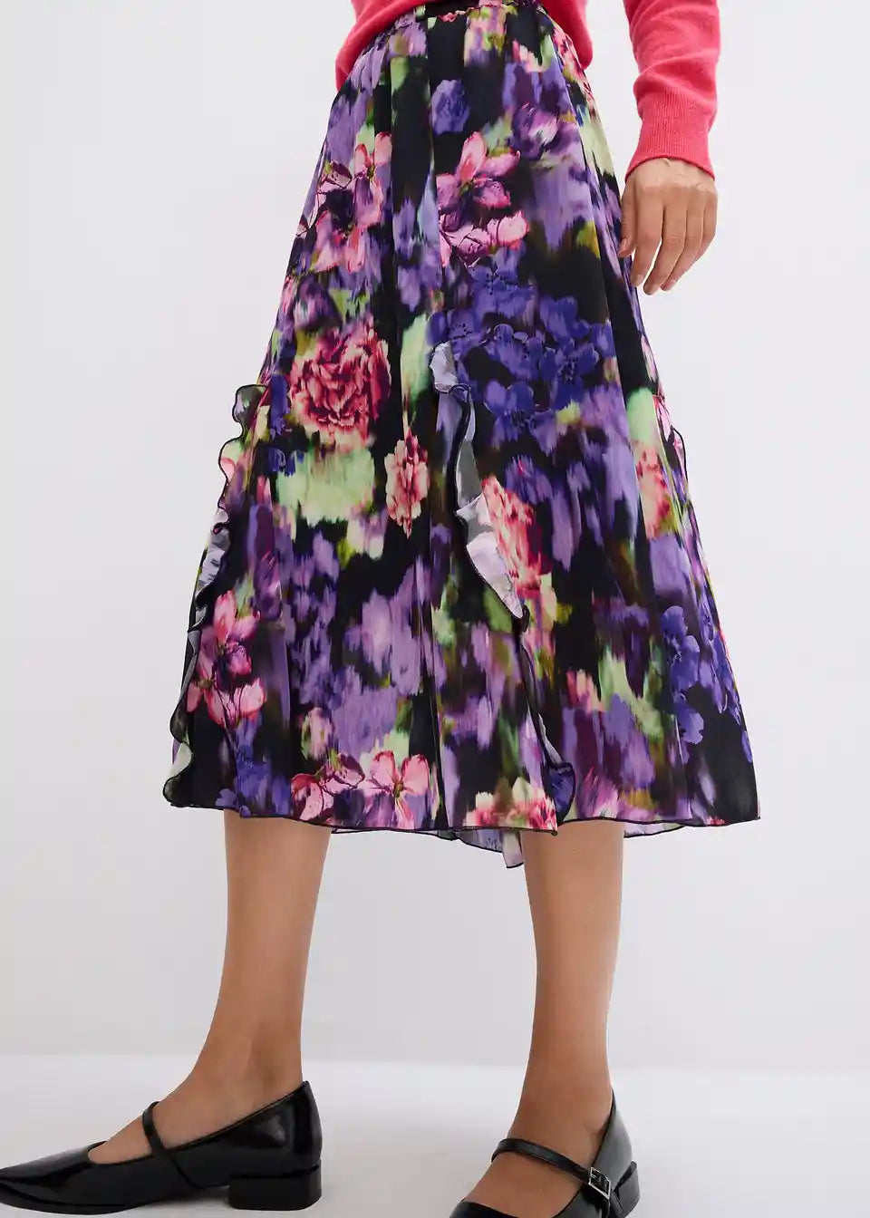 Wunderschöner Chiffon-Rock mit tollem Blumendruck-Motiv in besonderer Farbgebung, vielfältig kombinierbar und für elegante, sowie Casual-Stil gleichermaßen geeignet. Die Passform ist durch den Gummibund variabel. Insgesamt fällt der Rock locker und schwin
