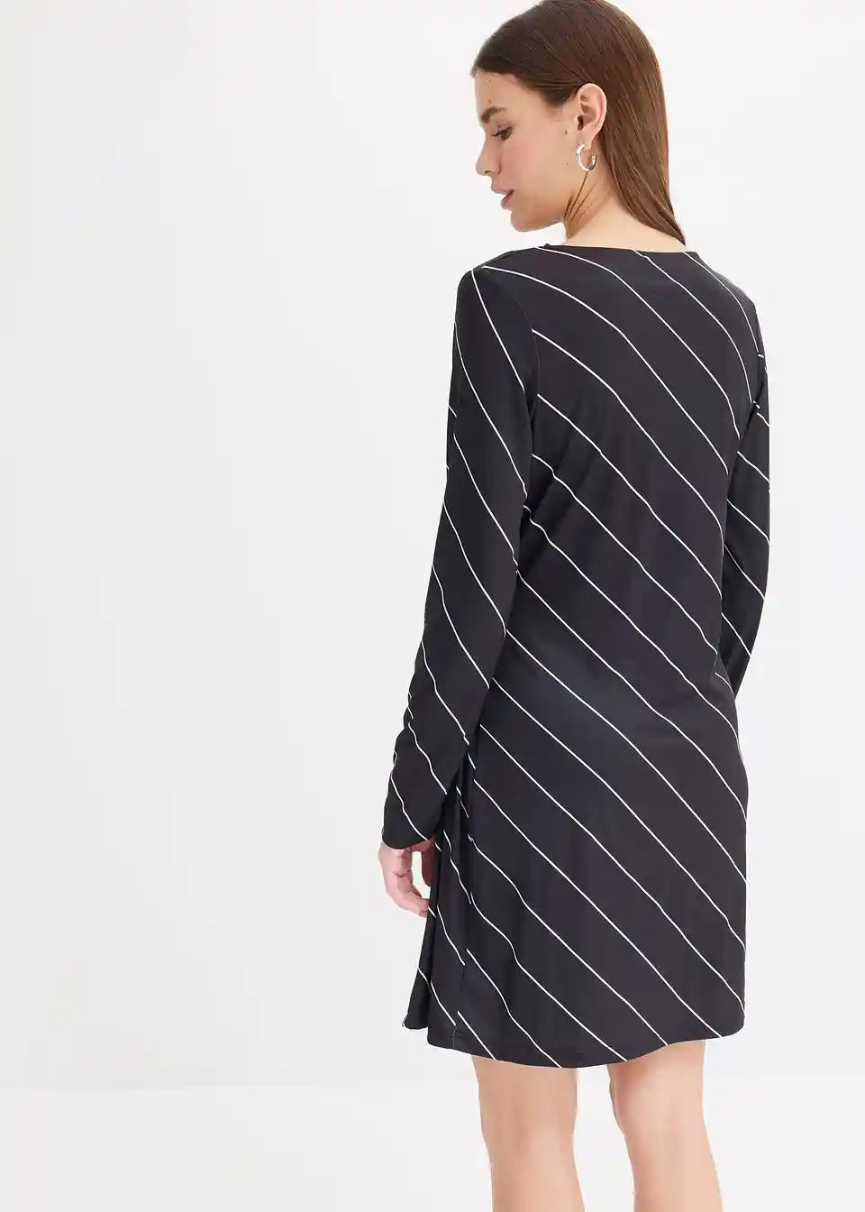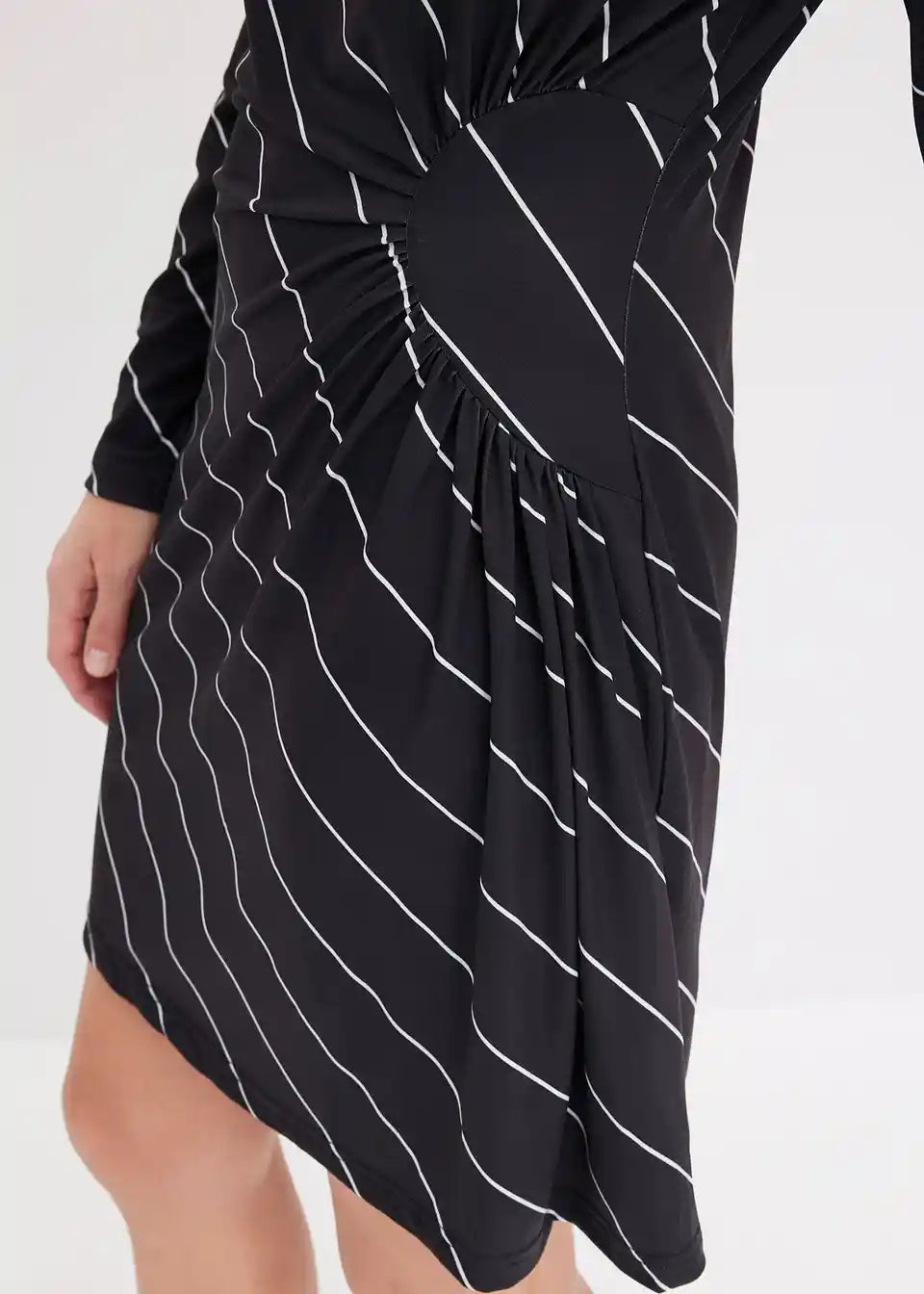 Auffallendes Kleid mit asymmetrischen Saum und Trompetenärmel