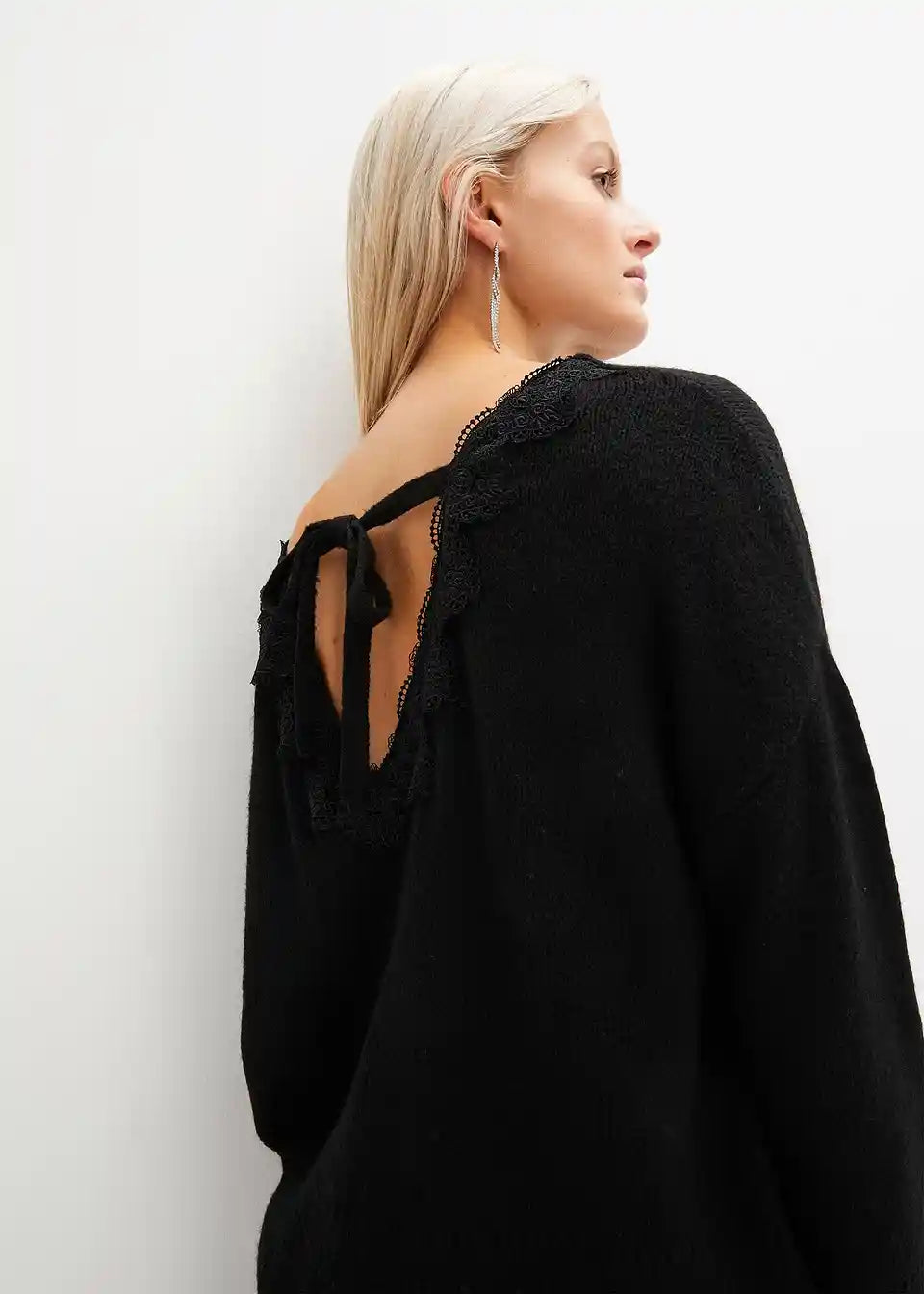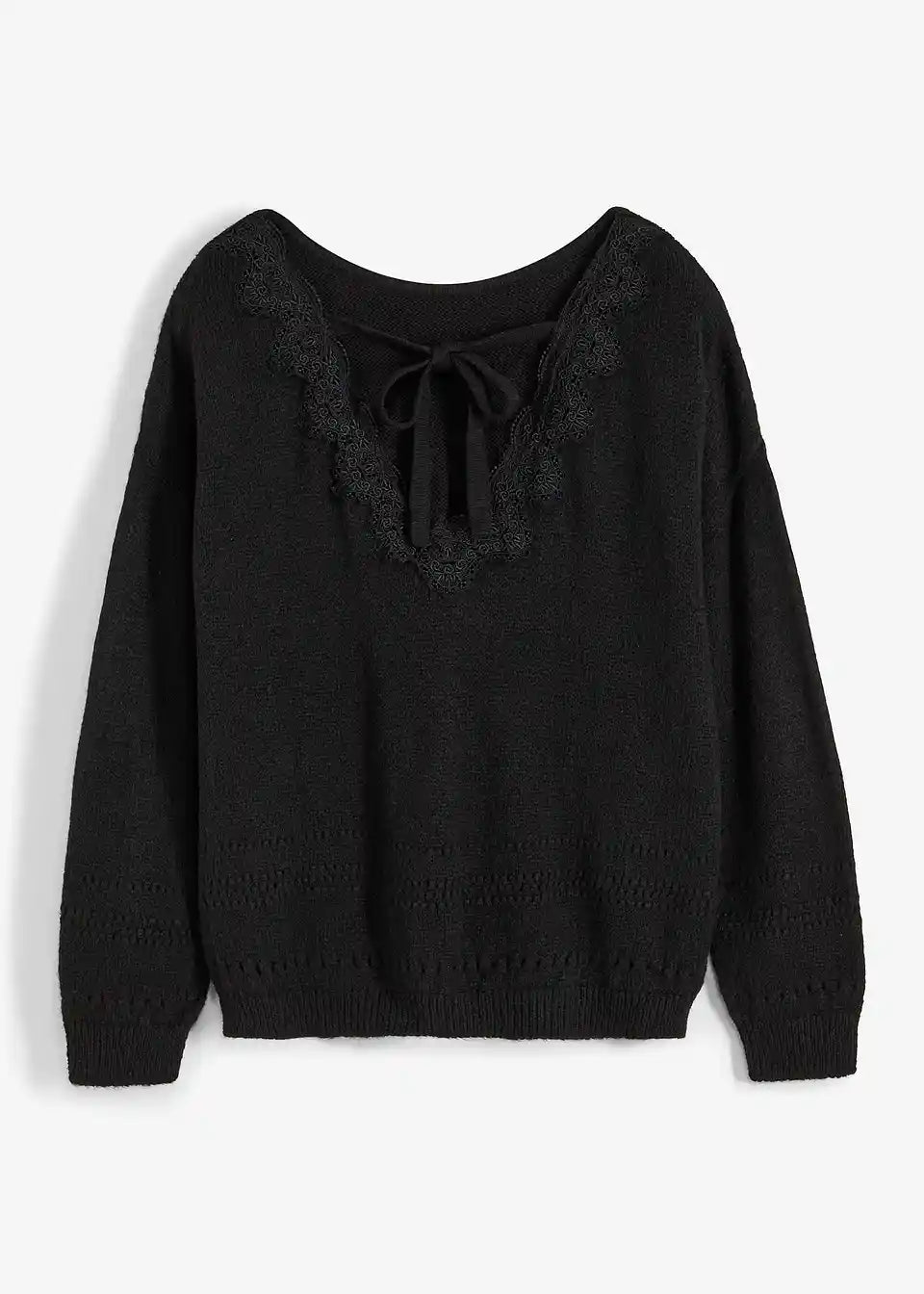 femininer Pullover mit tieferem V-Ausschnitt und Spitze am Rücken.