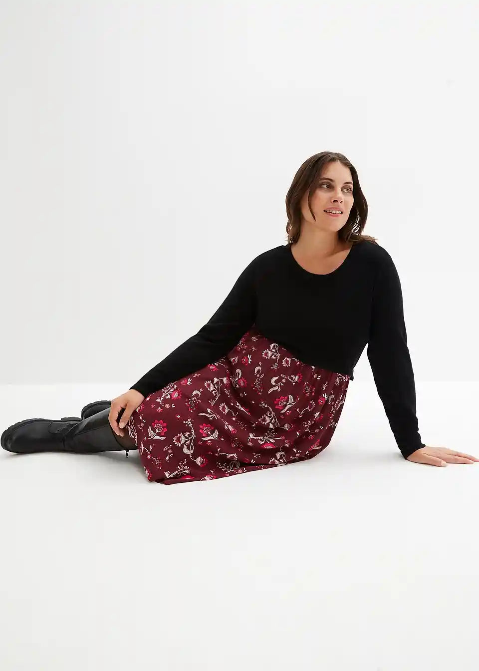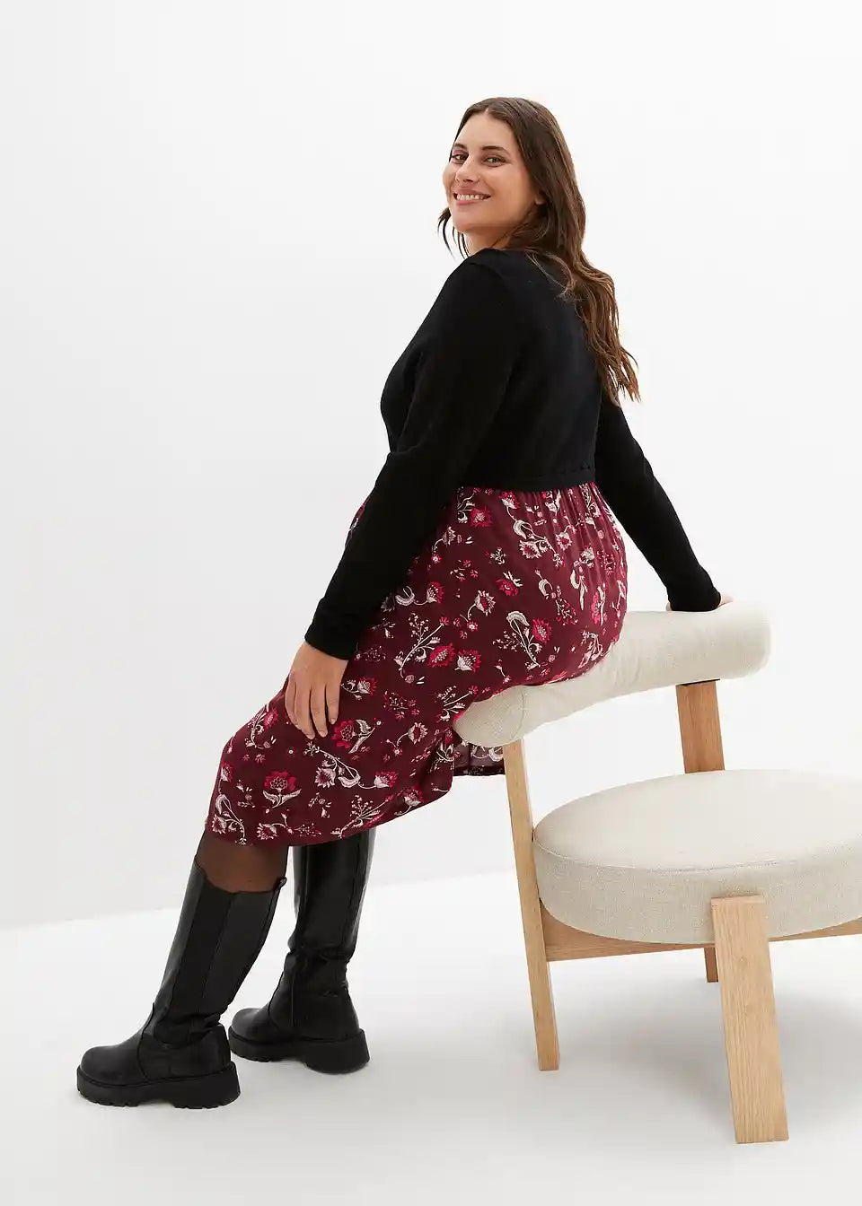 Kombiniertes Kleid aus einem weichen, gestrickten Oberteil und einem bedruckten Rock aus fließender Viskose. Das elastische Oberteil bietet ausreichend Platz für den wachsenden Bauch.