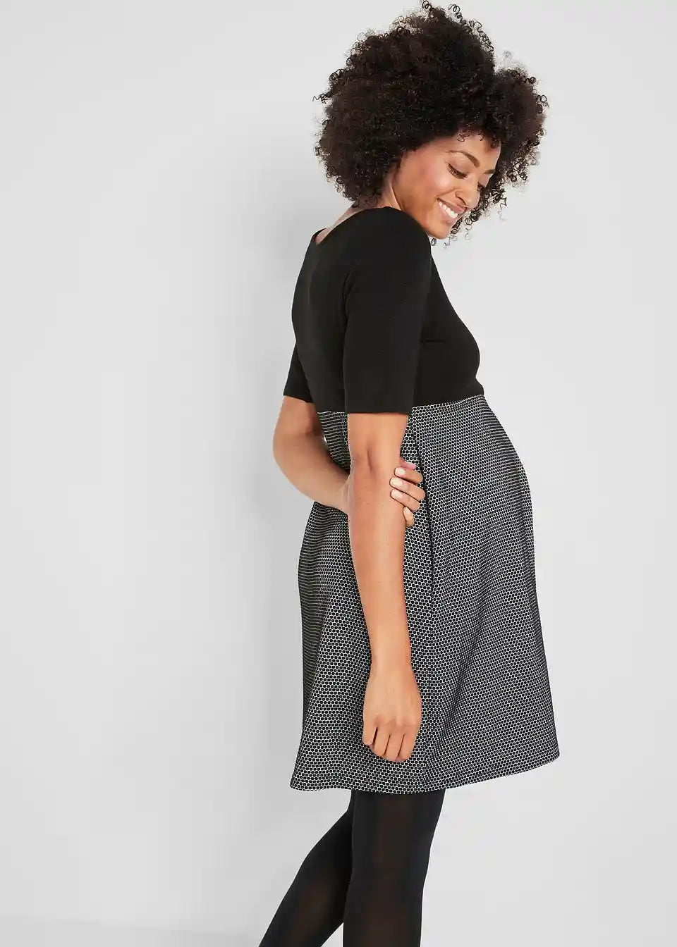 Während der Schwangerschaft ist dieses Umstandskleid mit Rundhals-Ausschnitt dank des flexiblen Materials vom ersten bis neunten Monat tragbar. Das Design überzeugt durch die 2in1 Optik.