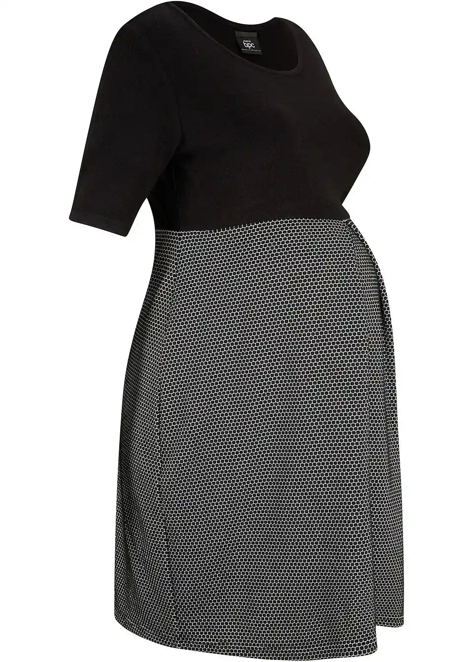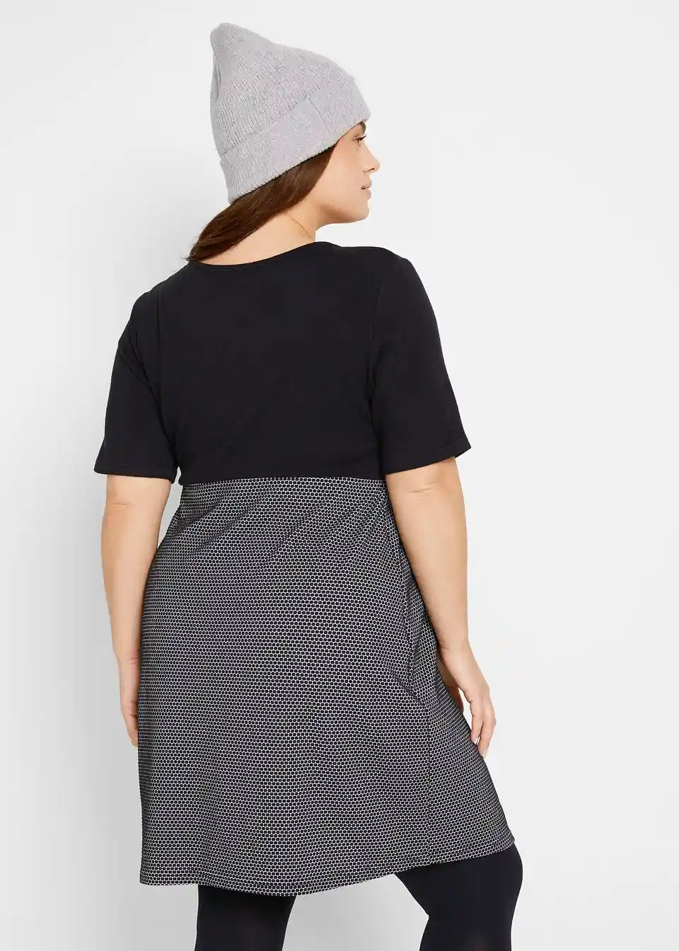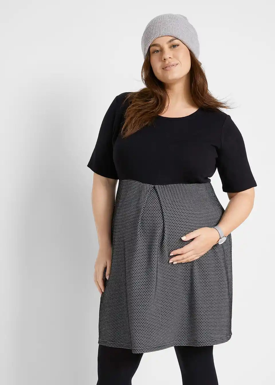 Während der Schwangerschaft ist dieses Umstandskleid mit Rundhals-Ausschnitt dank des flexiblen Materials vom ersten bis neunten Monat tragbar. Das Design überzeugt durch die 2in1 Optik.
