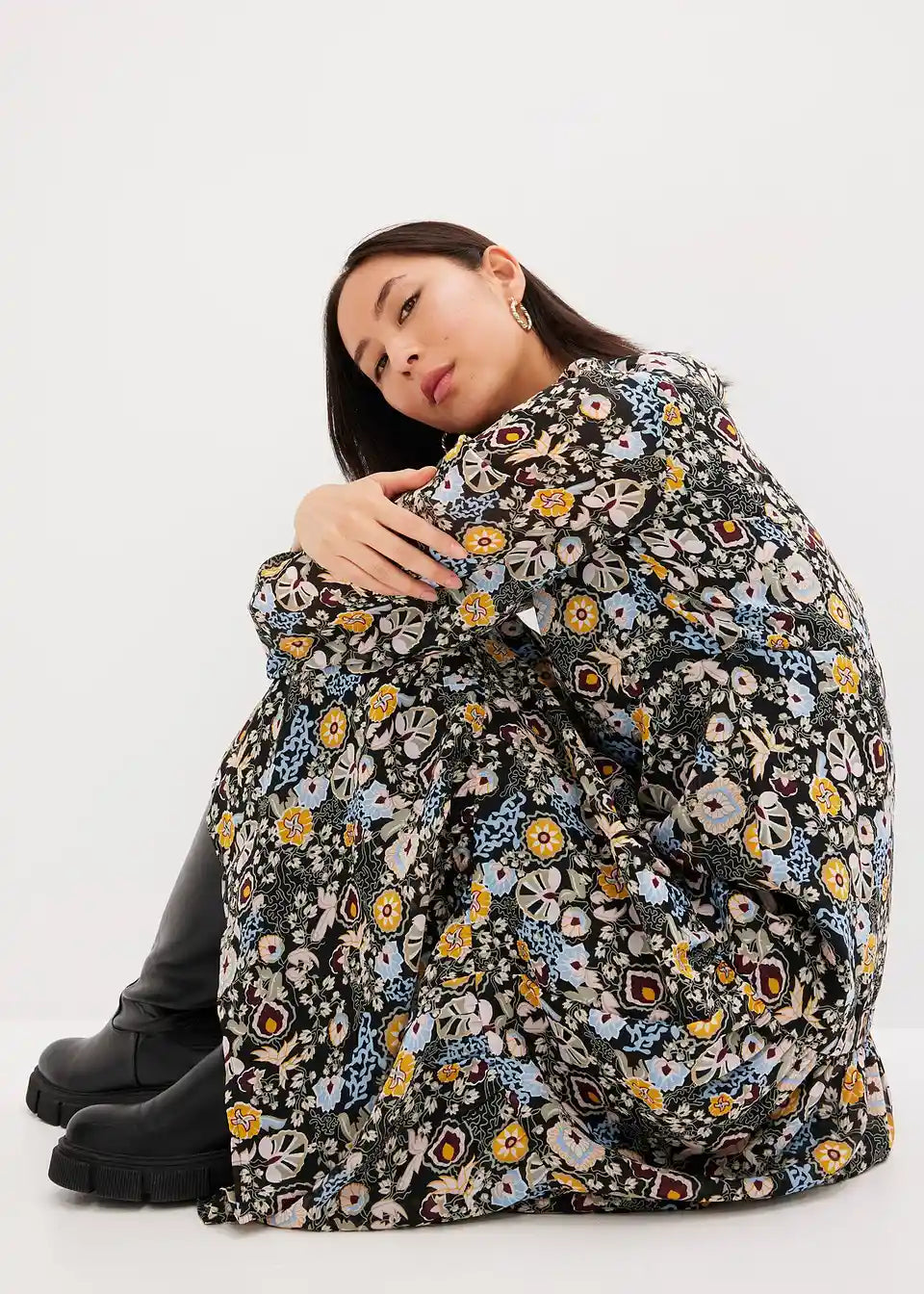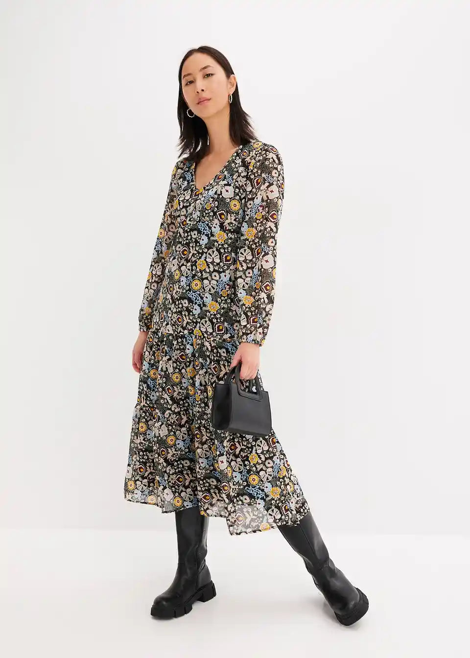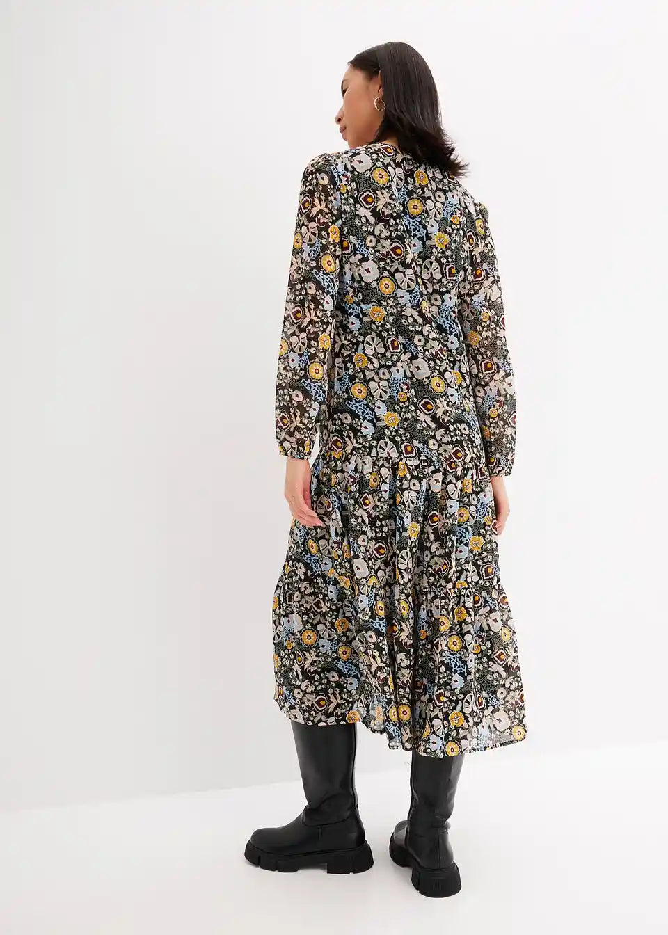 Bedrucktes Midikleid mit Volants und Puffärmeln