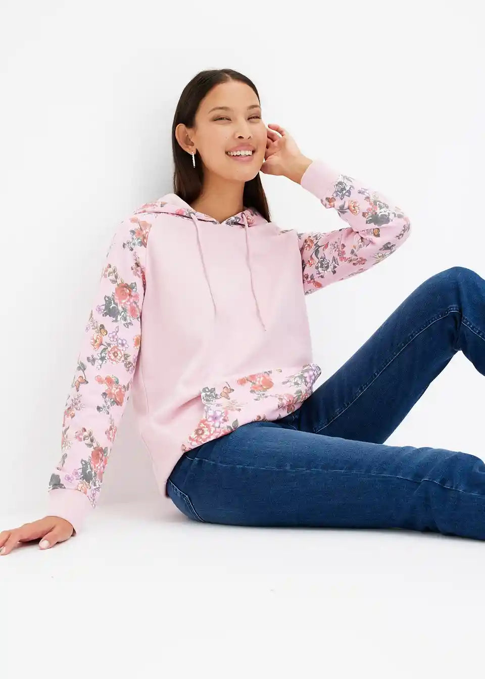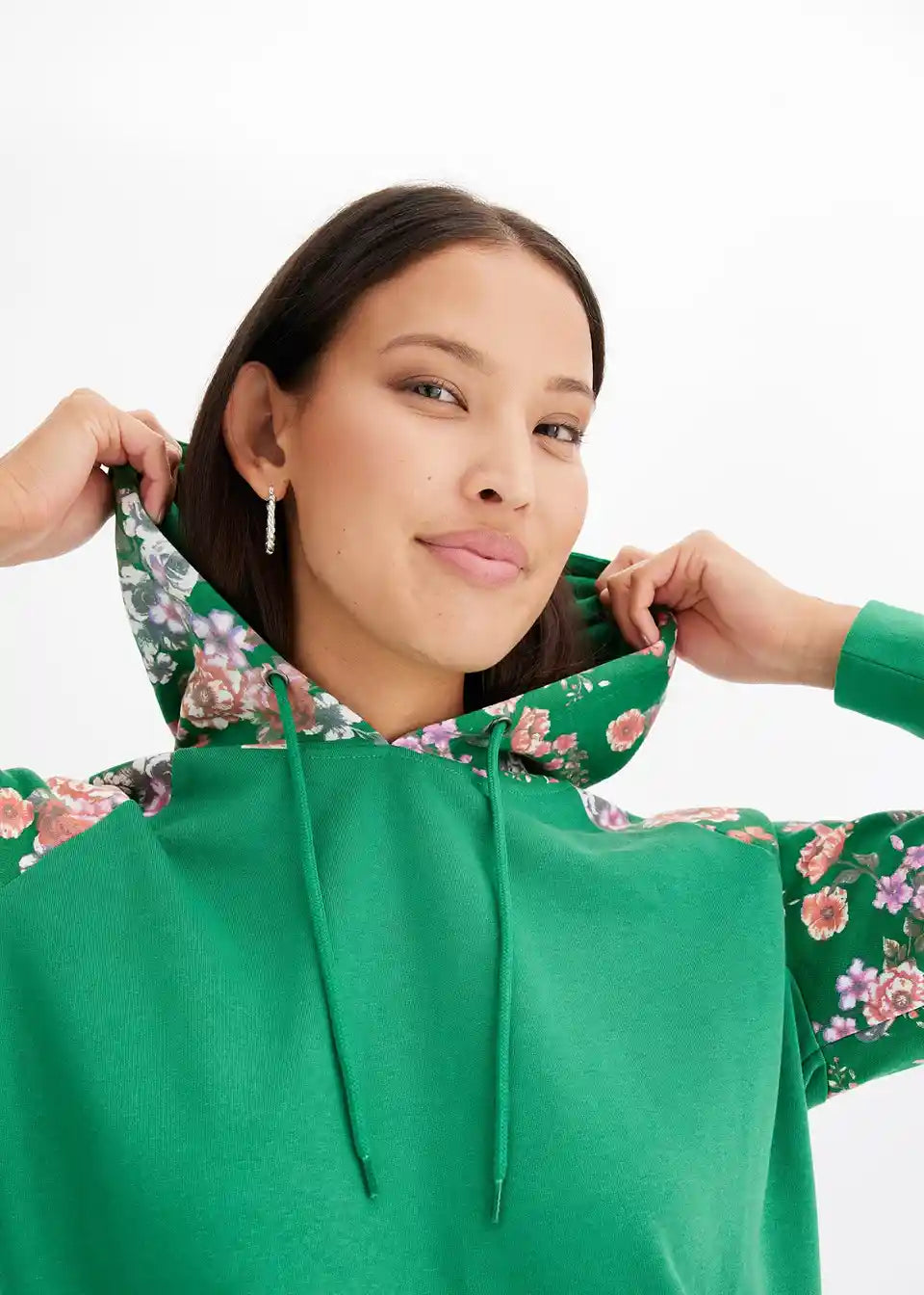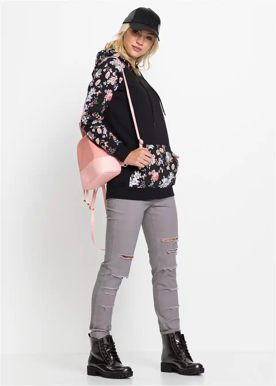 Bei diesem Hoodie fallen die Ärmel, die Kapuze und die Kängurutasche mit einem floralen Druckdesign auf. Es bildet einen angesagten Kontrast zum sportiven Charakter des Modells. Elastische Bündchen runden den Kapuzenpullover an den Enden der Raglanärmel und am Saum ab. Eine schmale Stretchhose geht mit dem Hoodie eine trendige Kombination ein. Jeans mit Destroyed-Elementen und Boots sorgen für einen lässigen Look.