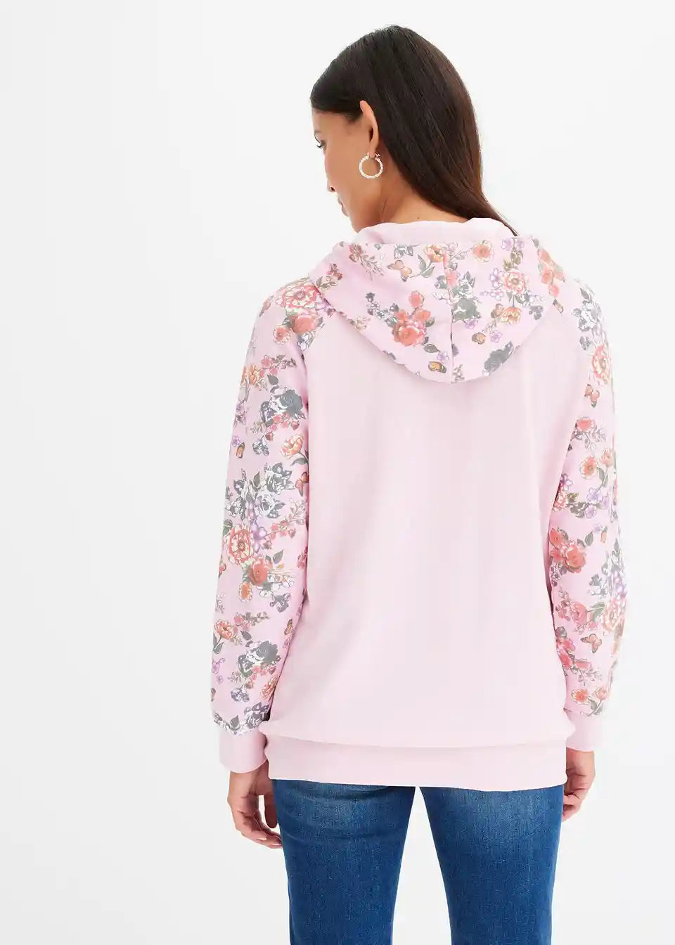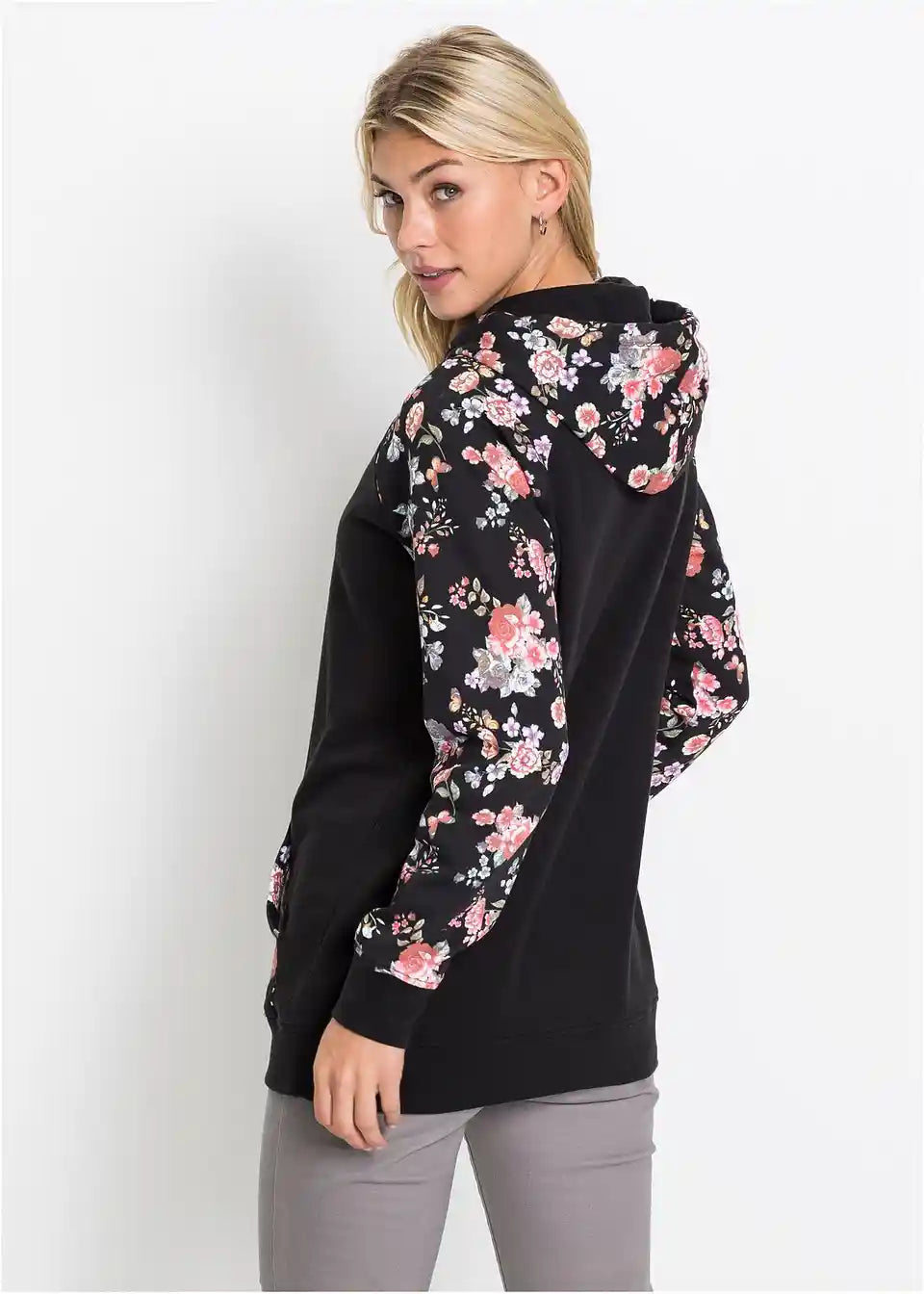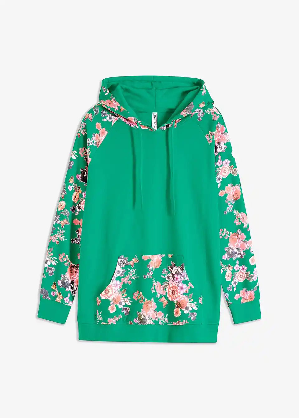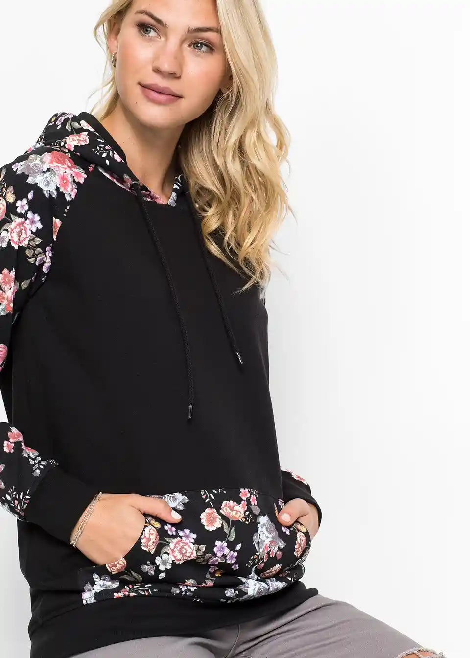 Bei diesem Hoodie fallen die Ärmel, die Kapuze und die Kängurutasche mit einem floralen Druckdesign auf. Es bildet einen angesagten Kontrast zum sportiven Charakter des Modells. Elastische Bündchen runden den Kapuzenpullover an den Enden der Raglanärmel und am Saum ab. Eine schmale Stretchhose geht mit dem Hoodie eine trendige Kombination ein. Jeans mit Destroyed-Elementen und Boots sorgen für einen lässigen Look.