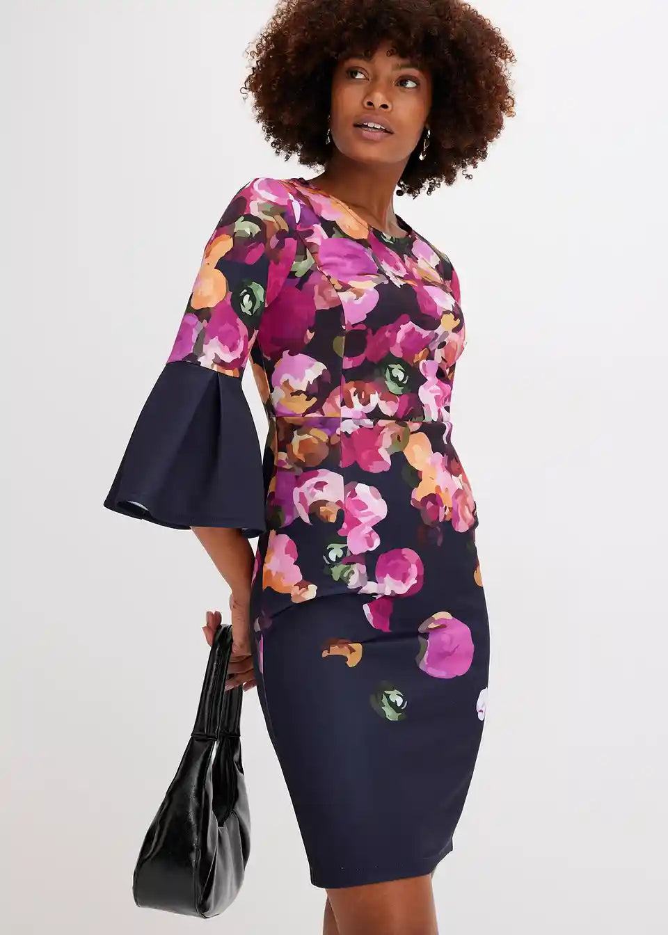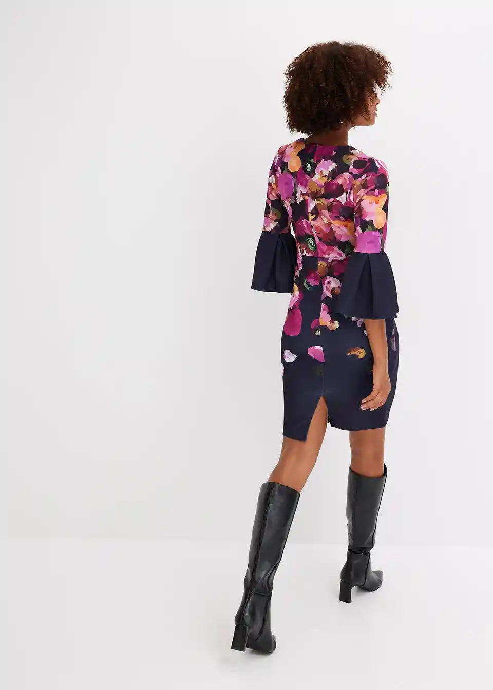 Feminines Midikleid aus fester-Scuba-Qualität mit Volant-Ärmel und platziertem Druck