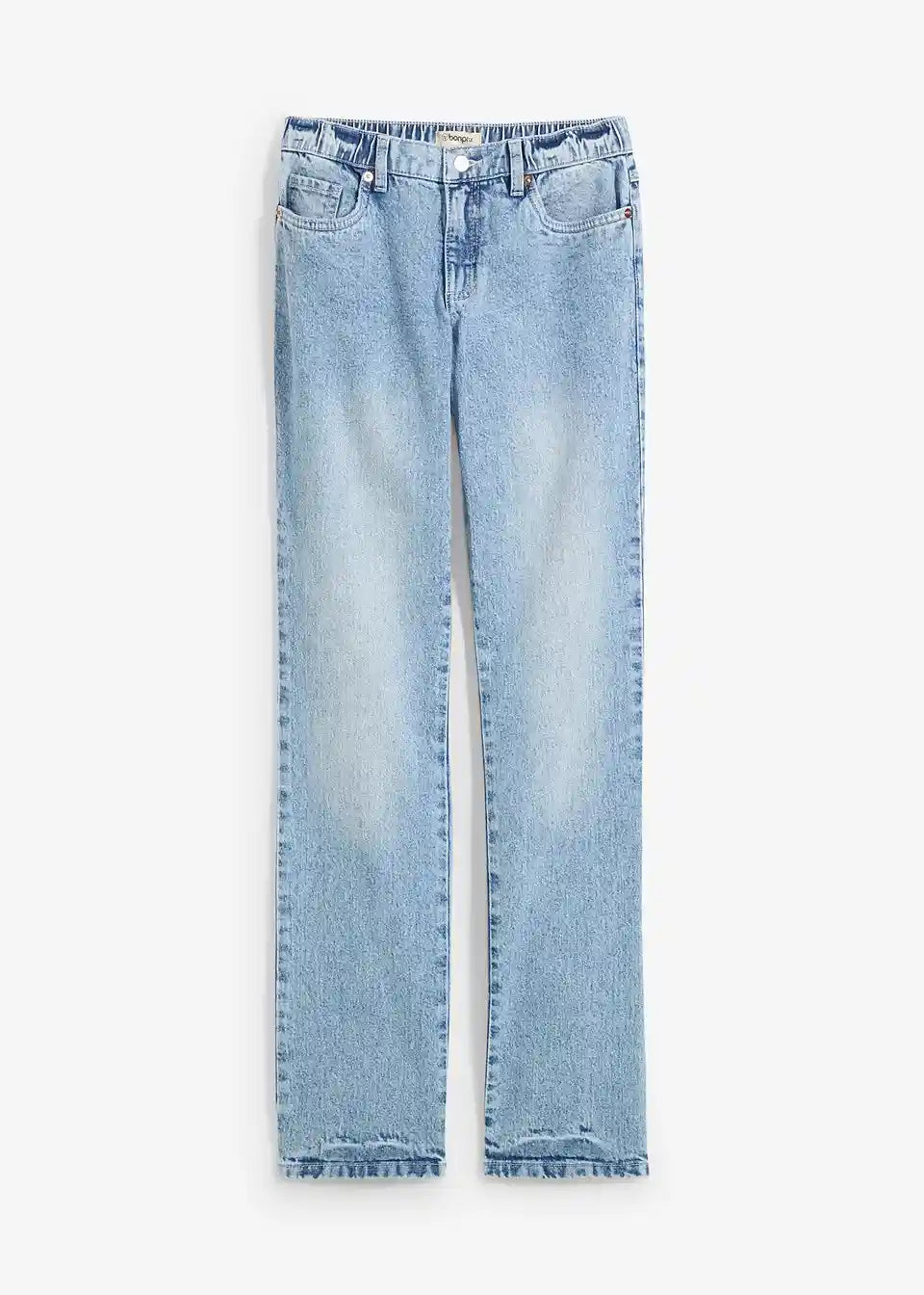 Gerade 5-Pocket-Jeans mit elastischem Bequembund aus einem festen Baumwolldenim, der sich zunächst etwas steif anfühlt und durch häufiges Tragen weicher und lockerer wird. Normale Bundhöhe mit Zip Fly und Knopf. Lange Länge, dass am Fuß ein leichter Satcking-Effekt entsteht. Innenbeinlänge in Gr. 42 ca. 84,5cm, maschinenwaschbar.