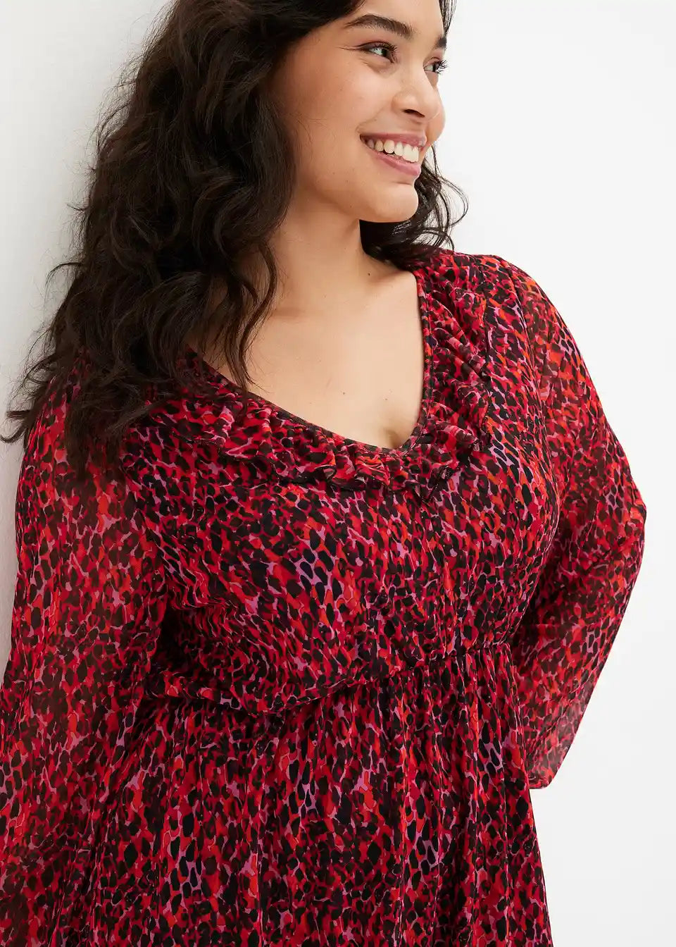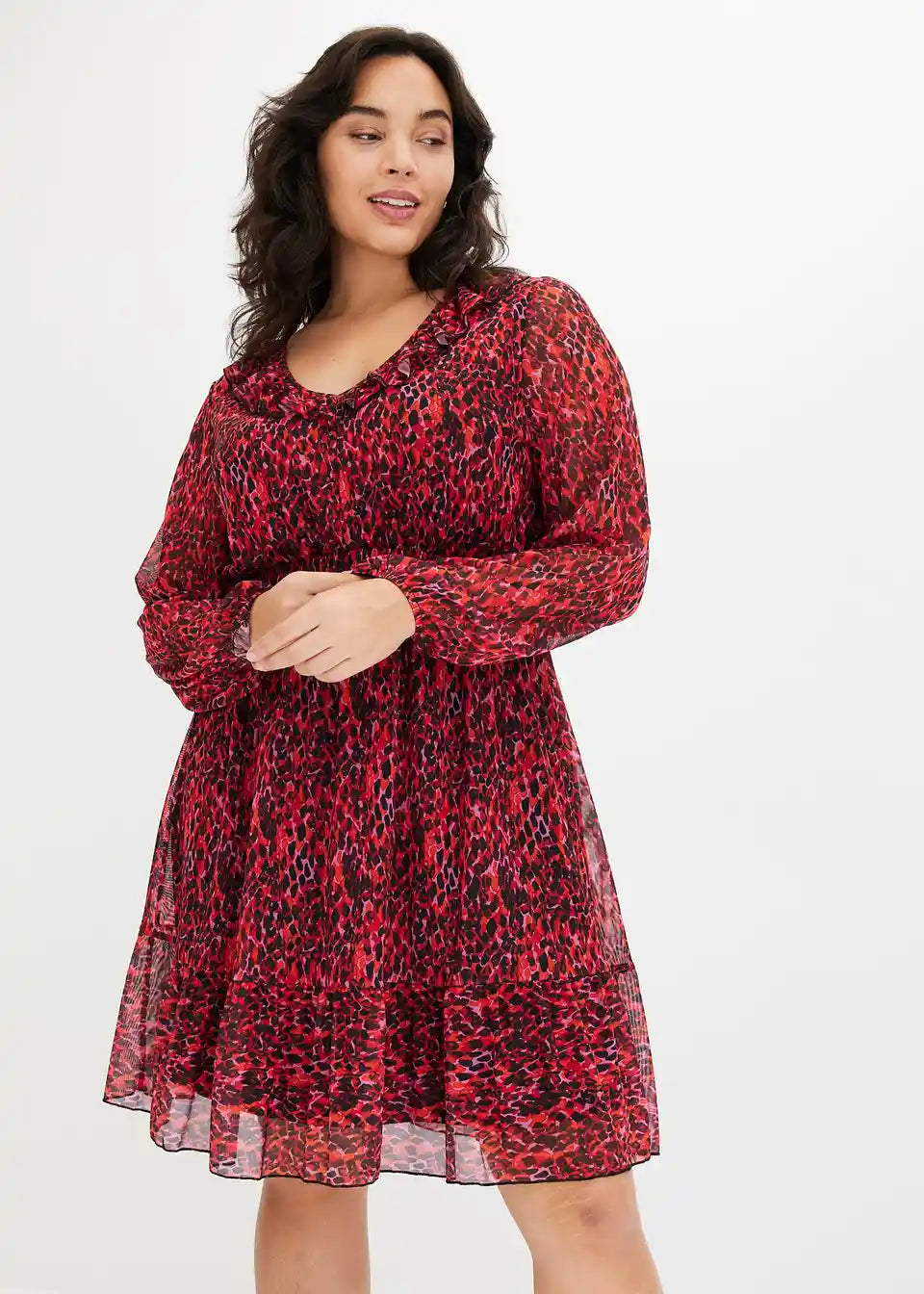 bedrucktes Mesh-Kleid mit Volants am Saum und am Ausschnitt