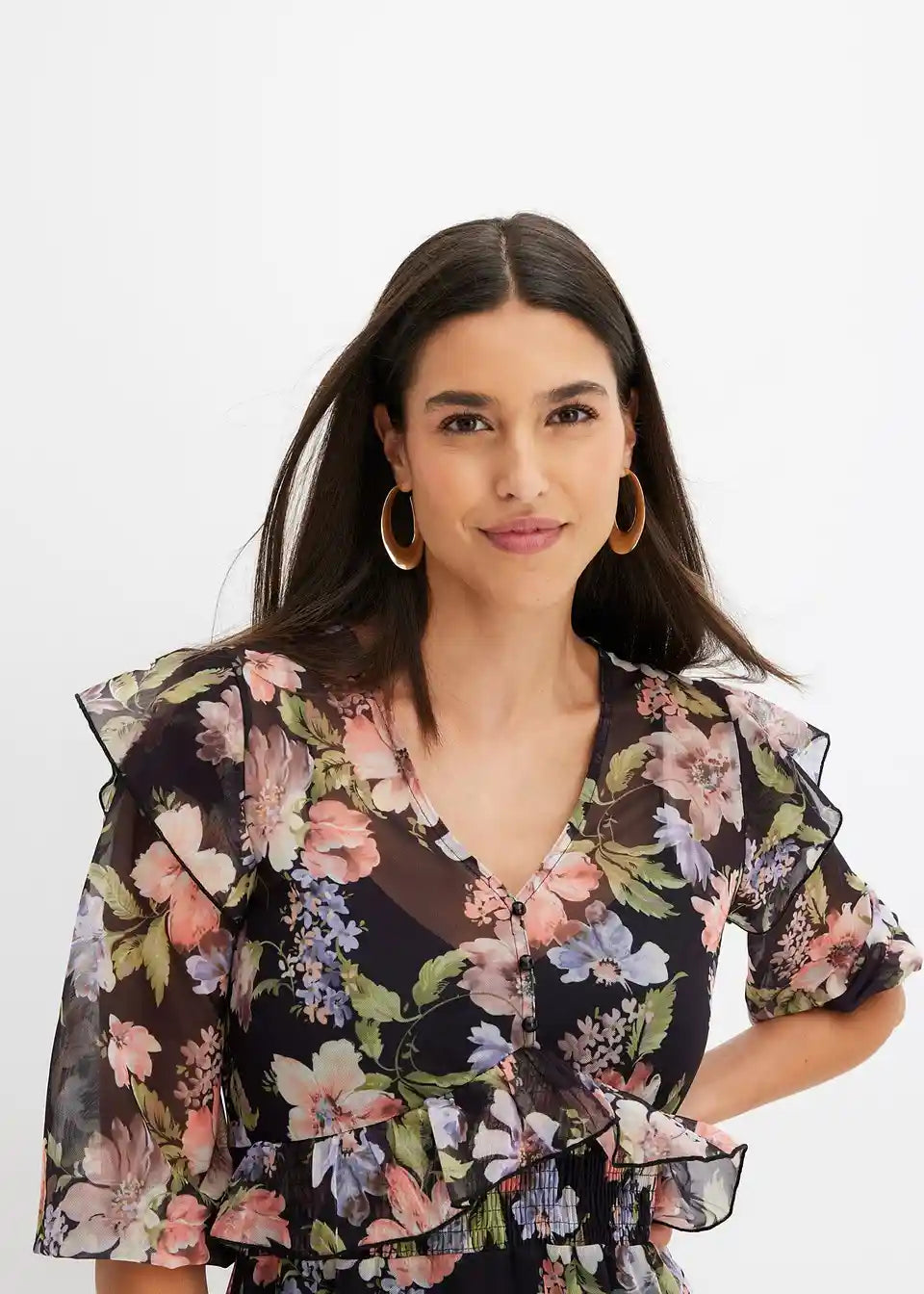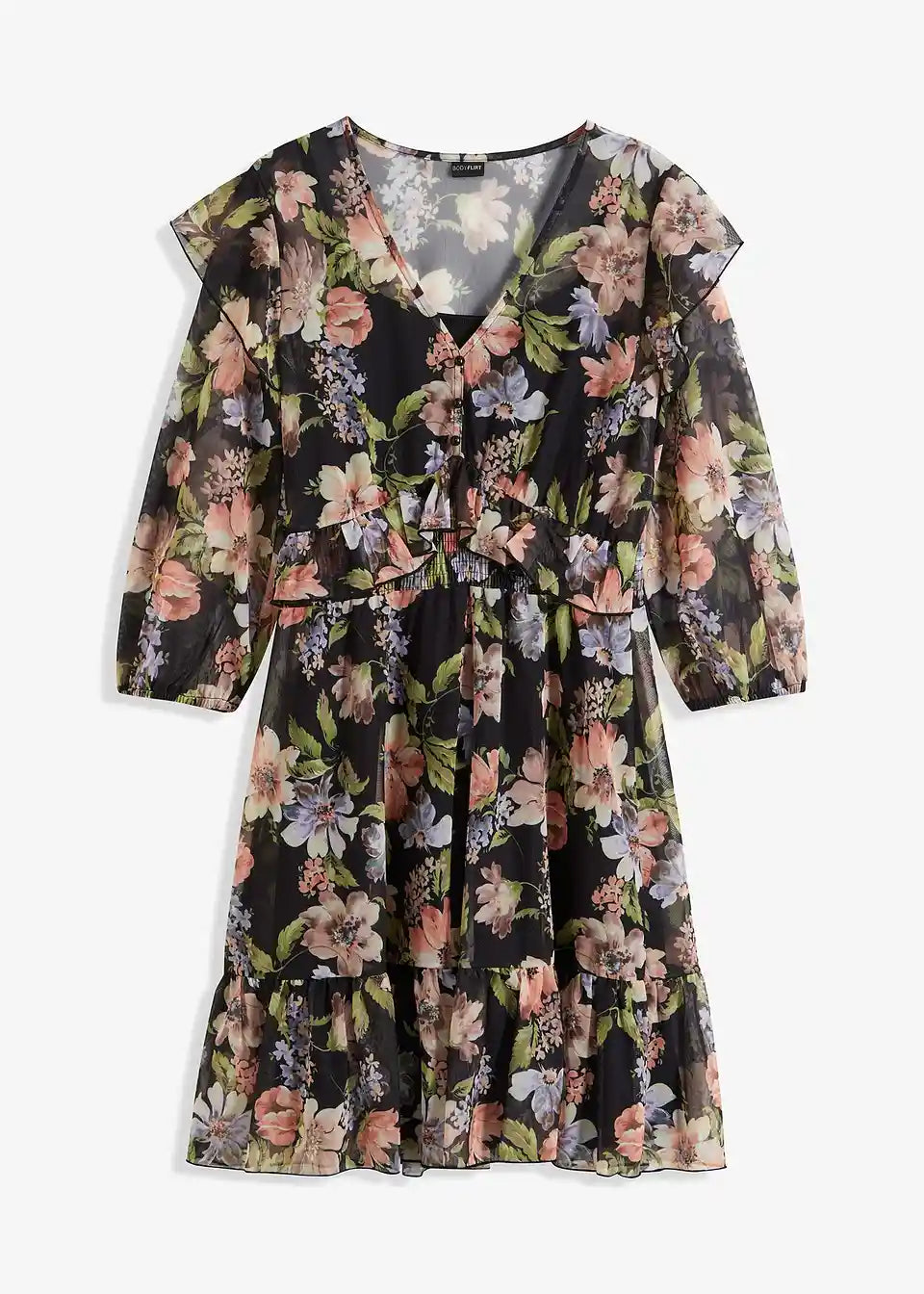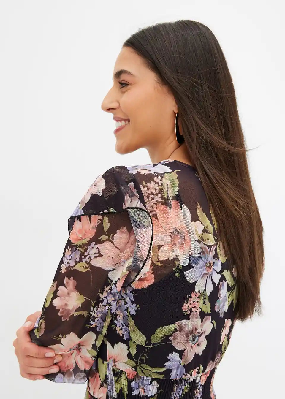 feminines Mesh-Kleid mit dekorativen Knöpfen und Volant