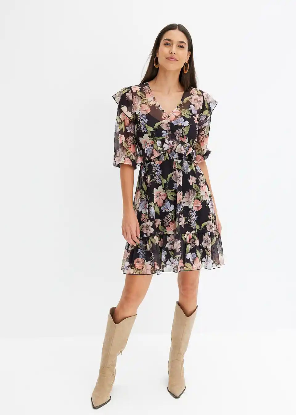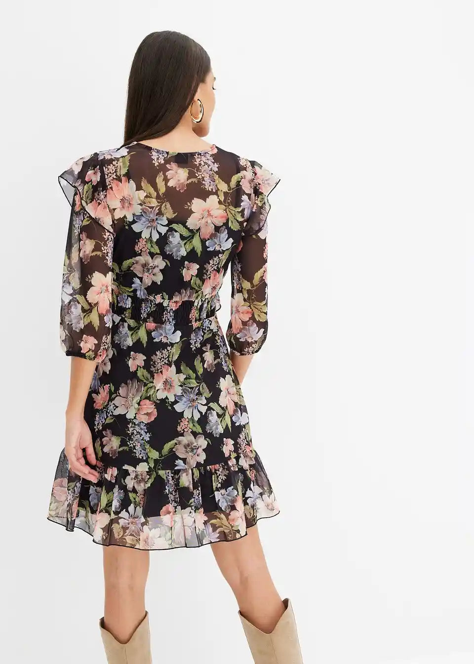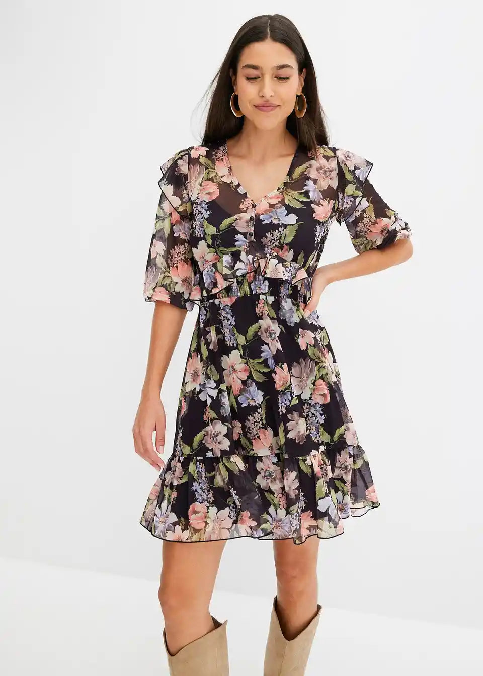 feminines Mesh-Kleid mit dekorativen Knöpfen und Volant