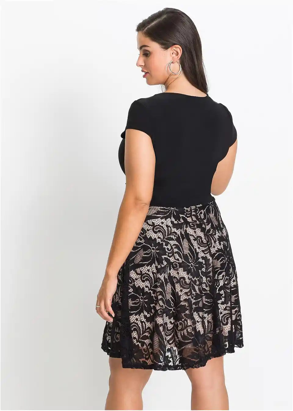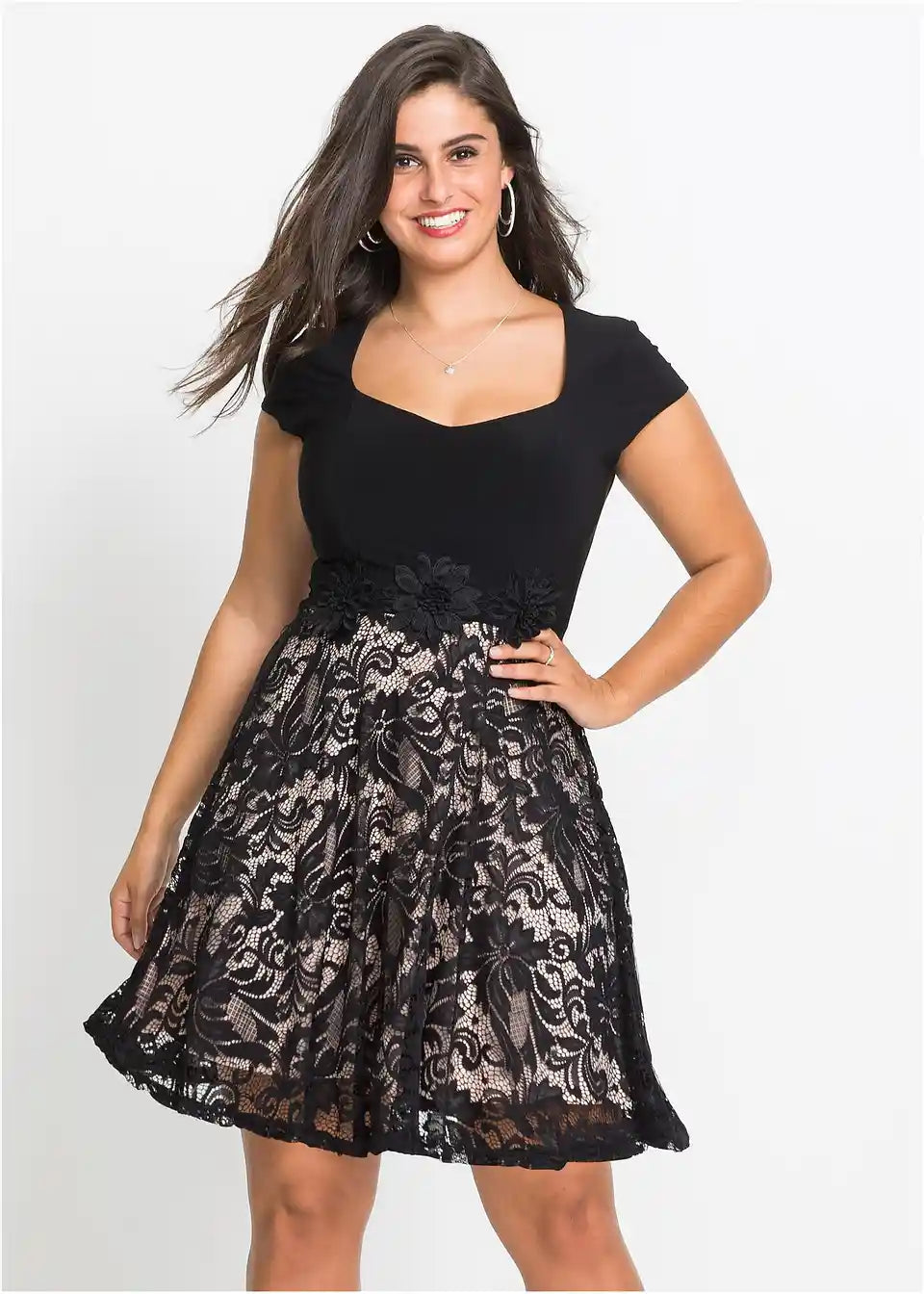 Ob Taufe, ein besonderer Geburtstag oder eine Hochzeit – mit diesem romantischen Kleid von BODYFLIRT treten Frauen selbstbewusst und stilvoll auf. Das kurze Kleid in vorteilhafter A-Linie verzaubert mit einem körperbetonten Oberteil und einem tiefen, herzförmigen Ausschnitt. Der leicht ausstehende Rockteil ist komplett aus edler floraler Spitze gearbeitet. In der Taille ziehen drei große Blüten-Applikationen die Blicke auf sich. Das auffallende Kleid mit Spitze wirkt am besten zu eleganten High Heels.