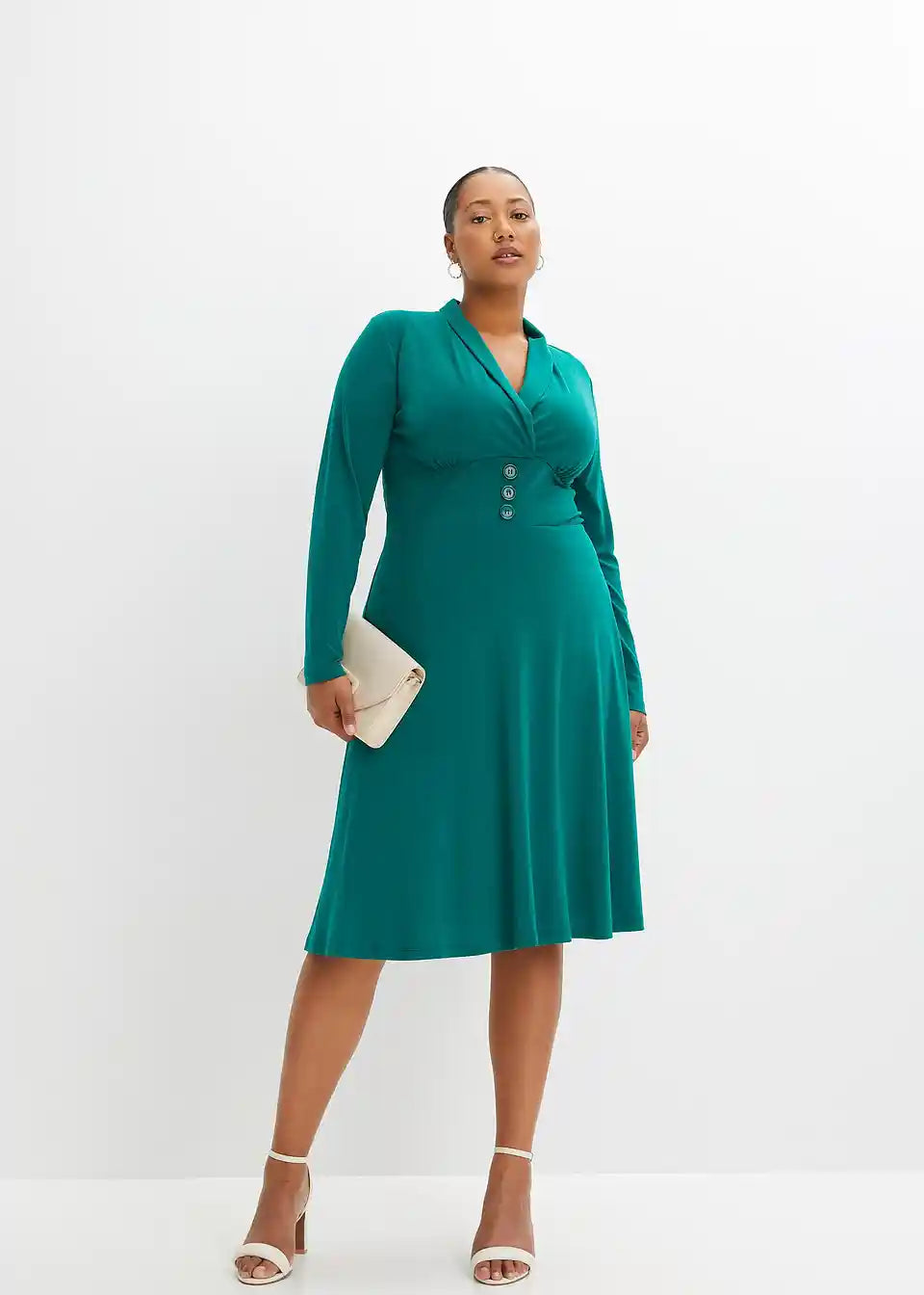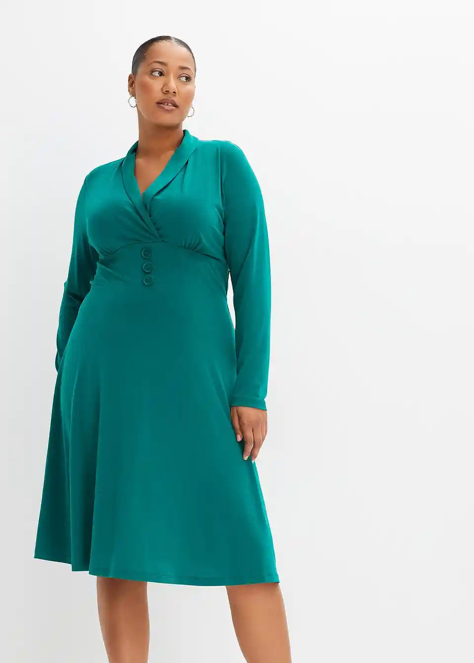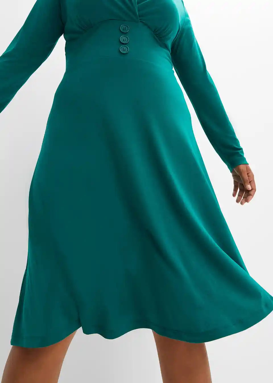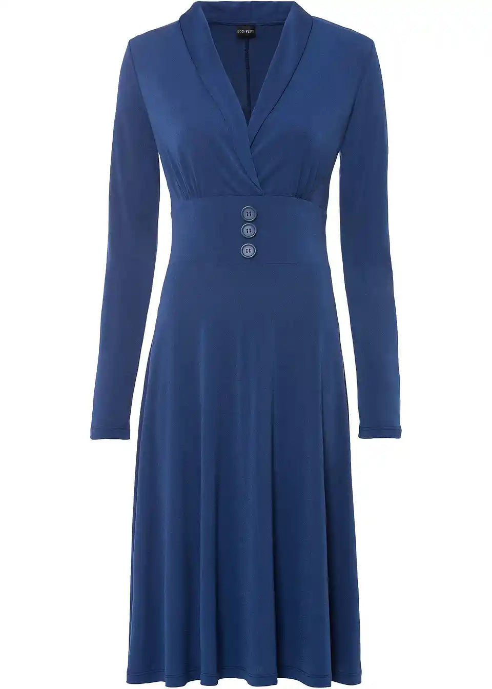 Modisches Jerseykleid mit Knöpfen verziert, das Kleid besitzt einen auffallenden Schal-Kragen.