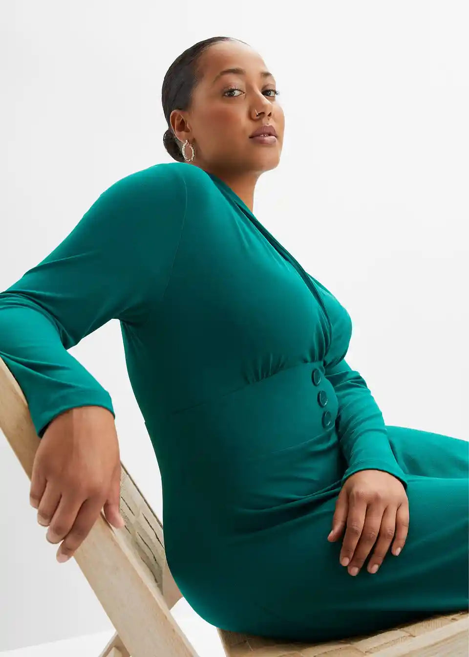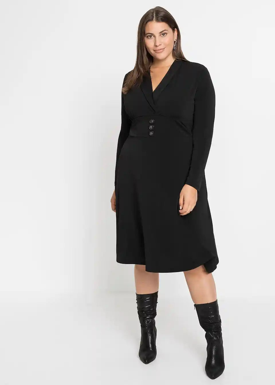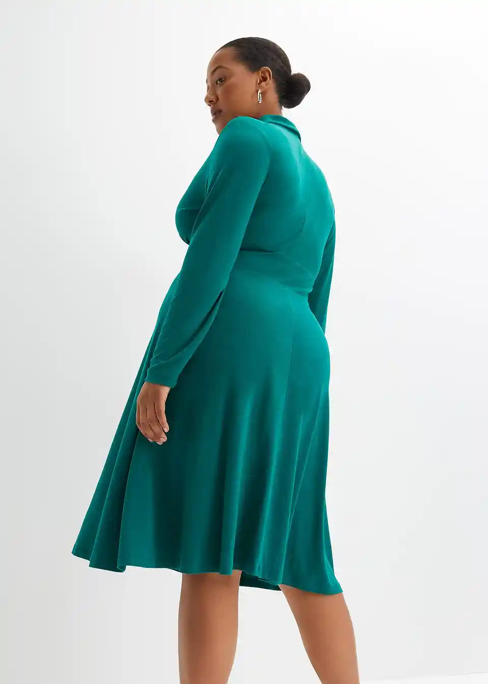 Modisches Jerseykleid mit Knöpfen verziert, das Kleid besitzt einen auffallenden Schal-Kragen.