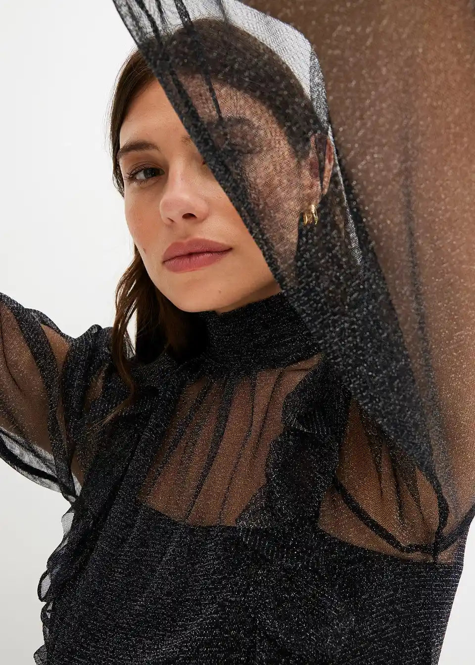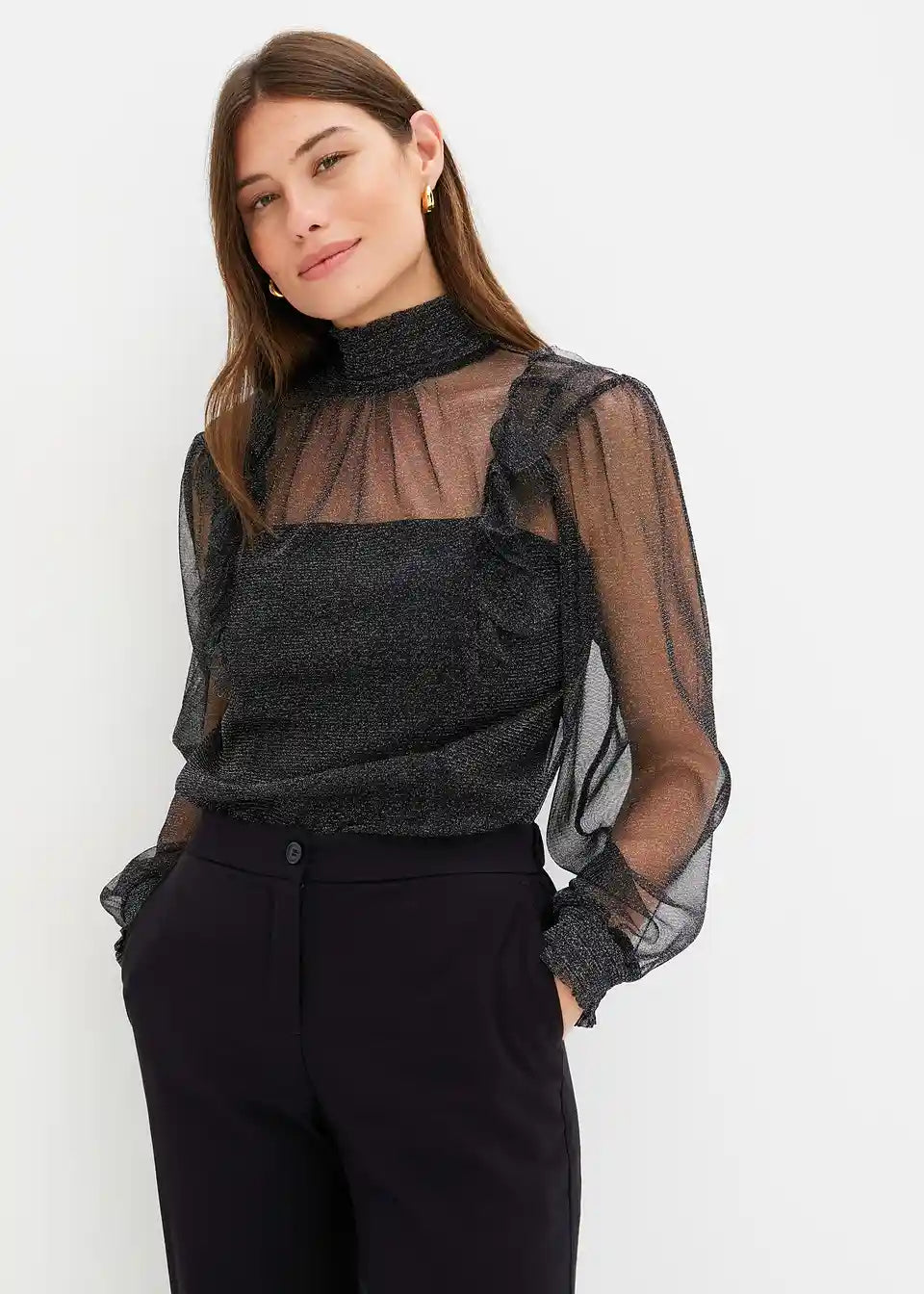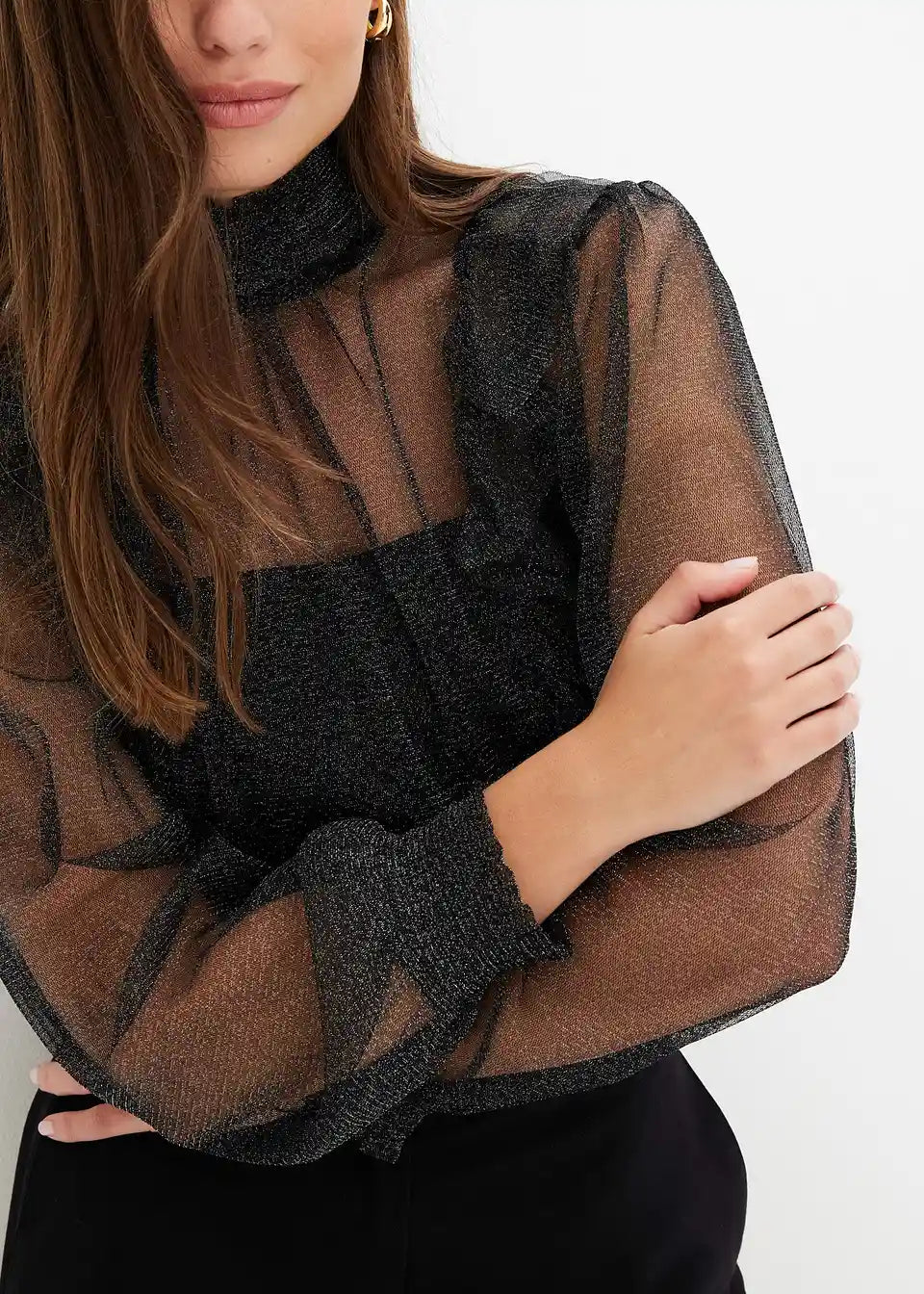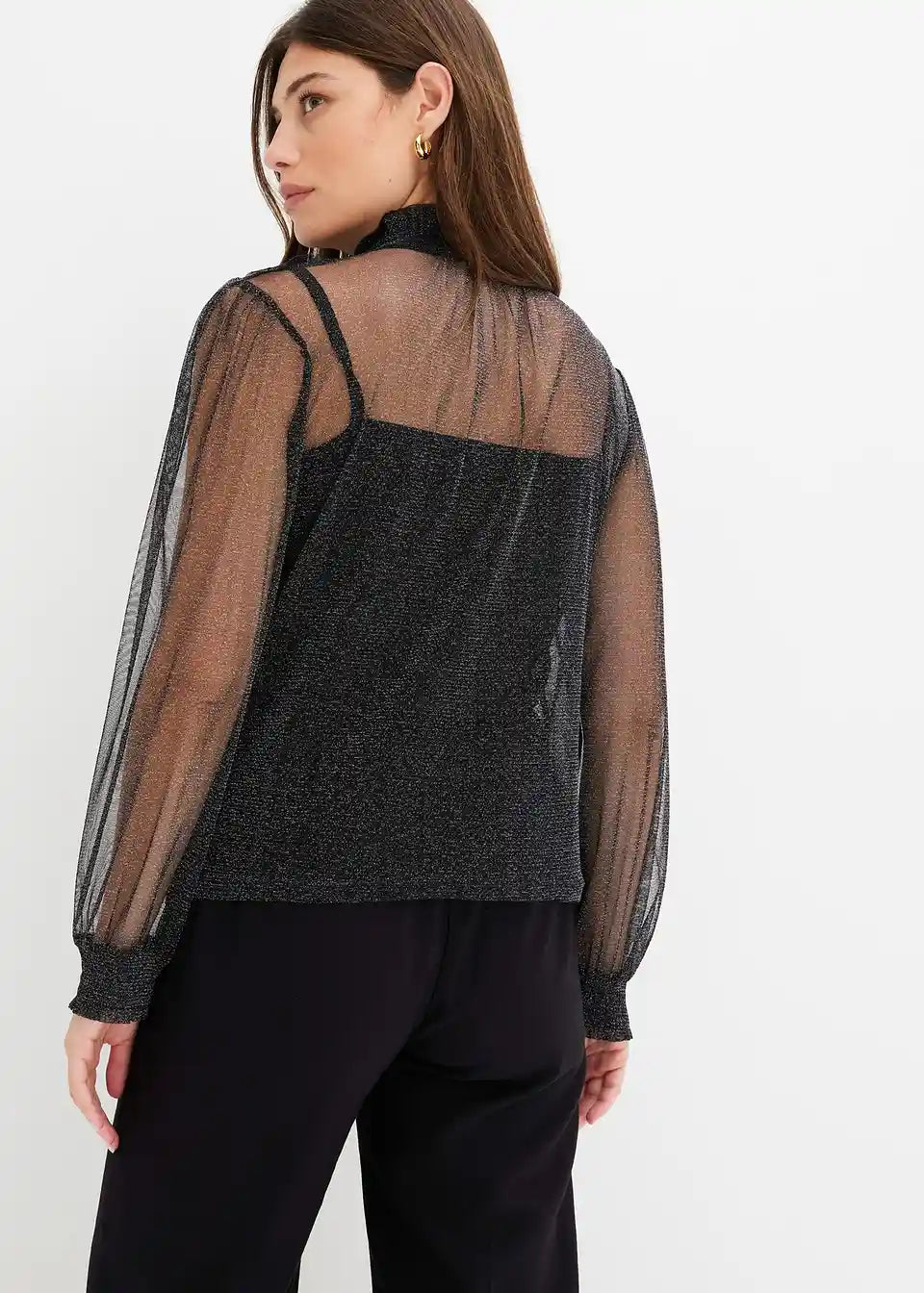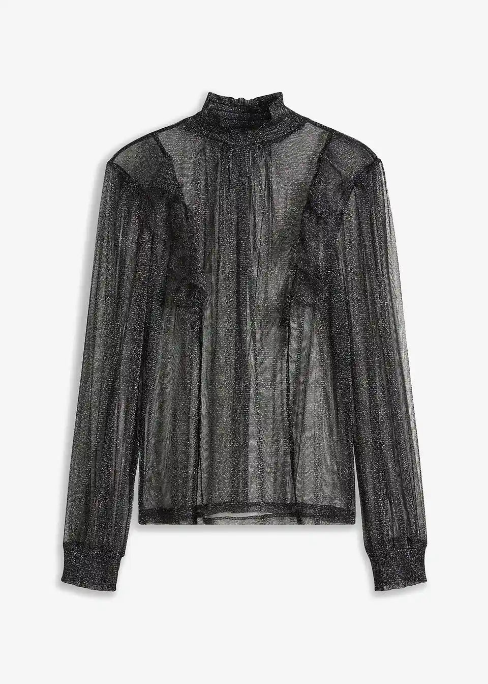 Modernes Blusenshirt aus Glitzer-Mesh mit Ballonärmeln