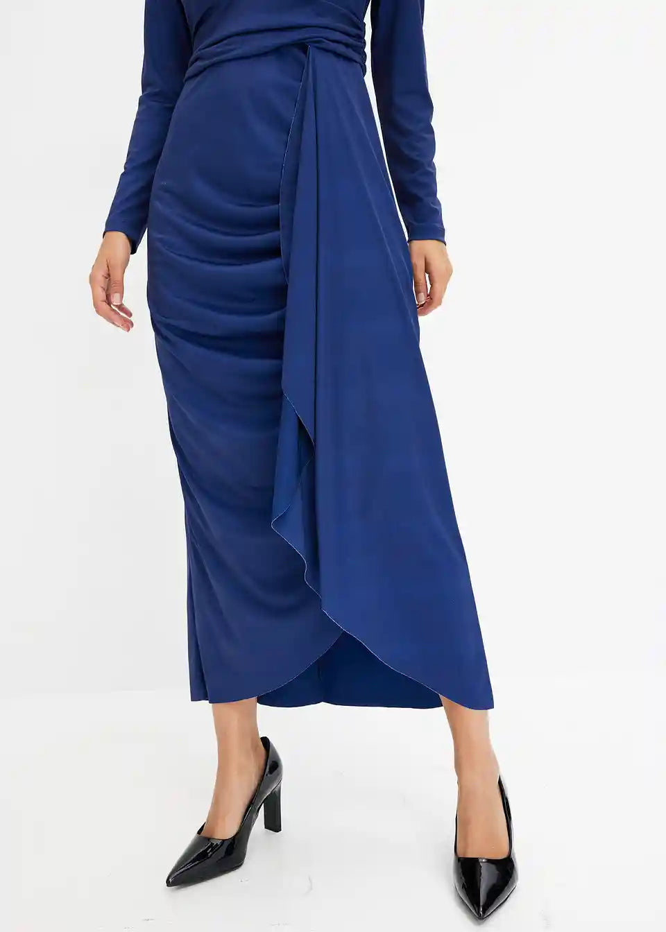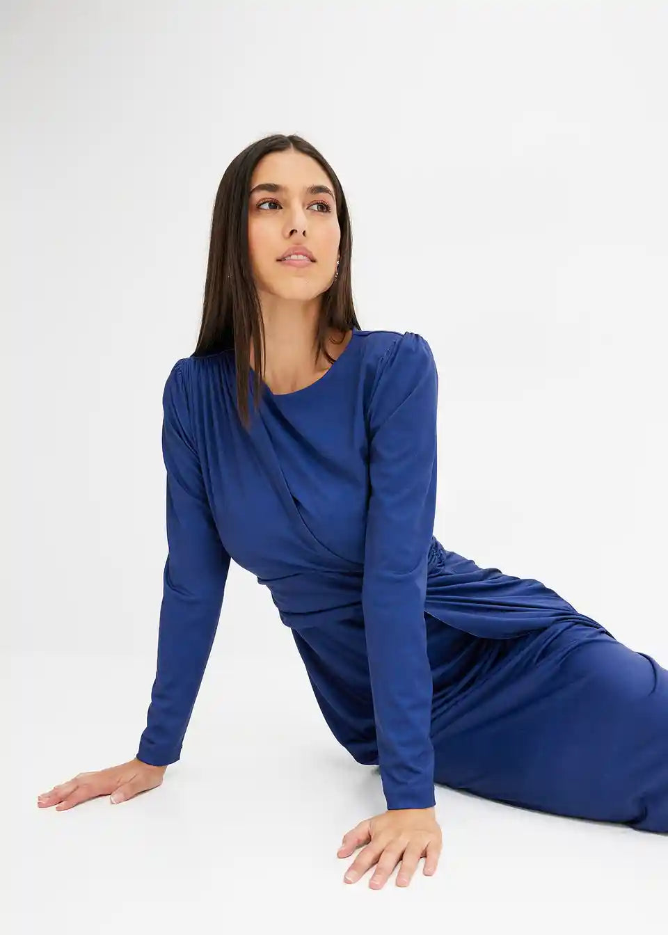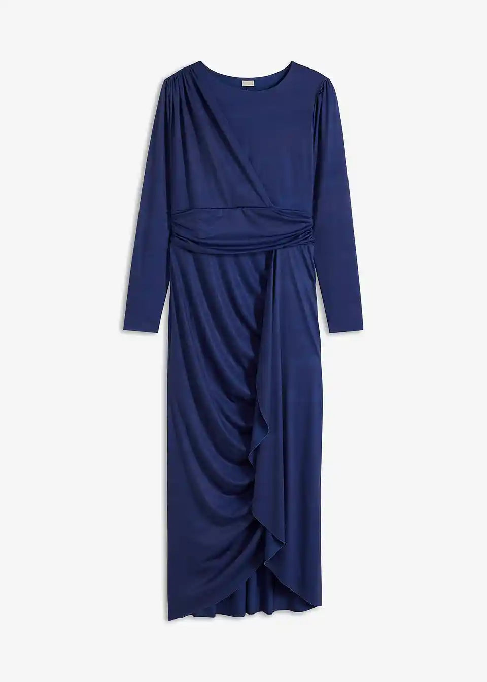 Modern und feminin: Jerseykleid in Midi-Länge mit Raffungen und Volant am Rock sowie einem gerafften Einsatz in der Taille