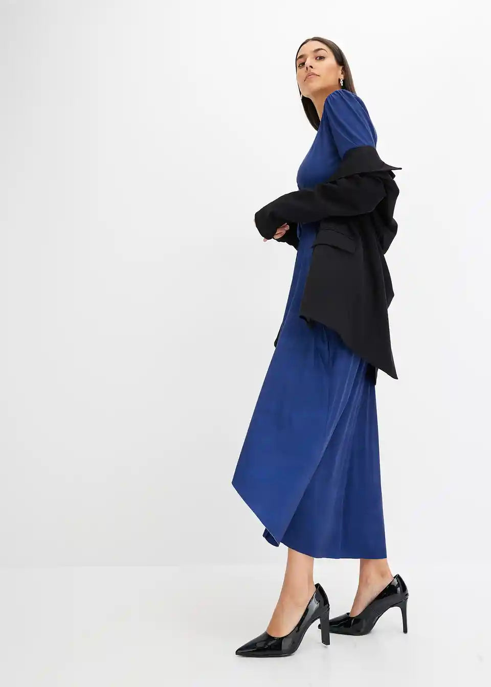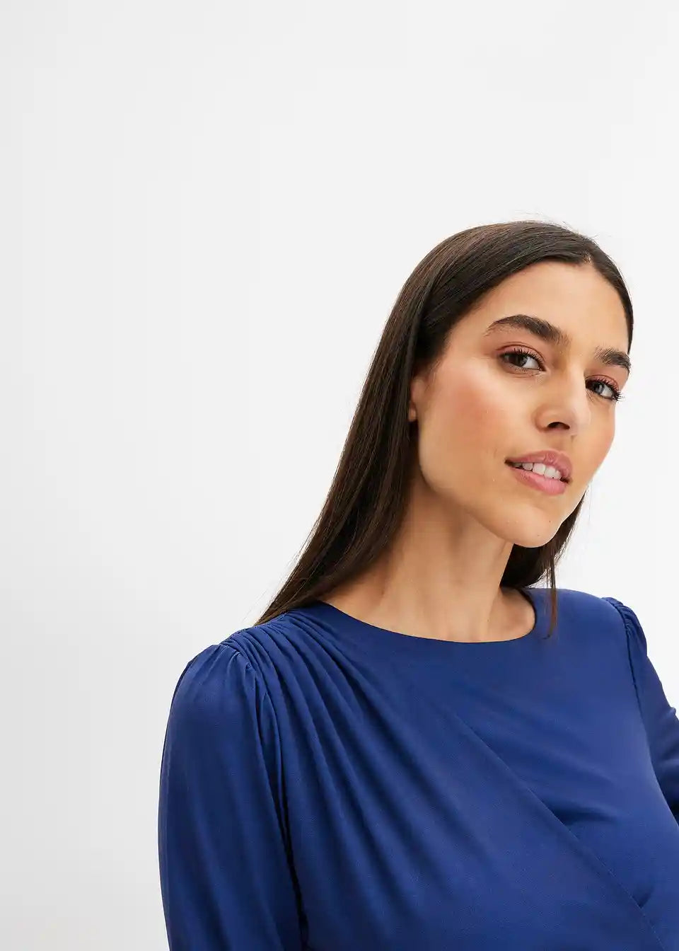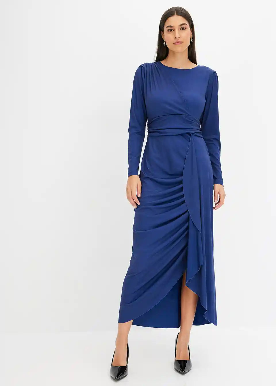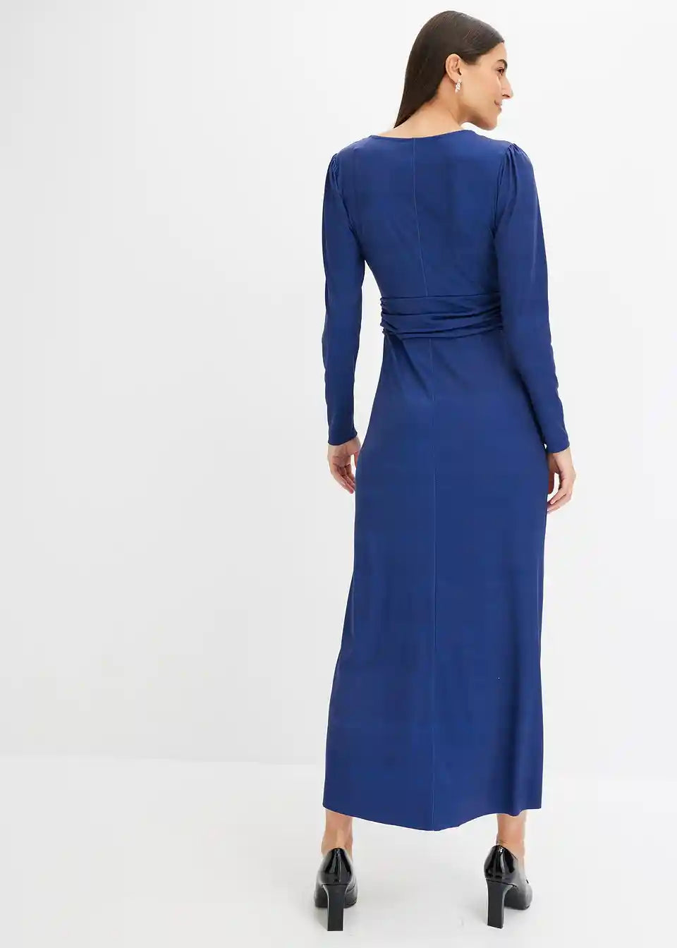 Modern und feminin: Jerseykleid in Midi-Länge mit Raffungen und Volant am Rock sowie einem gerafften Einsatz in der Taille