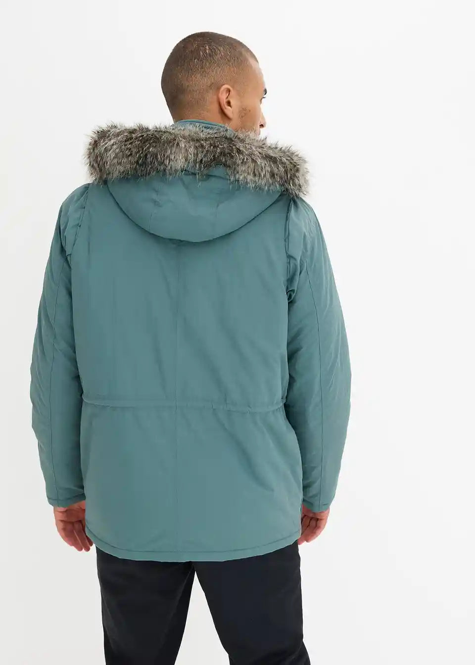 Gut durch die kalte Jahreszeit kommen Männer mit dieser coolen Herren Jacke von bpc. Der sportliche Parka im Regular Fit ist wattiert und punktet mit zahlreichen Taschen: Zwei aufgesetzte Taschen mit Patten und zwei seitliche Eingrifftaschen mit Zipper. Die Kapuze ist am Rand mit weichem Fellimitat besetzt. Am Ärmel sorgt ein kleines Badge für Aufsehen.Der wattierte Parka Regular Fit wird mit einem versteckten Reißverschluss und zusätzlichen Druckknöpfen geschlossen.