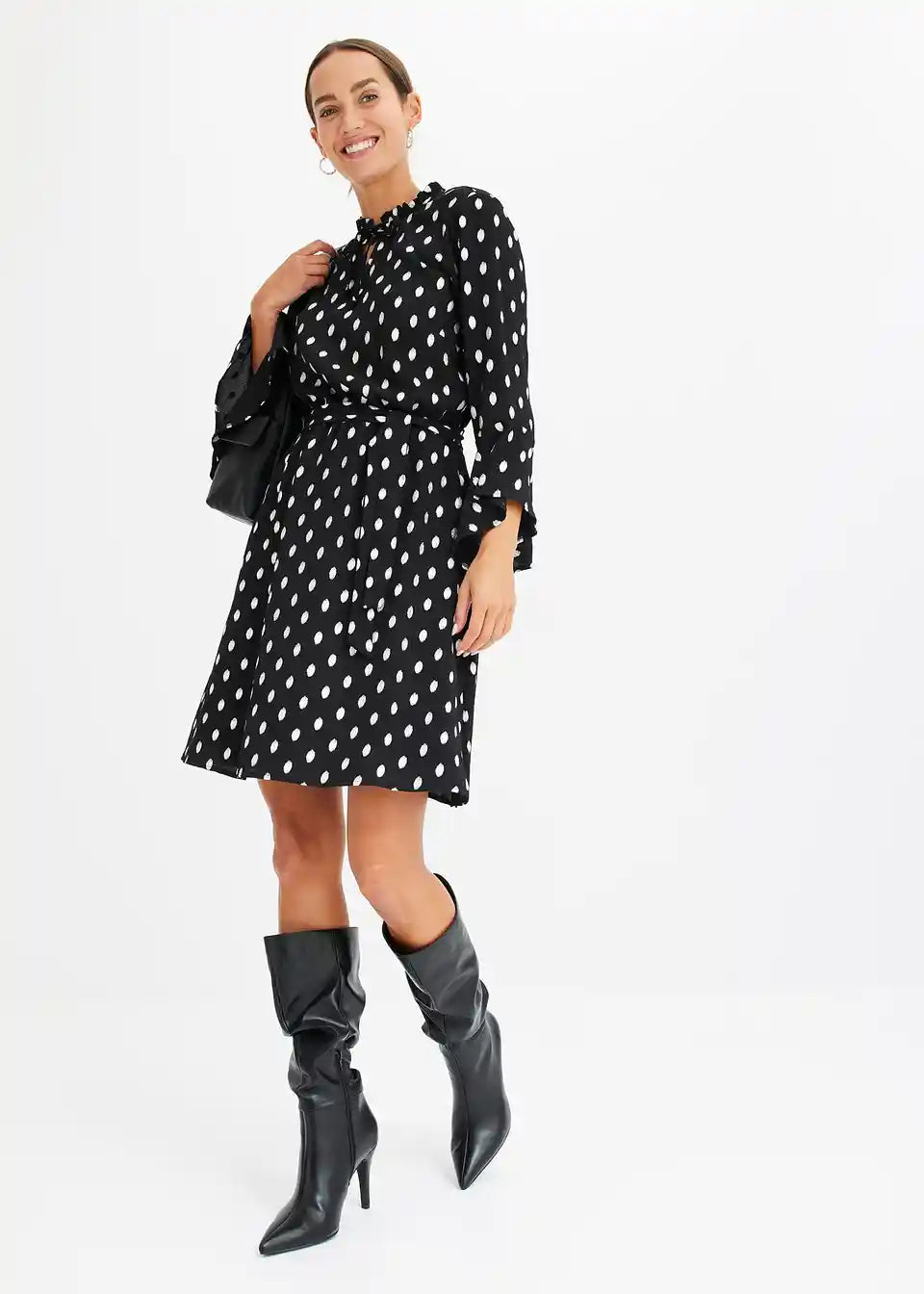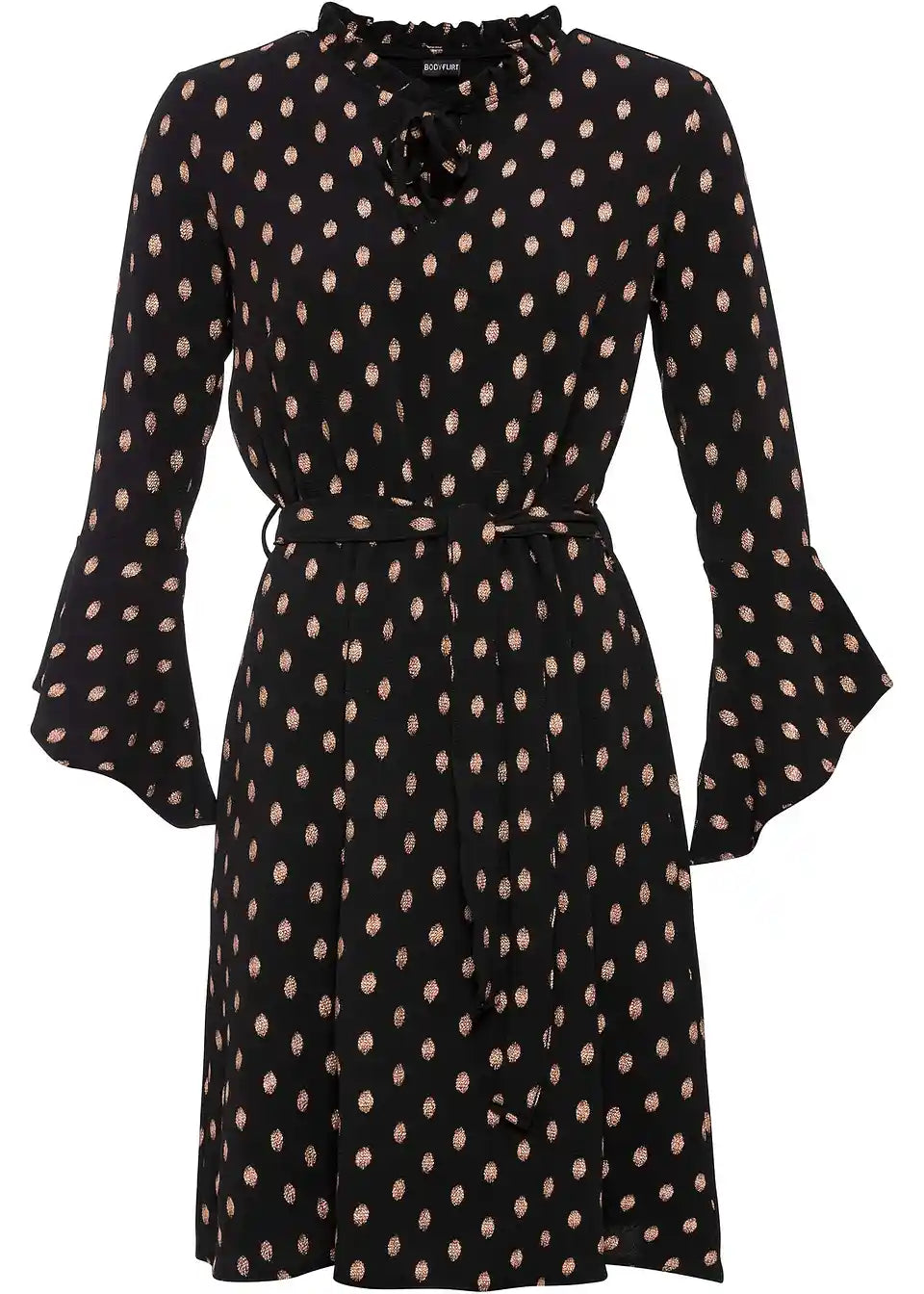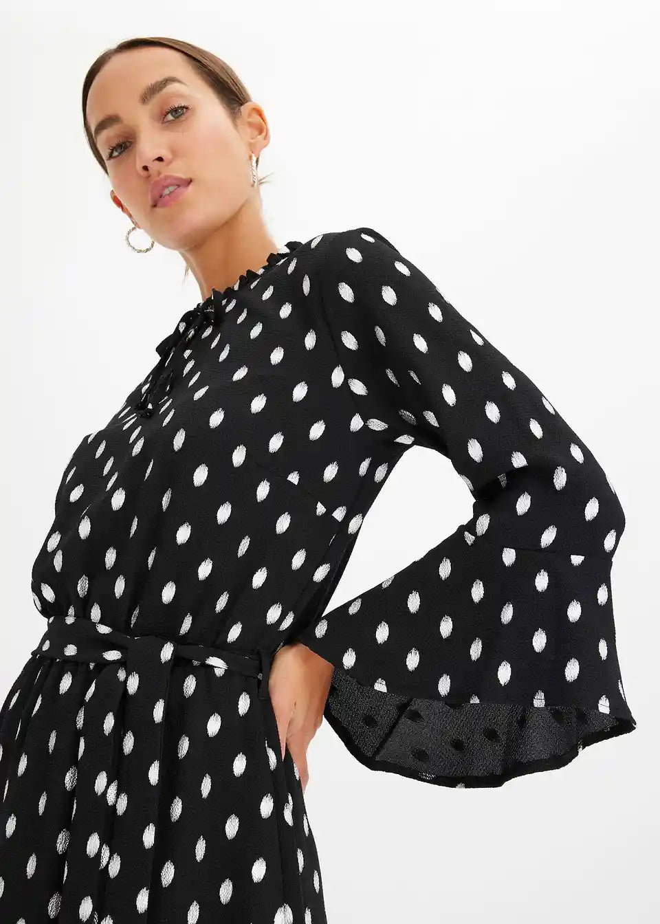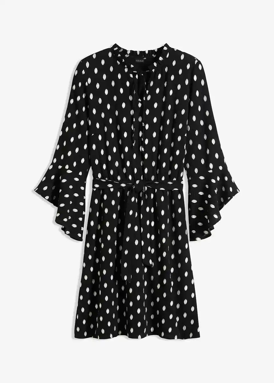 Modisches Kleid mit Bindeband und Trompetenärmeln. Der kleine Stehkragen hat ein Bindeband am Halsausschnitt. Tolle Passform durch Gummiband in der Taille. Schönes, elastisches Material in Crepeoptic. Länge 94cm in Gr. 38.