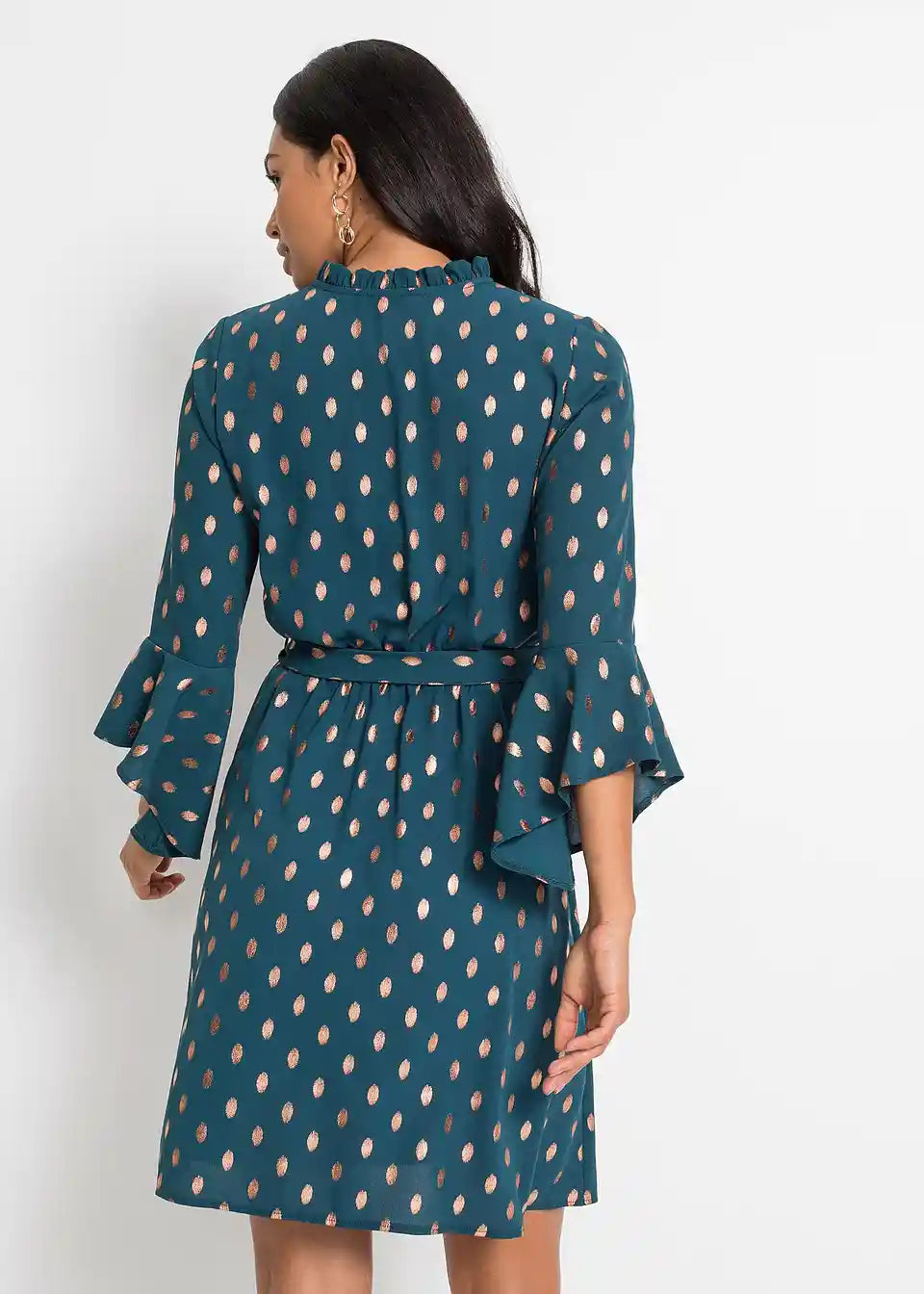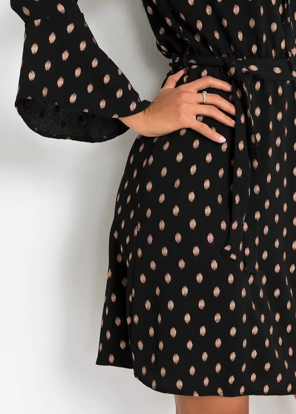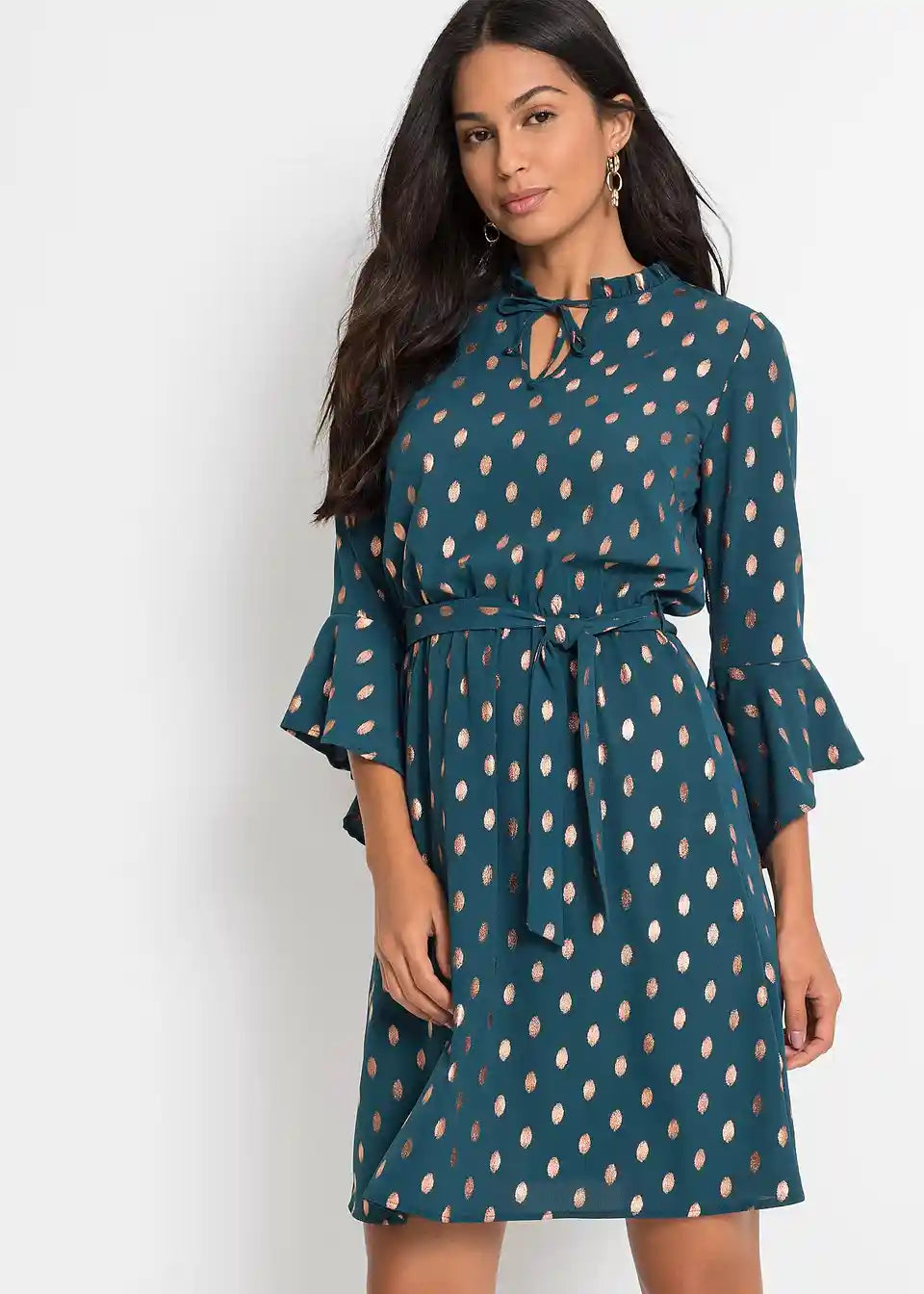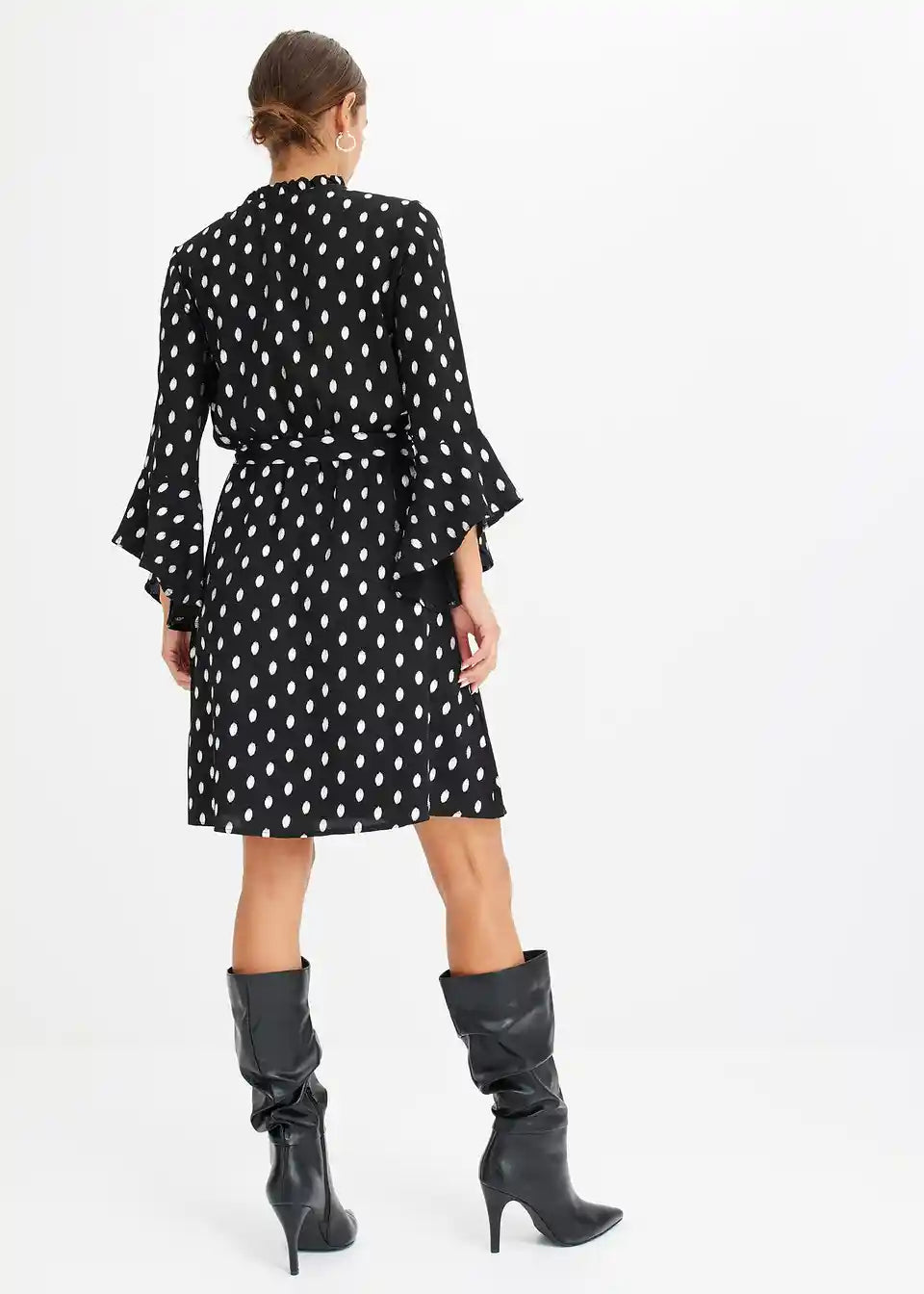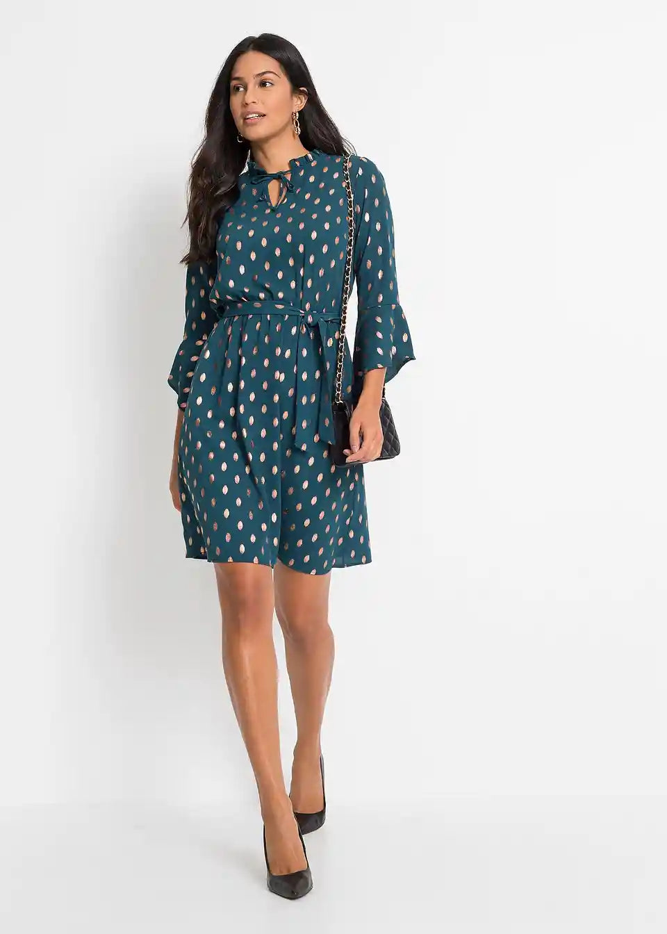 Modisches Kleid mit Bindeband und Trompetenärmeln. Der kleine Stehkragen hat ein Bindeband am Halsausschnitt. Tolle Passform durch Gummiband in der Taille. Schönes, elastisches Material in Crepeoptic. Länge 94cm in Gr. 38.