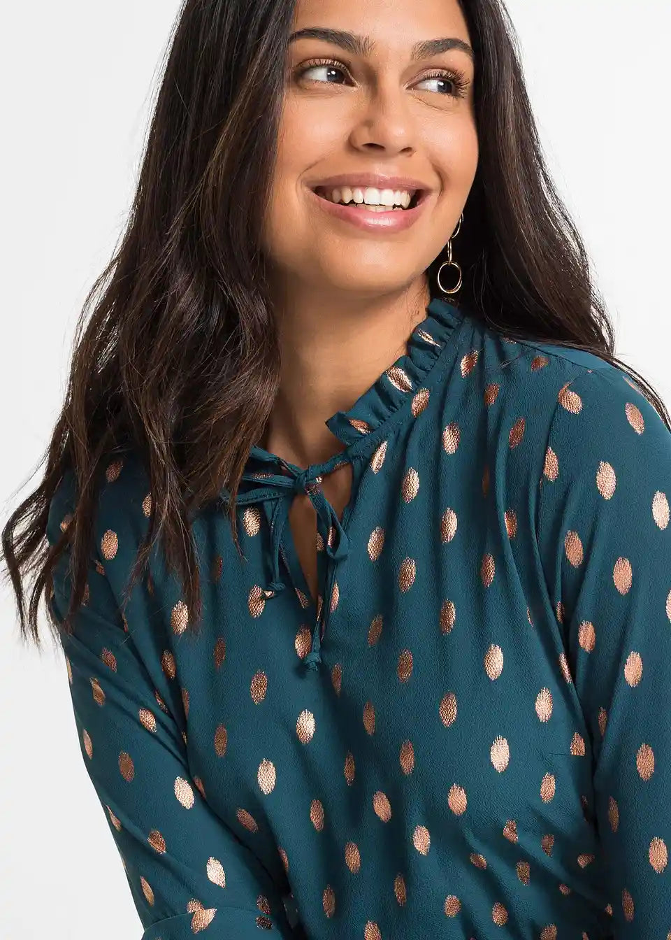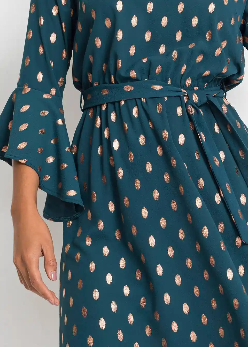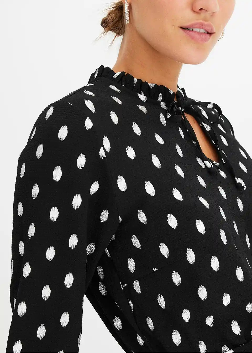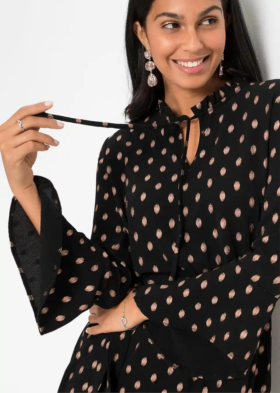 Modisches Kleid mit Bindeband und Trompetenärmeln. Der kleine Stehkragen hat ein Bindeband am Halsausschnitt. Tolle Passform durch Gummiband in der Taille. Schönes, elastisches Material in Crepeoptic. Länge 94cm in Gr. 38.